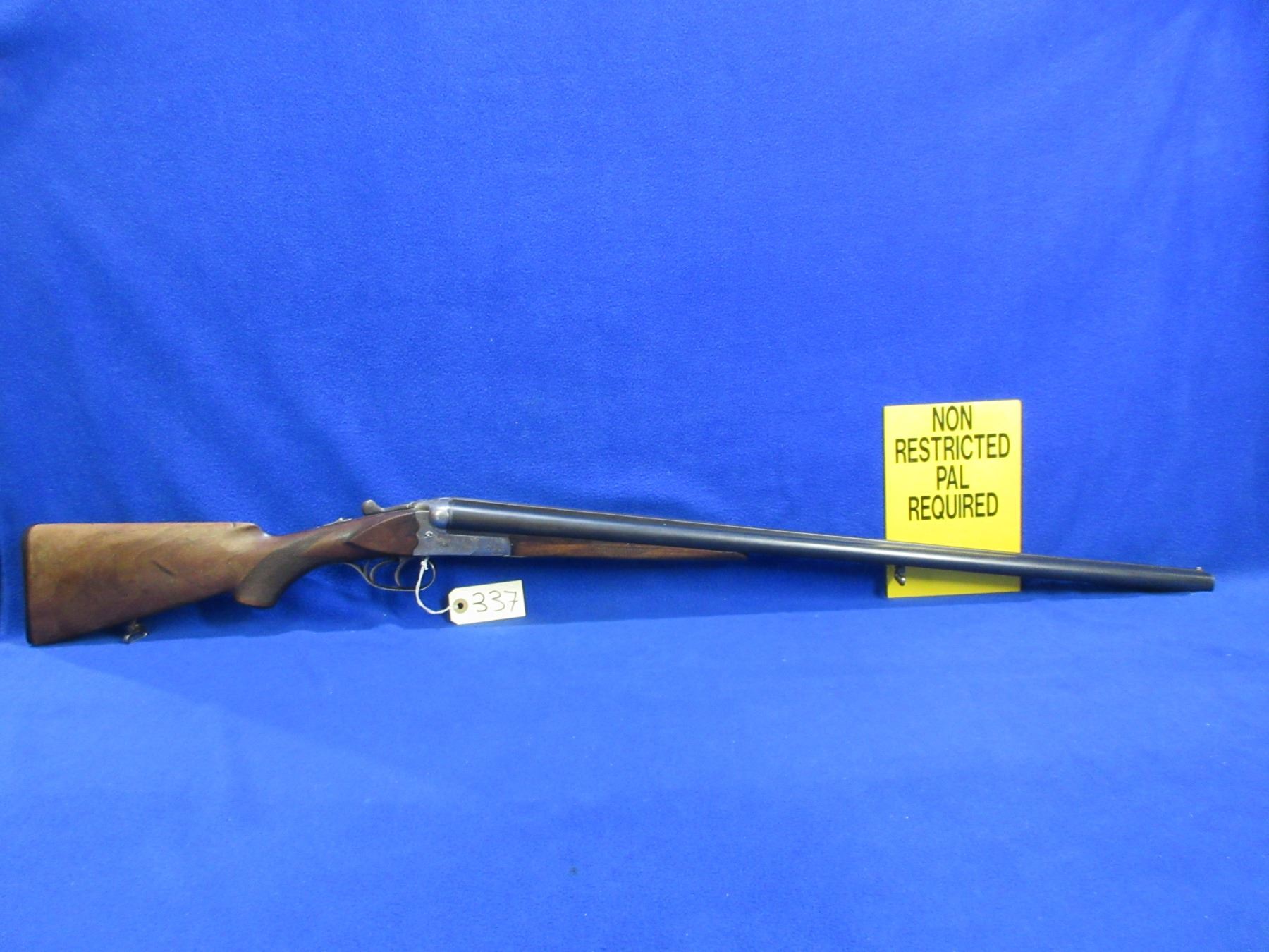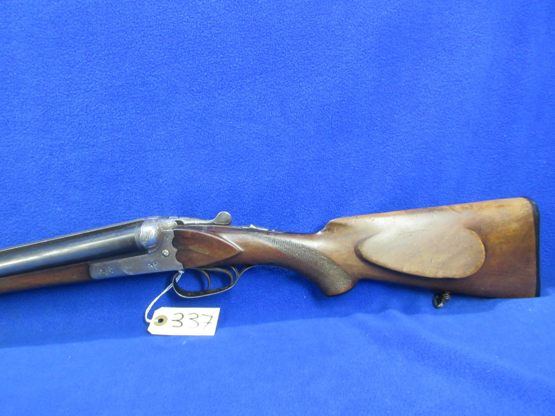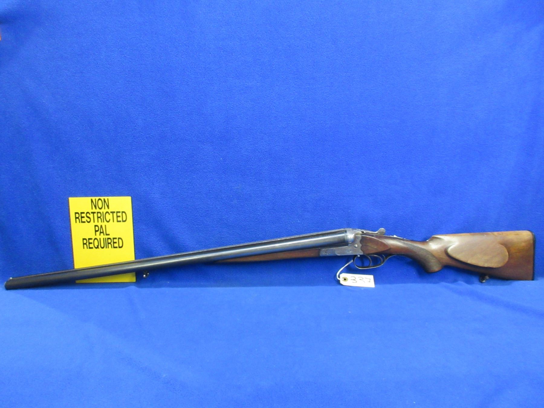 Non-Restricted - Sauer & Sohn SXS in 16 Ga. 2 3/4" - This is a tip up SXS shotgun, action is tight and appears to be in good to very good working order. Barrels are 28", bores are good, bluing is good, has bead front sight, stock has a chip on the toe and has hairline cracks on both sides behind the action, forearm is good usage marks, length of pull is 13 3/4", butt plate has a chip on the toe, comes with swivels. Ser # 235023