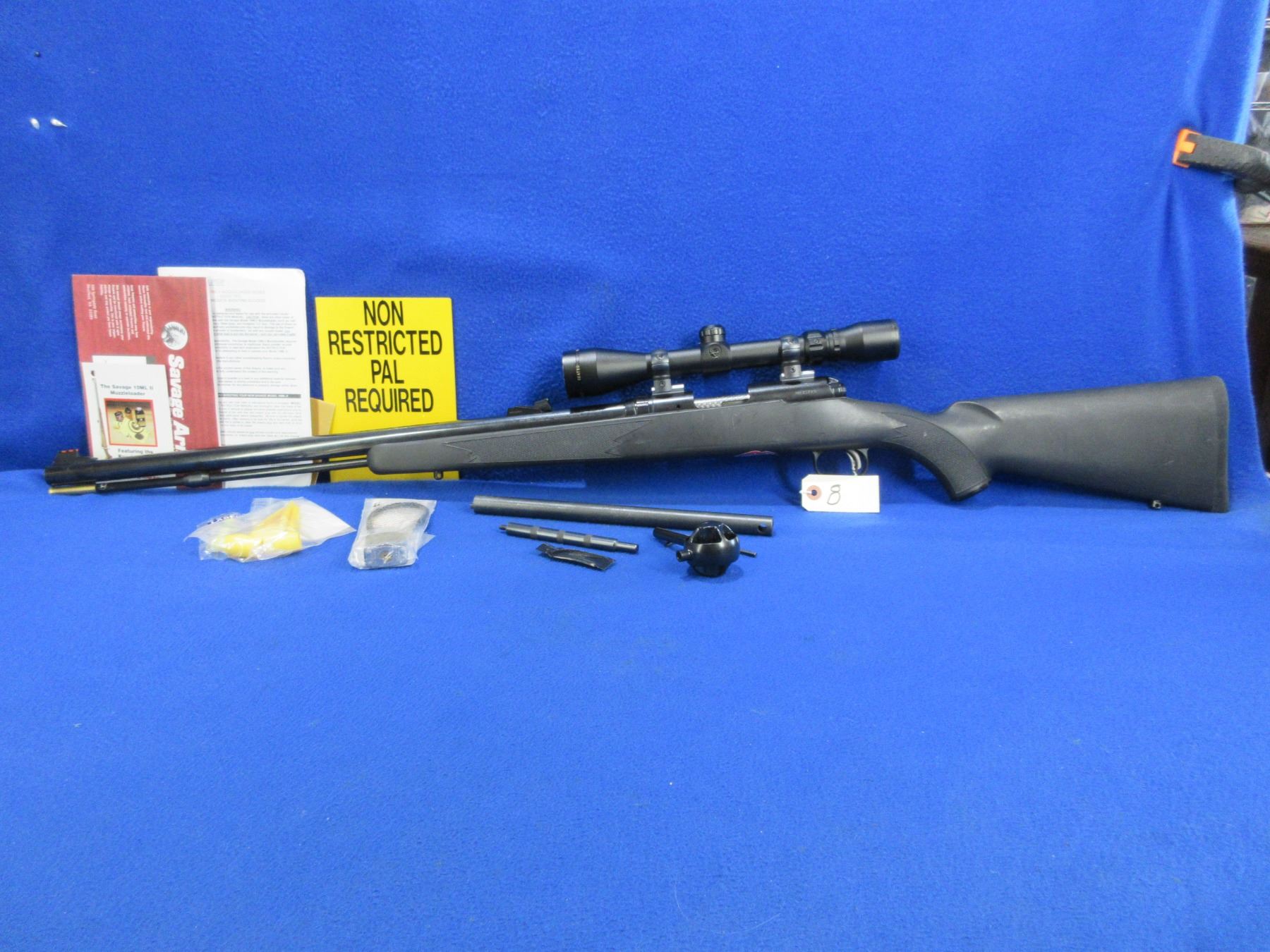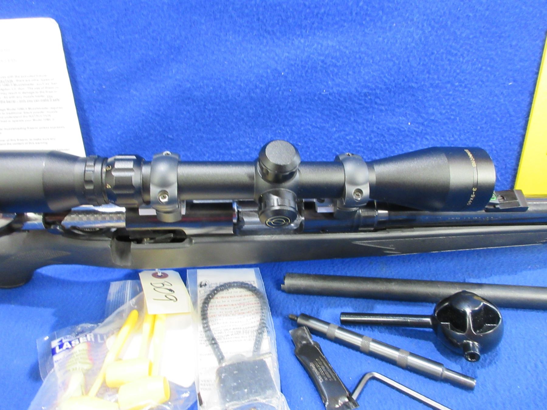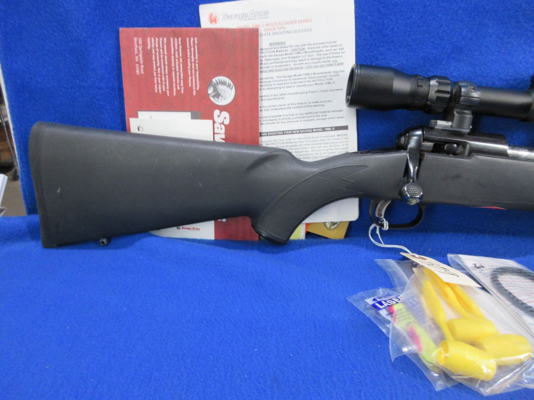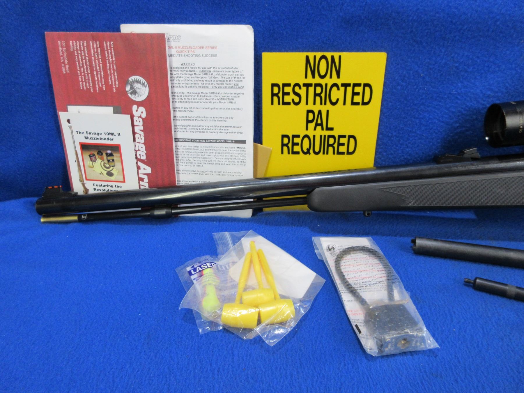 Non-Restricted - Savage Model 10ML-11 in 50 Cal. - This muzzleloading in-line bolt action rifle appears to be in very good working order. Barrel is 24", rifling appears good to very good, bluing is good to very good, has fiber optic sights and a Simmons 3-9x40 scope - appears clear, duplex crosshair, synthetic stock is good to very good with usage marks, rubber butt pad good. Comes with original paperwork, cable lock, powder measures, ball starter, wrench handle, breech plug wrench, ram rod. Ser #M042861