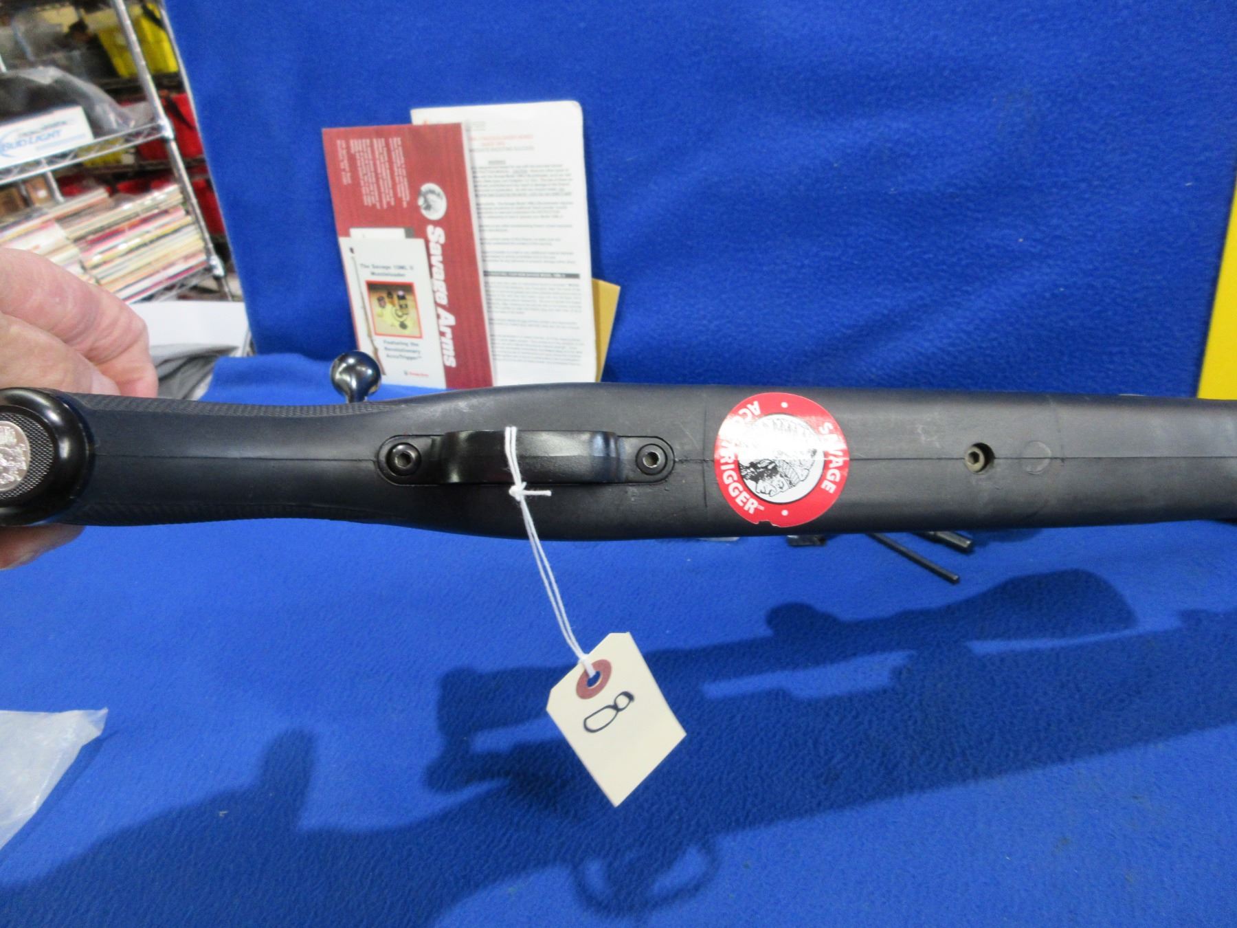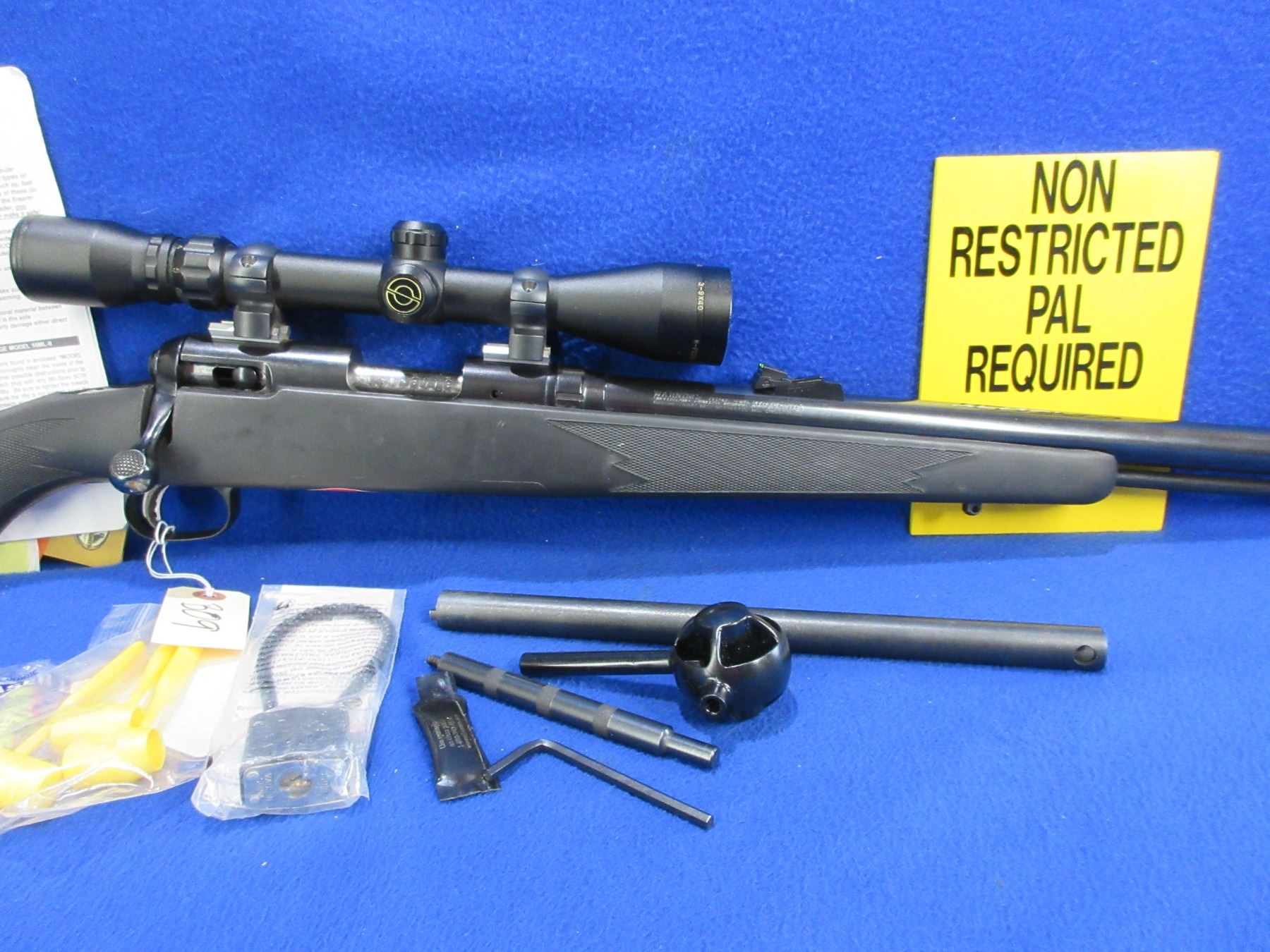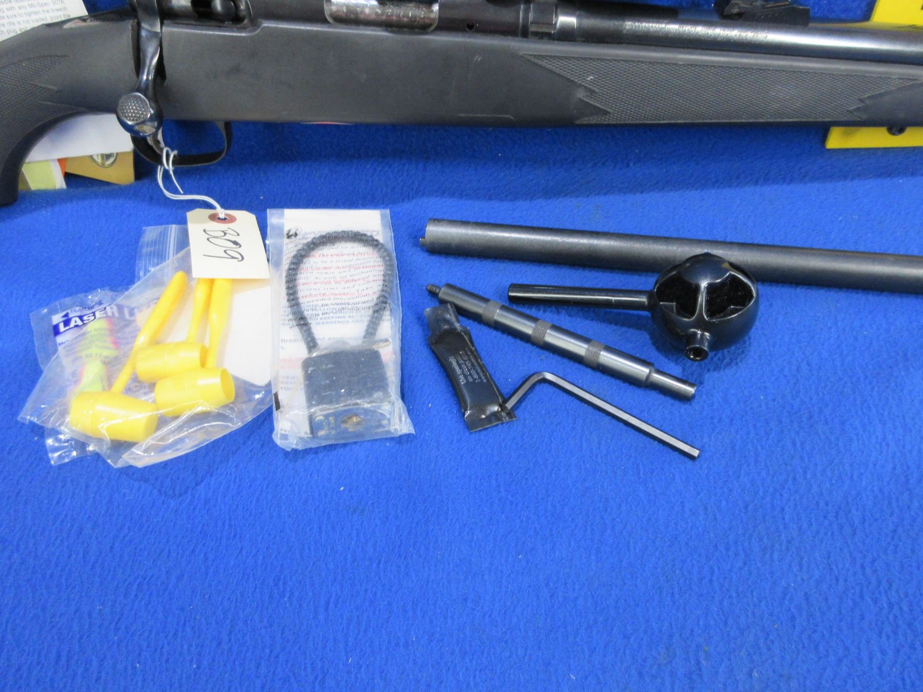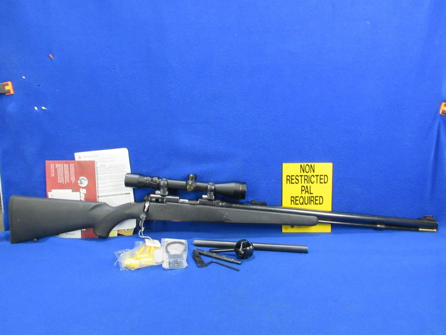 Non-Restricted - Savage Model 10ML-11 in 50 Cal. - This muzzleloading in-line bolt action rifle appears to be in very good working order. Barrel is 24", rifling appears good to very good, bluing is good to very good, has fiber optic sights and a Simmons 3-9x40 scope - appears clear, duplex crosshair, synthetic stock is good to very good with usage marks, rubber butt pad good. Comes with original paperwork, cable lock, powder measures, ball starter, wrench handle, breech plug wrench, ram rod. Ser #M042861