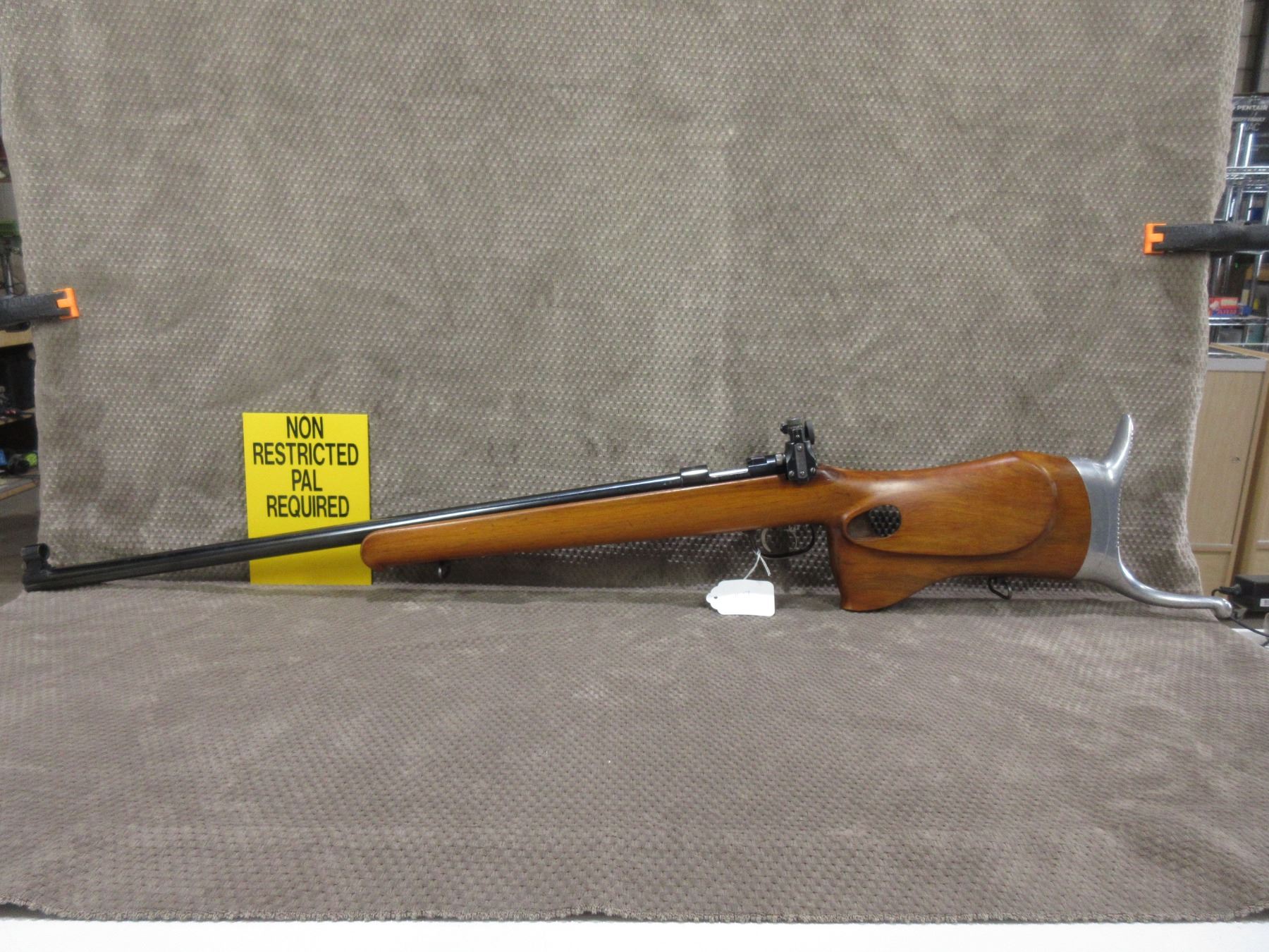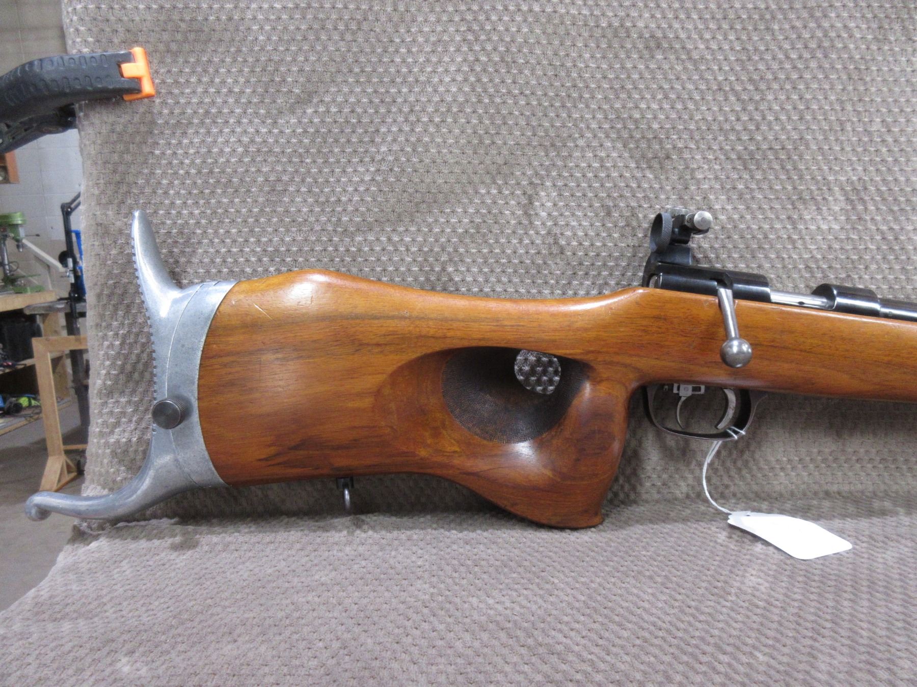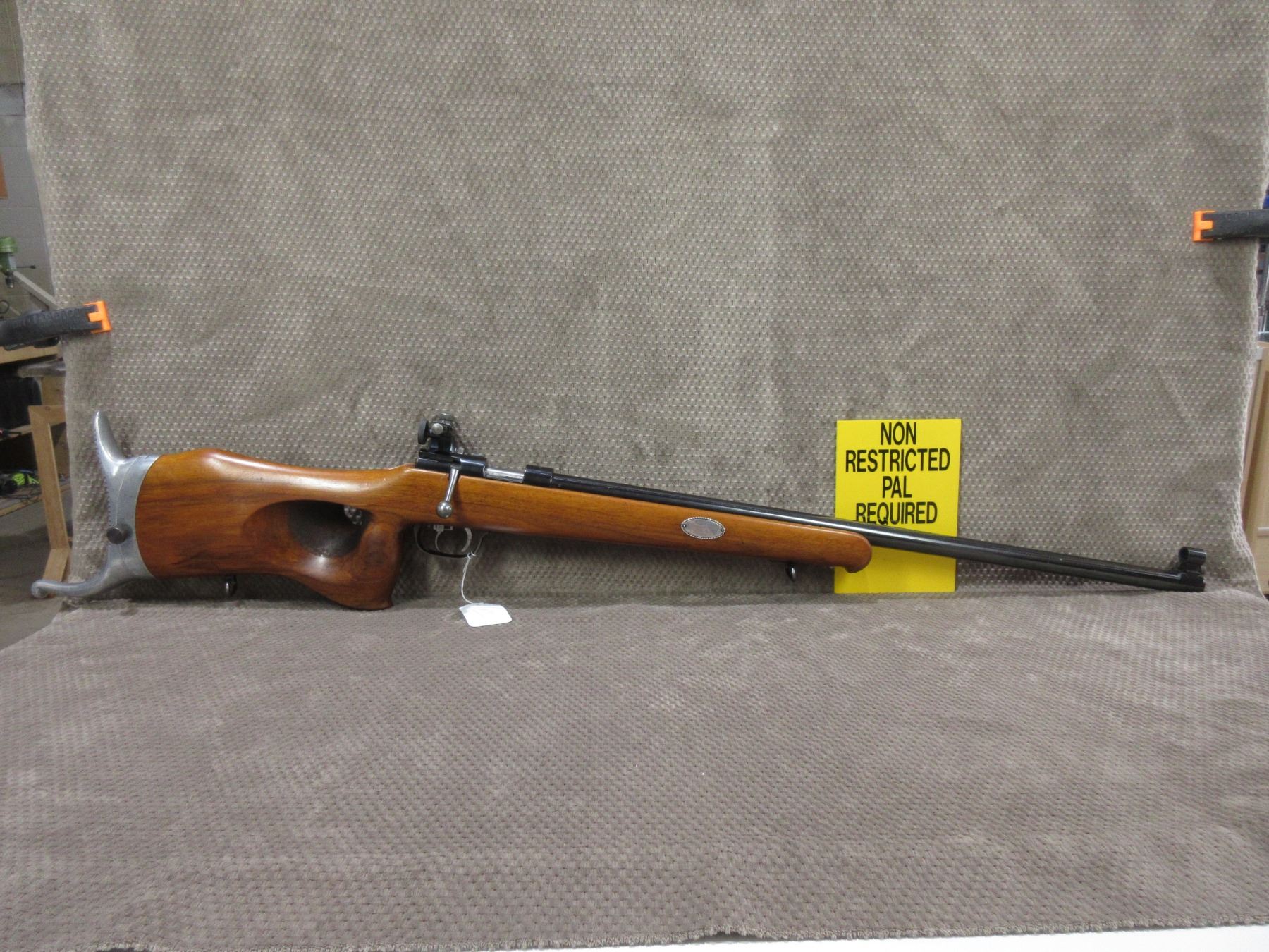 Non-Restricted - Schultz & Larsen Model M61 in 22 LR - This single shot target rifle appears to be in good to very good working order. Heavy barrel is 28", bluing is good to very good with some wear on muzzle, rifling is good to very good, has both peep sights, stock good with usual marks, adjustable butt plate good, Ser # 1647