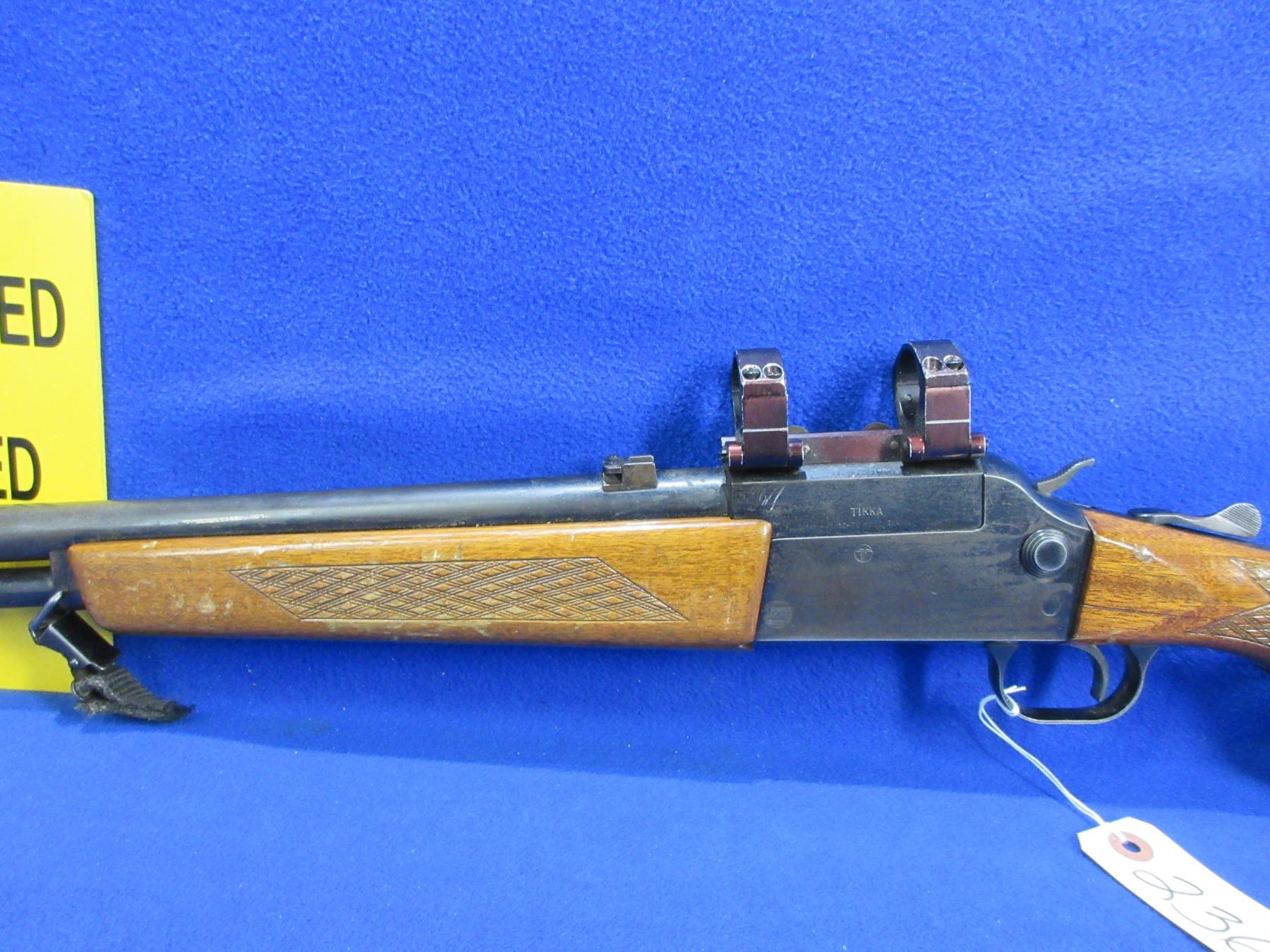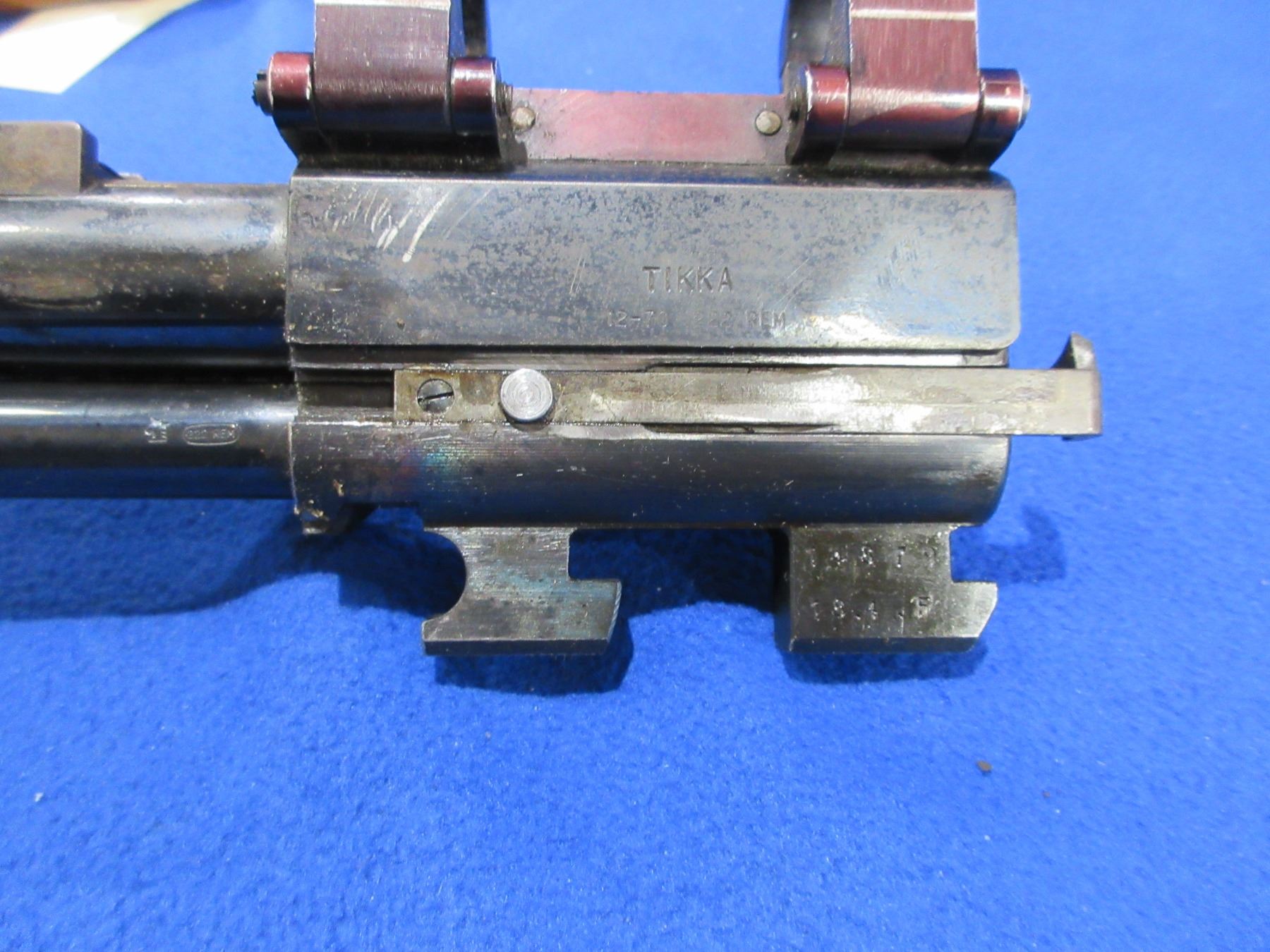 Non-Restricted - Tikka Combo in 12 Ga. 2 3/4"/222 Rem. - This tip up combo shotgun/rifle appears to be in good to very good working order. 12 Ga. barrel is 26" - bore is good, rifle barrel is 24 1/2" - rifling good to very good, bluing is mostly gone, has both sights, mounted with 1" scope rings, stock has cracks on left and right sides of the action, forearm is chipped on front and back, rubber recoil pad, comes with swivels. Ser # 14879