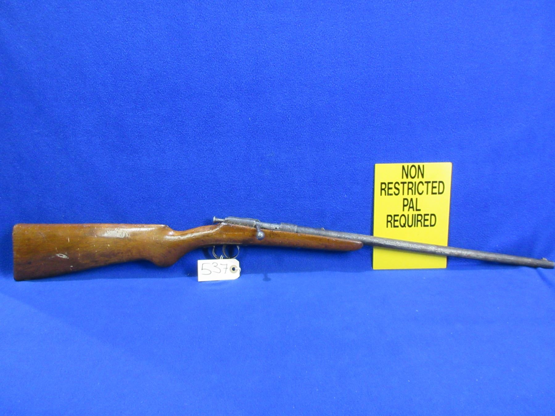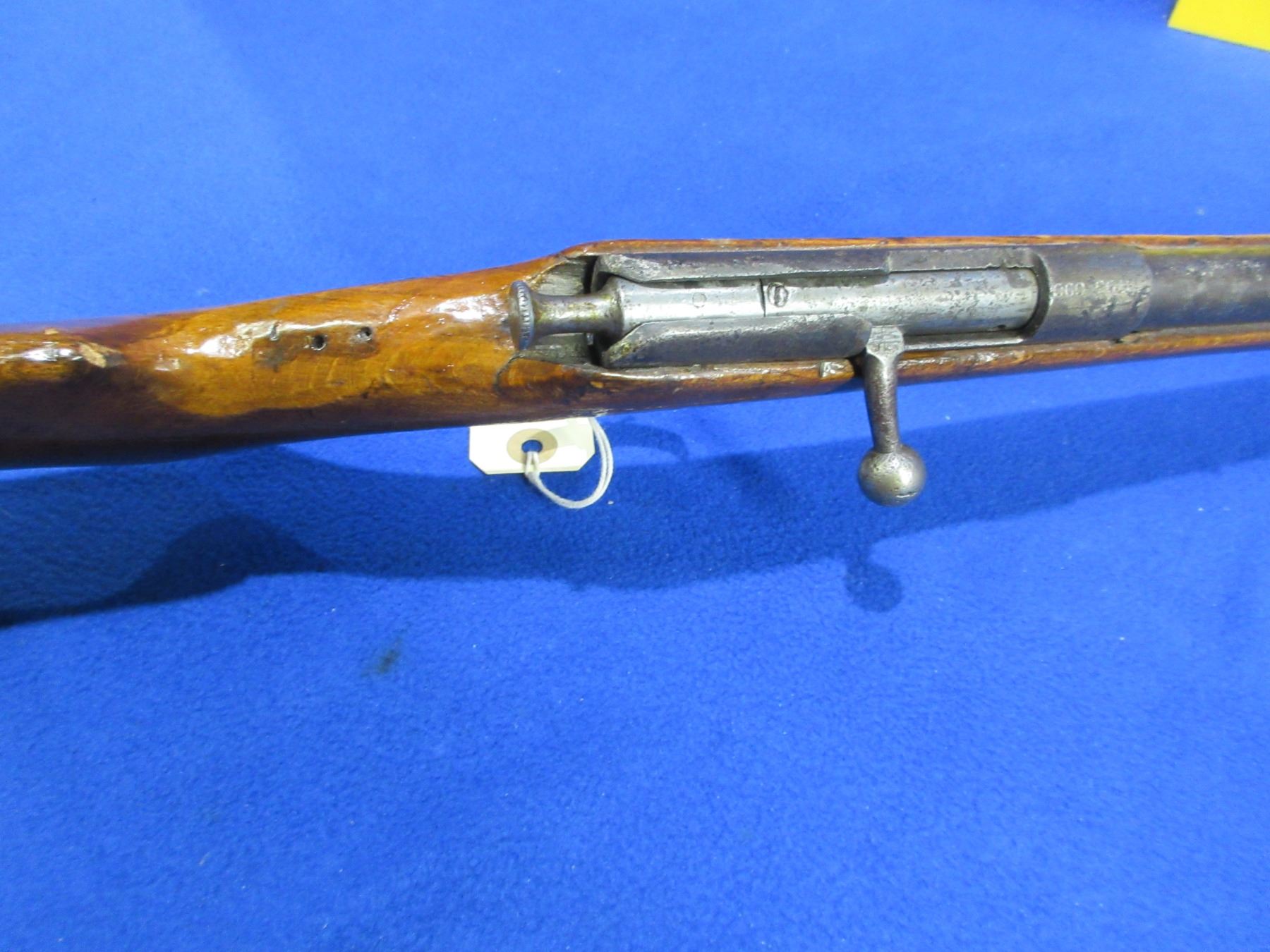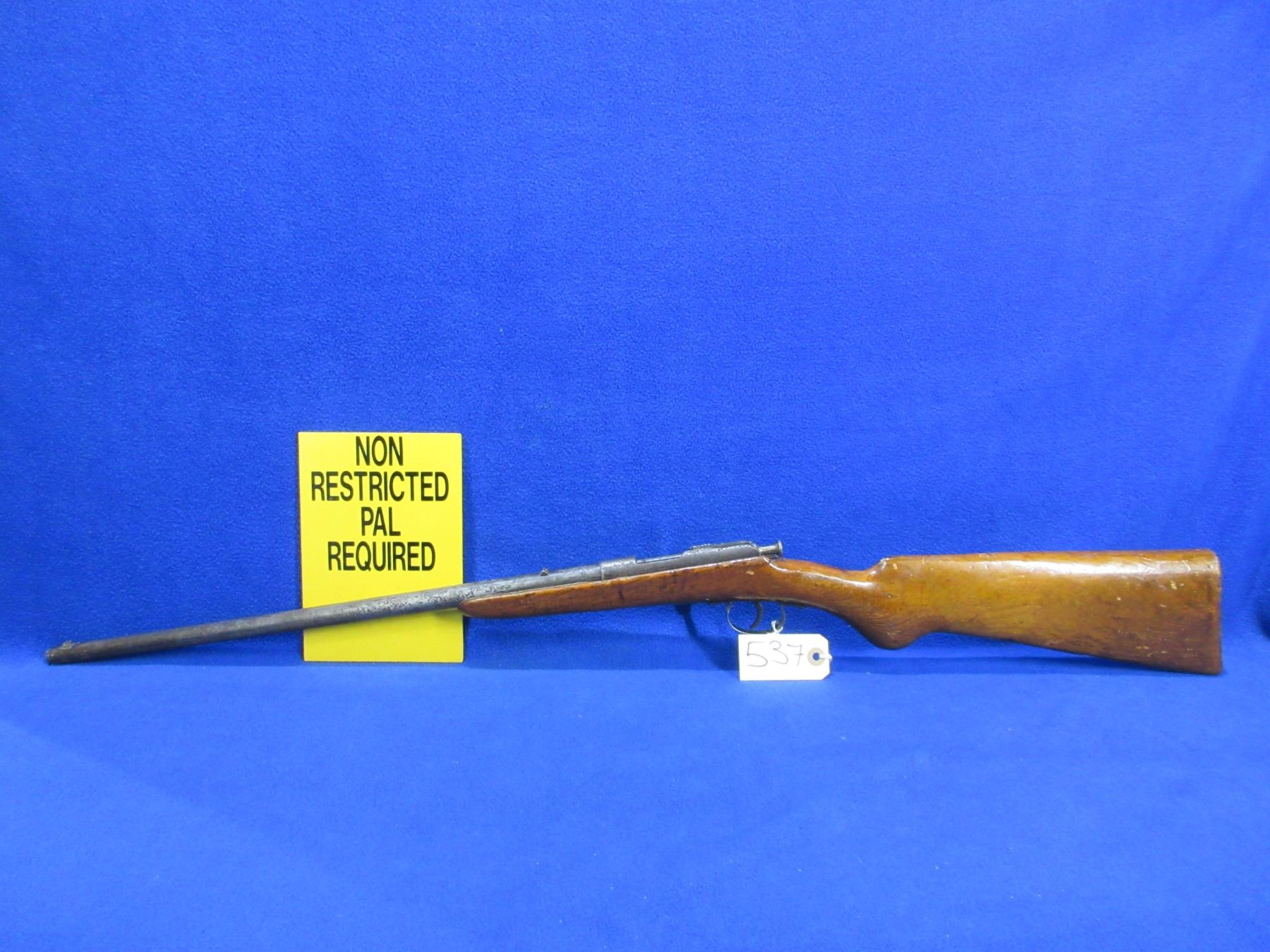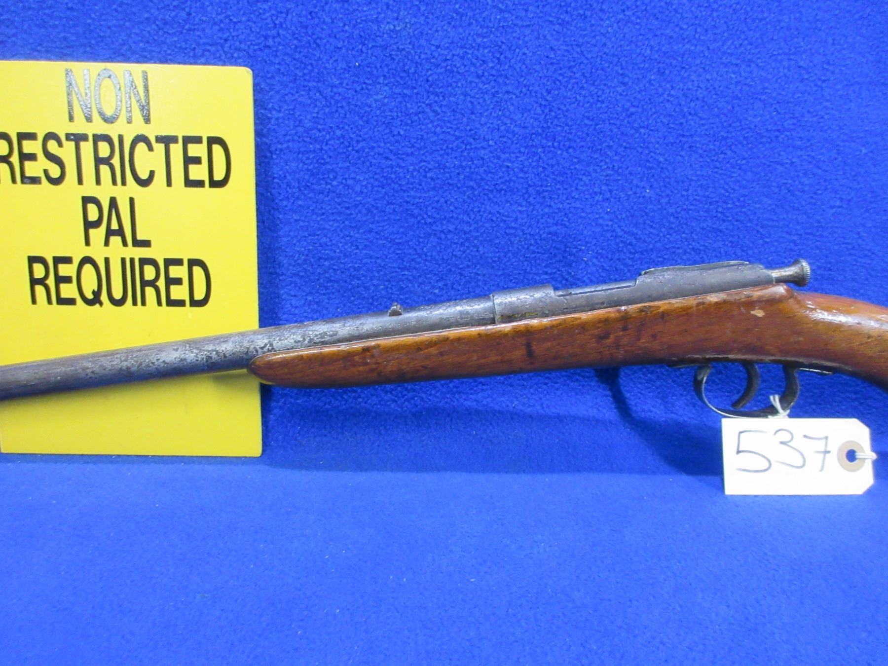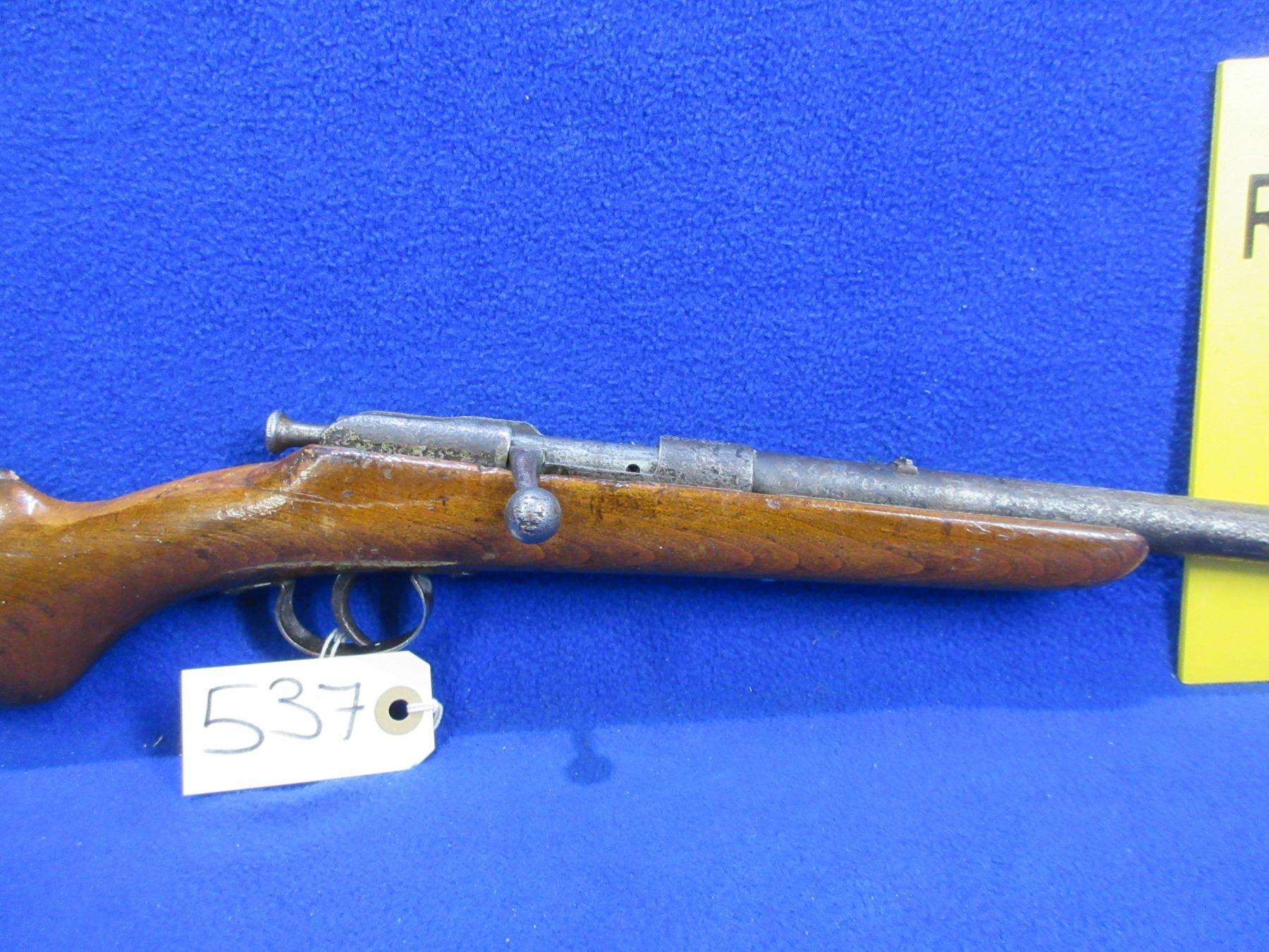 Non-Restricted - Tyskt German Rifle in 22 LR - This is a single shot bolt action rifle, action appears to be in working order but the sliding plate extractor is missing. Barrel is 19", rifling is poor, bluing is gone and barrel and action are badly pitted, has both sights, stock has a crack repair on the right side of action and is poorly refinished, length of pull is 14", swivel studs are missing. Ser # 1703-90