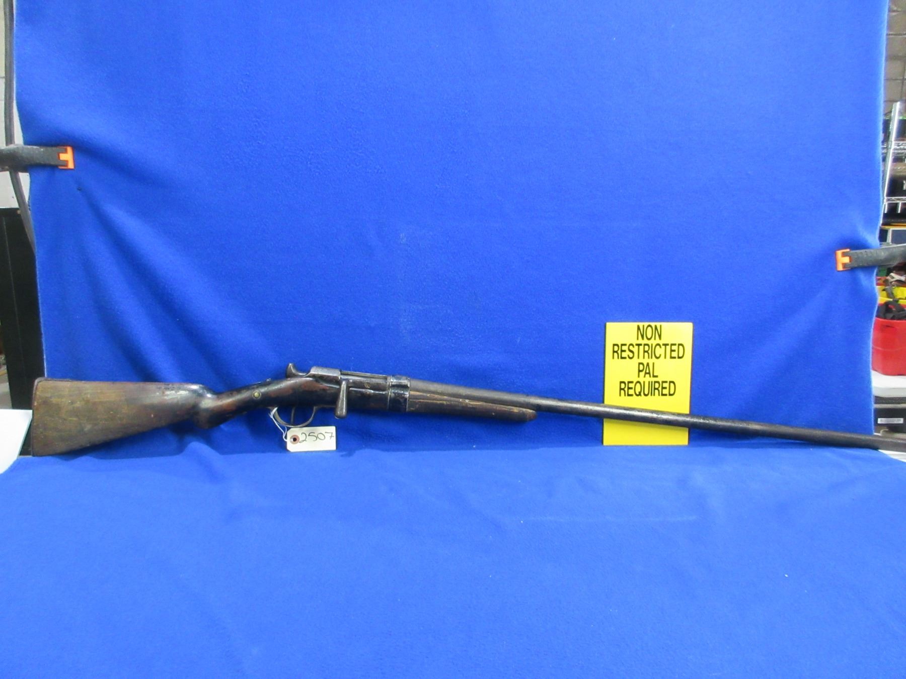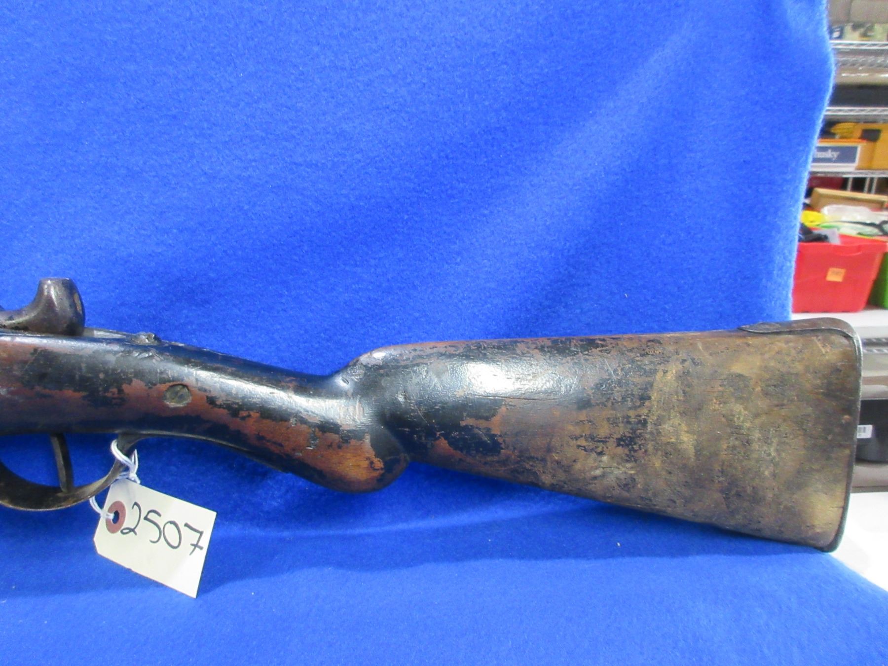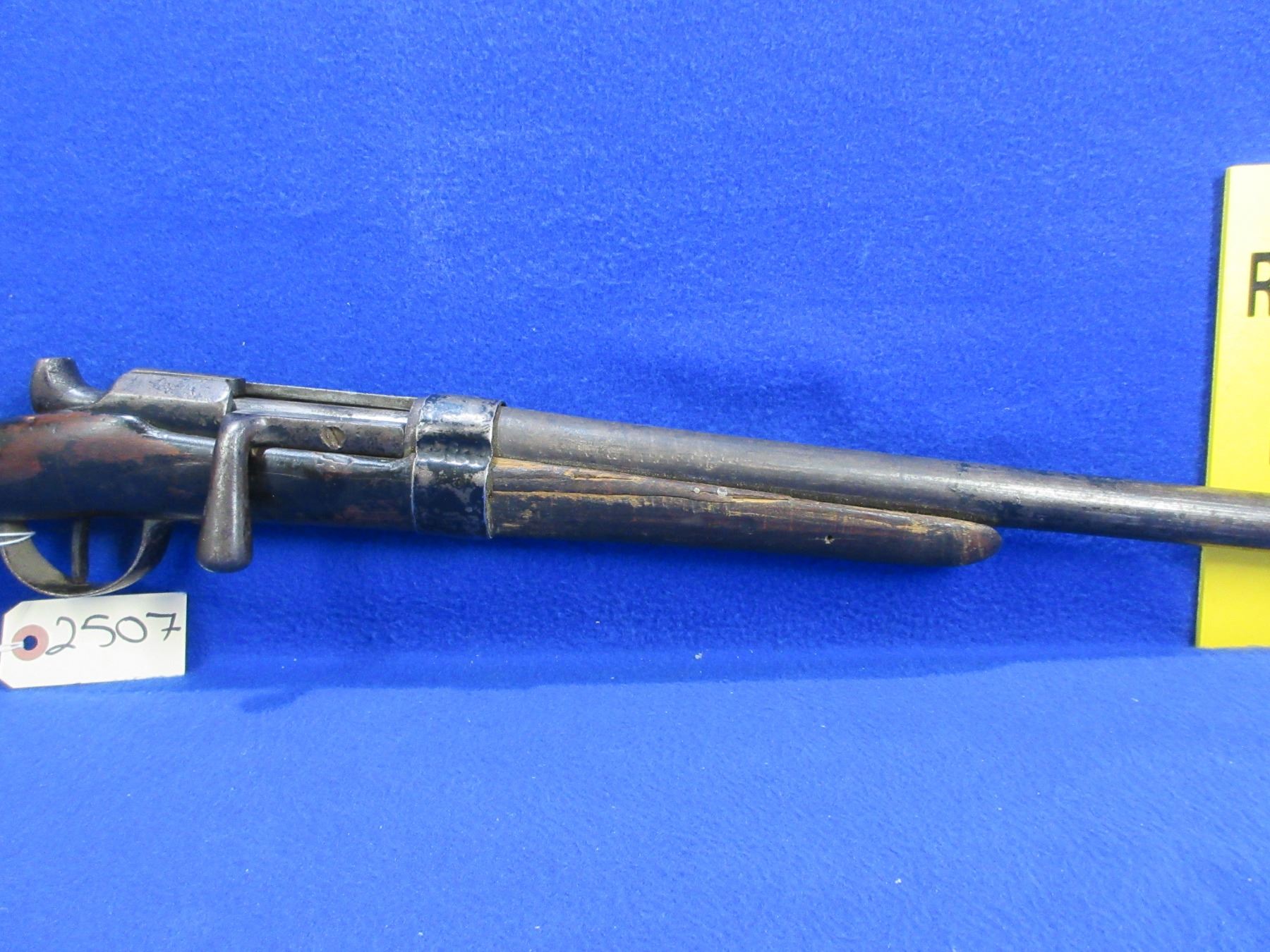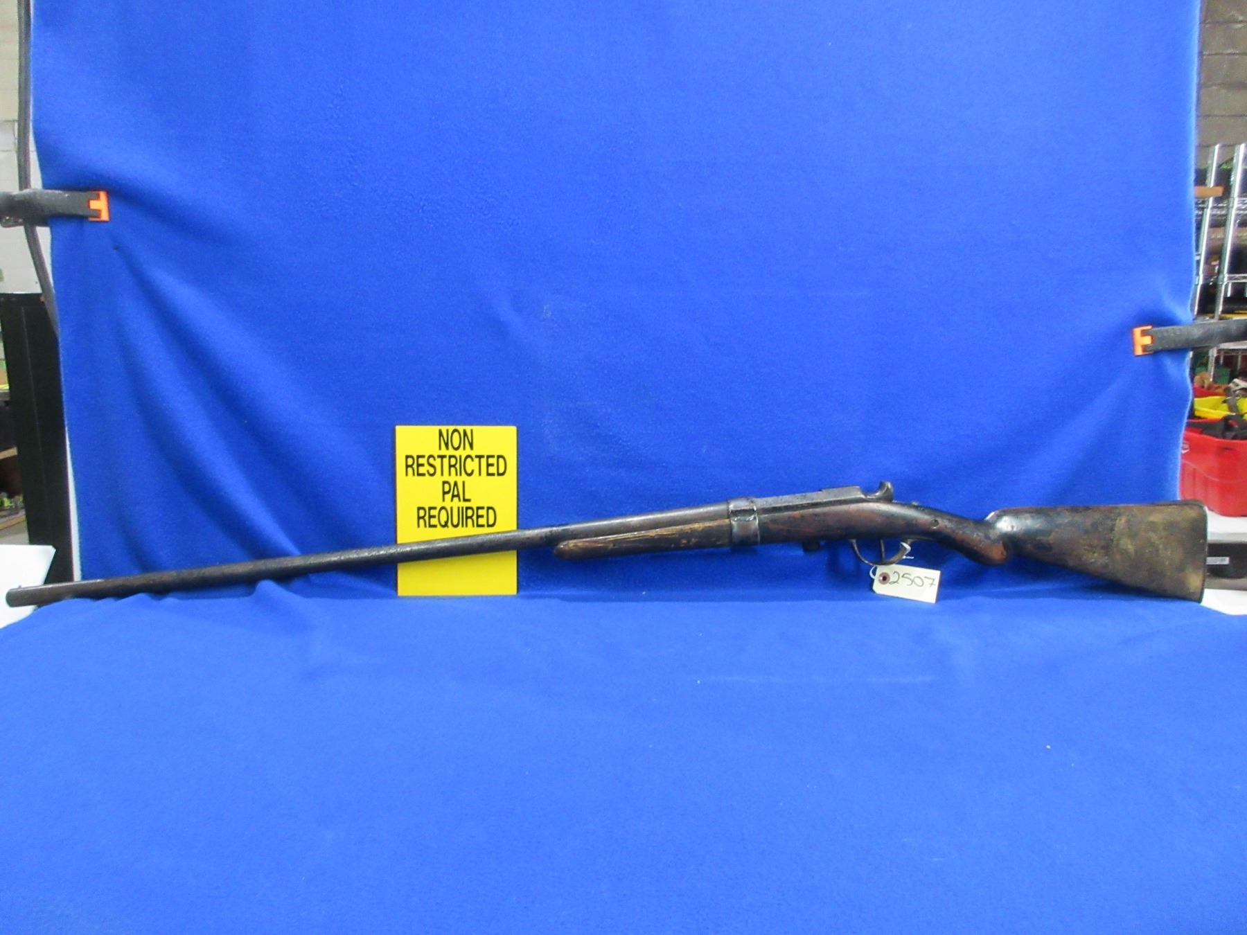 Non-Restricted - Unknown Belgian Shotgun in 12 Ga. - This bolt action single shot shotgun appears to be in fair to good working order. Barrel is 31 3/4", bore is fair to good, bluing is gone and pitted and was painted - mostly flaked off, has bead front sight, stock has a major crack behind top tang which is poorly repaired, forearm has a crack on the right side, metal butt plate. Ser # 68 on bolt
