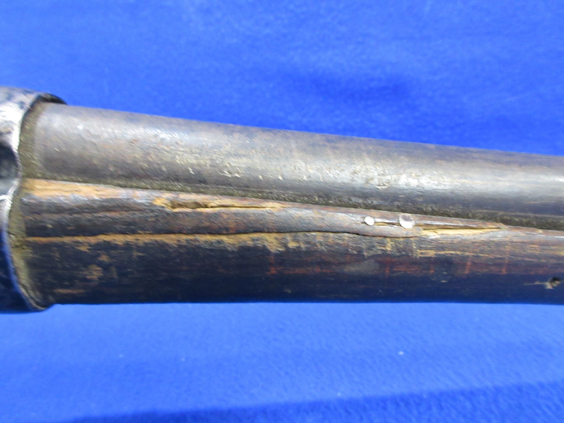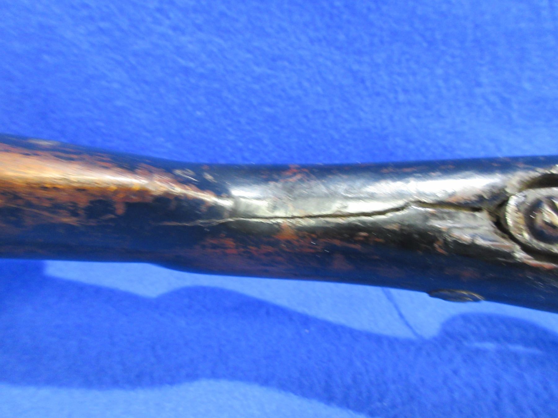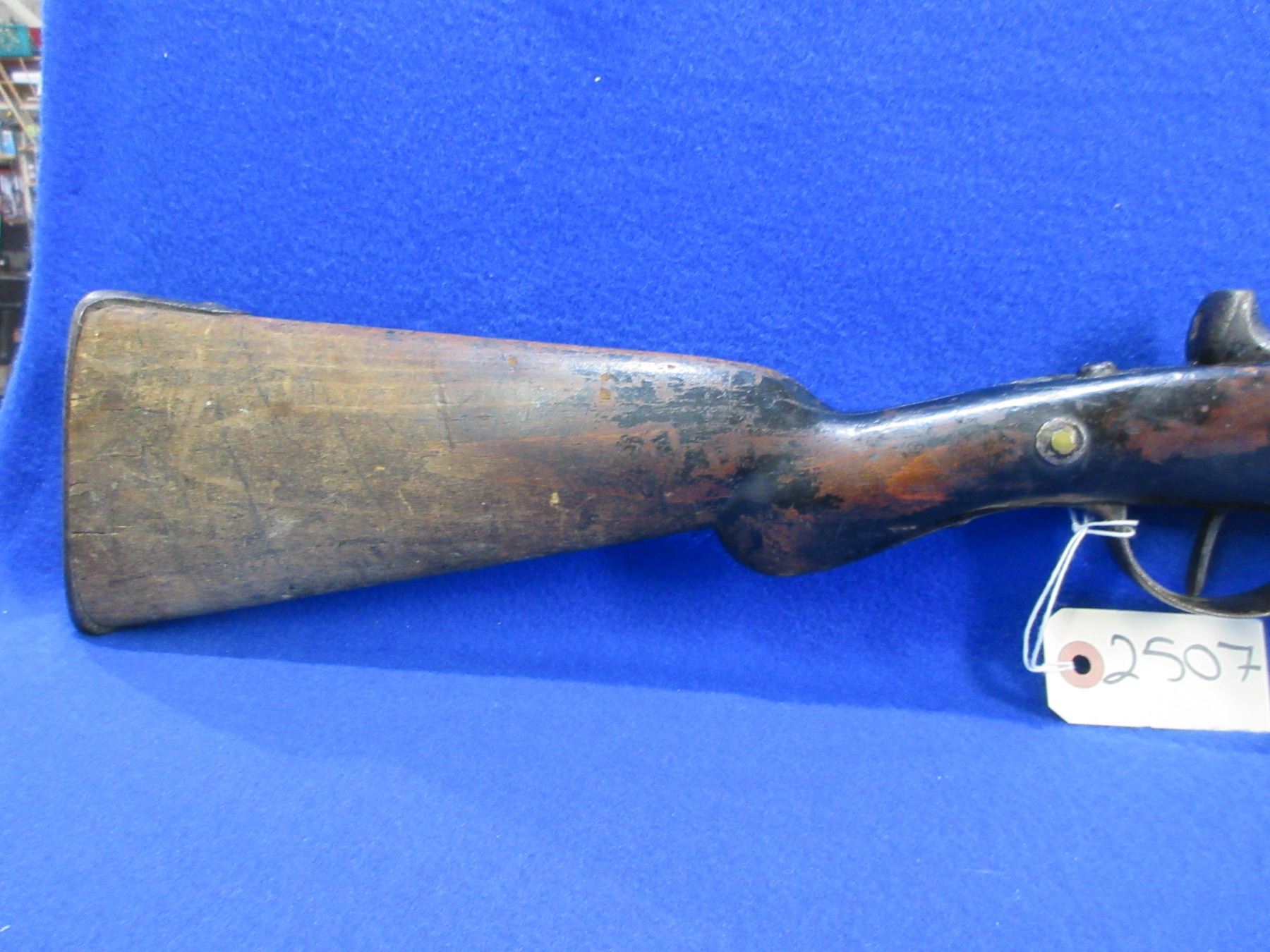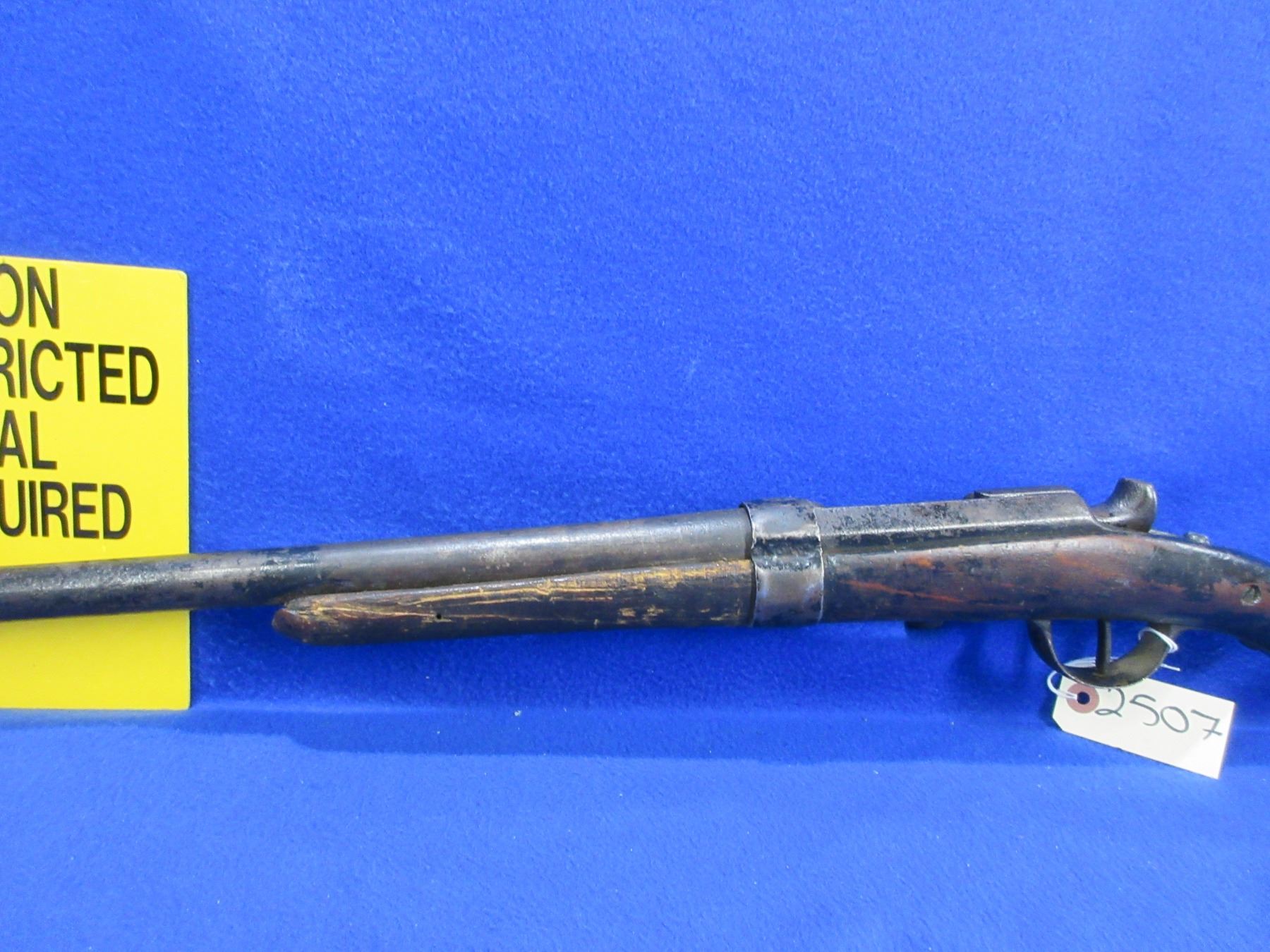 Non-Restricted - Unknown Belgian Shotgun in 12 Ga. - This bolt action single shot shotgun appears to be in fair to good working order. Barrel is 31 3/4", bore is fair to good, bluing is gone and pitted and was painted - mostly flaked off, has bead front sight, stock has a major crack behind top tang which is poorly repaired, forearm has a crack on the right side, metal butt plate. Ser # 68 on bolt