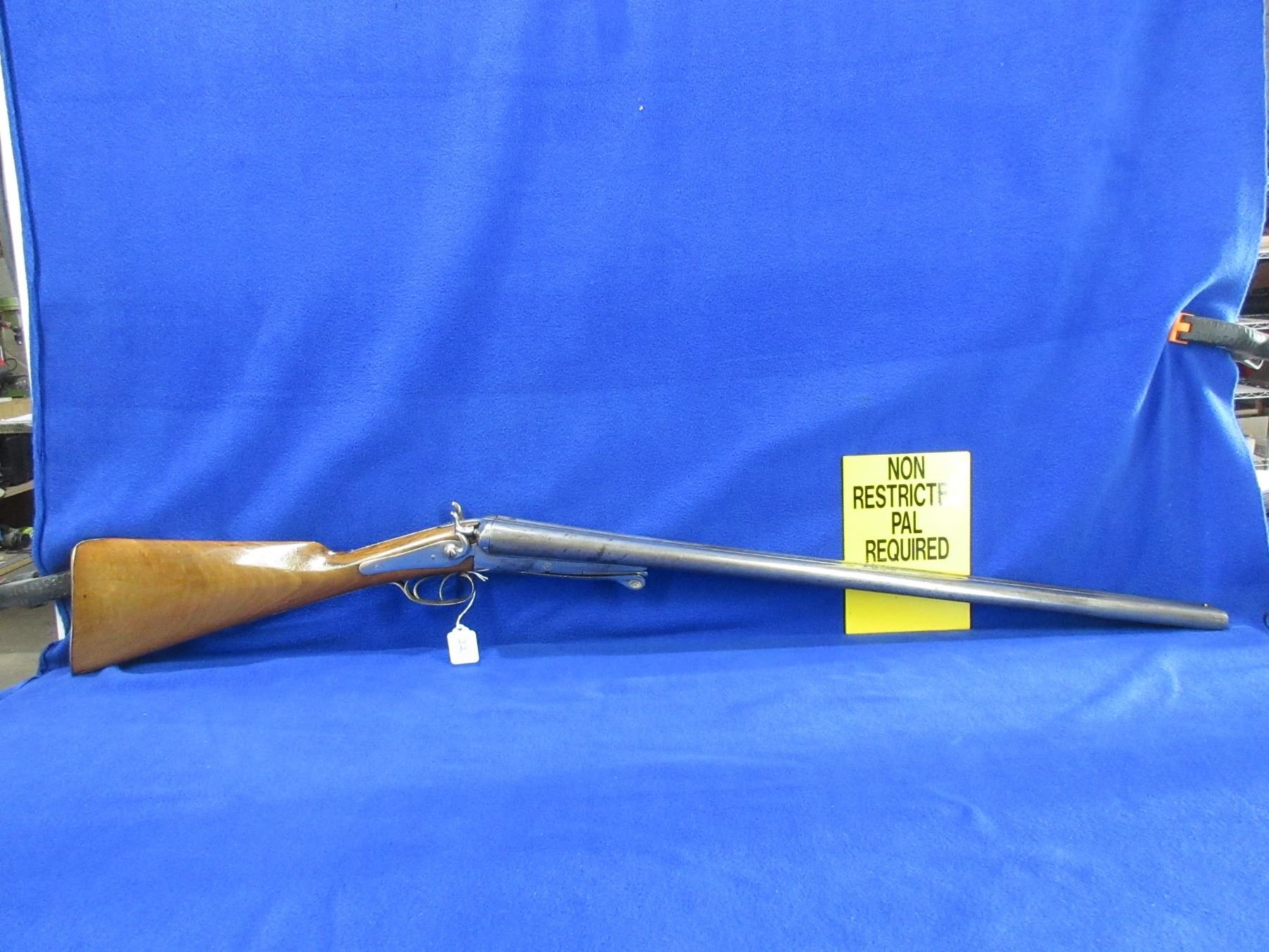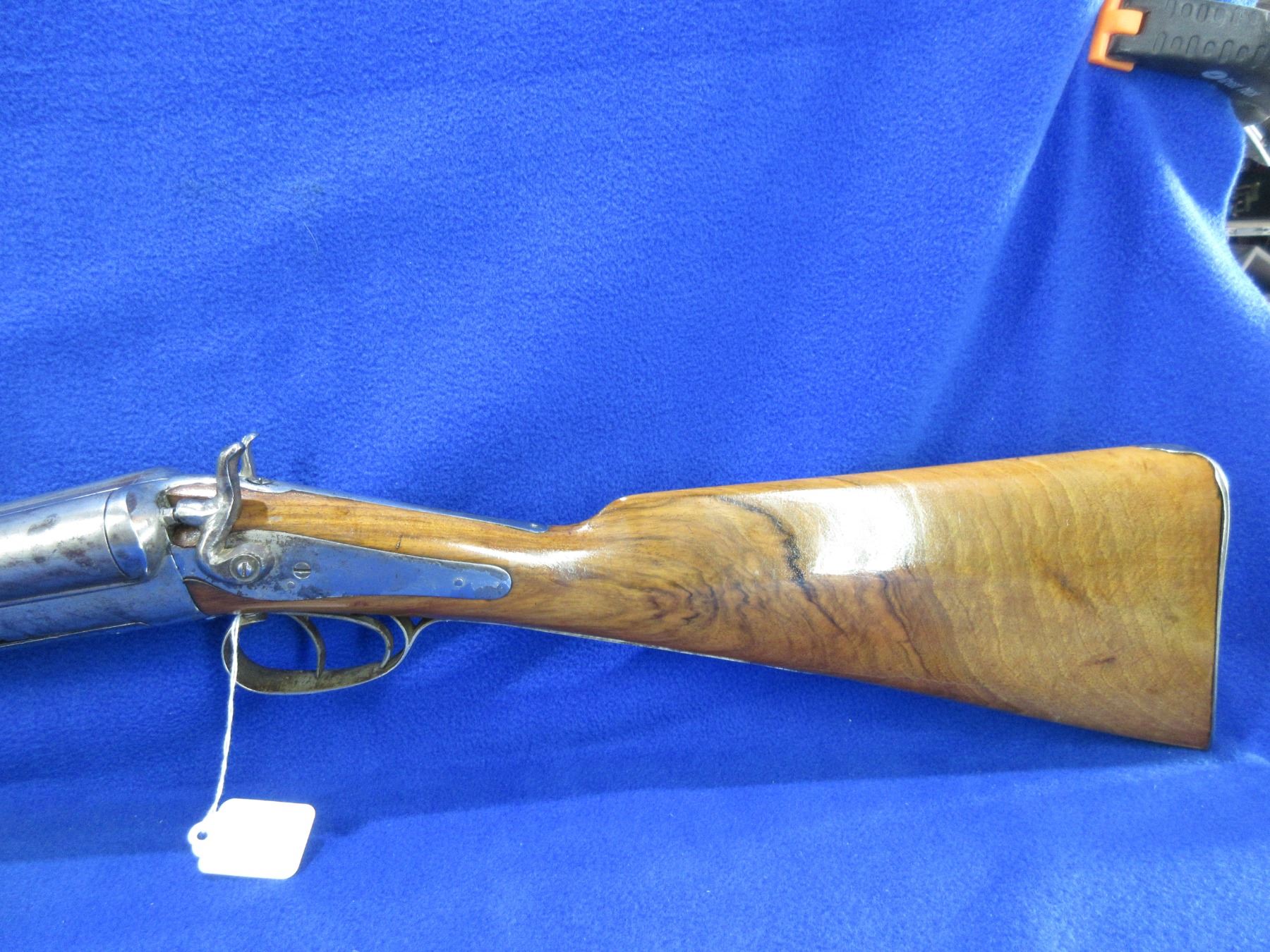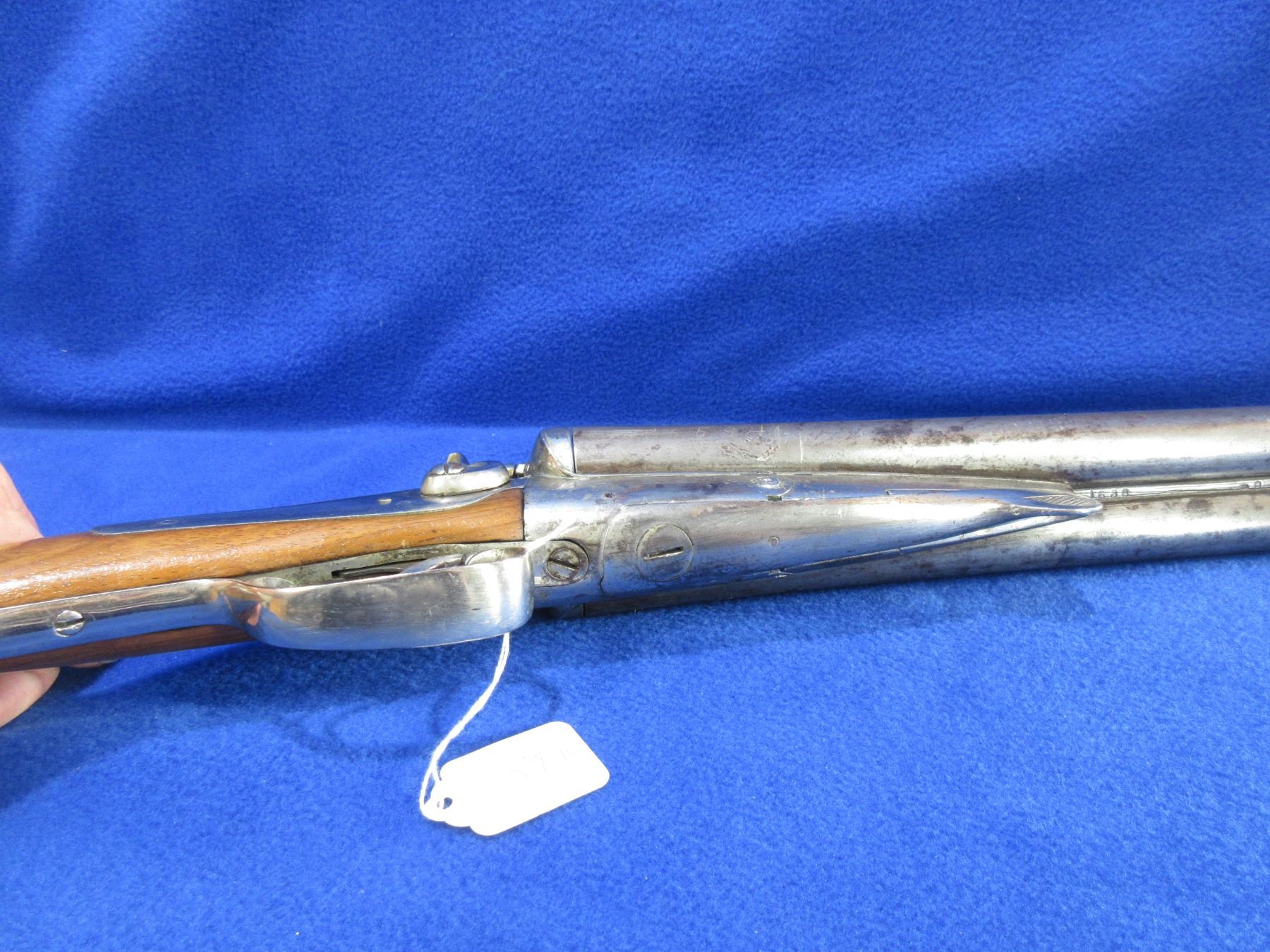 Non-Restricted - Unknown SXS Under Lever in 10 Ga. - This SXS under lever tip barrel hammer (left hammer not original) shotgun appears to be in wall hanging condition as it is probably unsafe to shoot. Barrel is 29 1/4", bores are fair to good, appears to have had nickel plating which is mostly gone, has bead front sight, stock is good, metal butt plate good. Appears to have Belgian markings, Ser # 1638