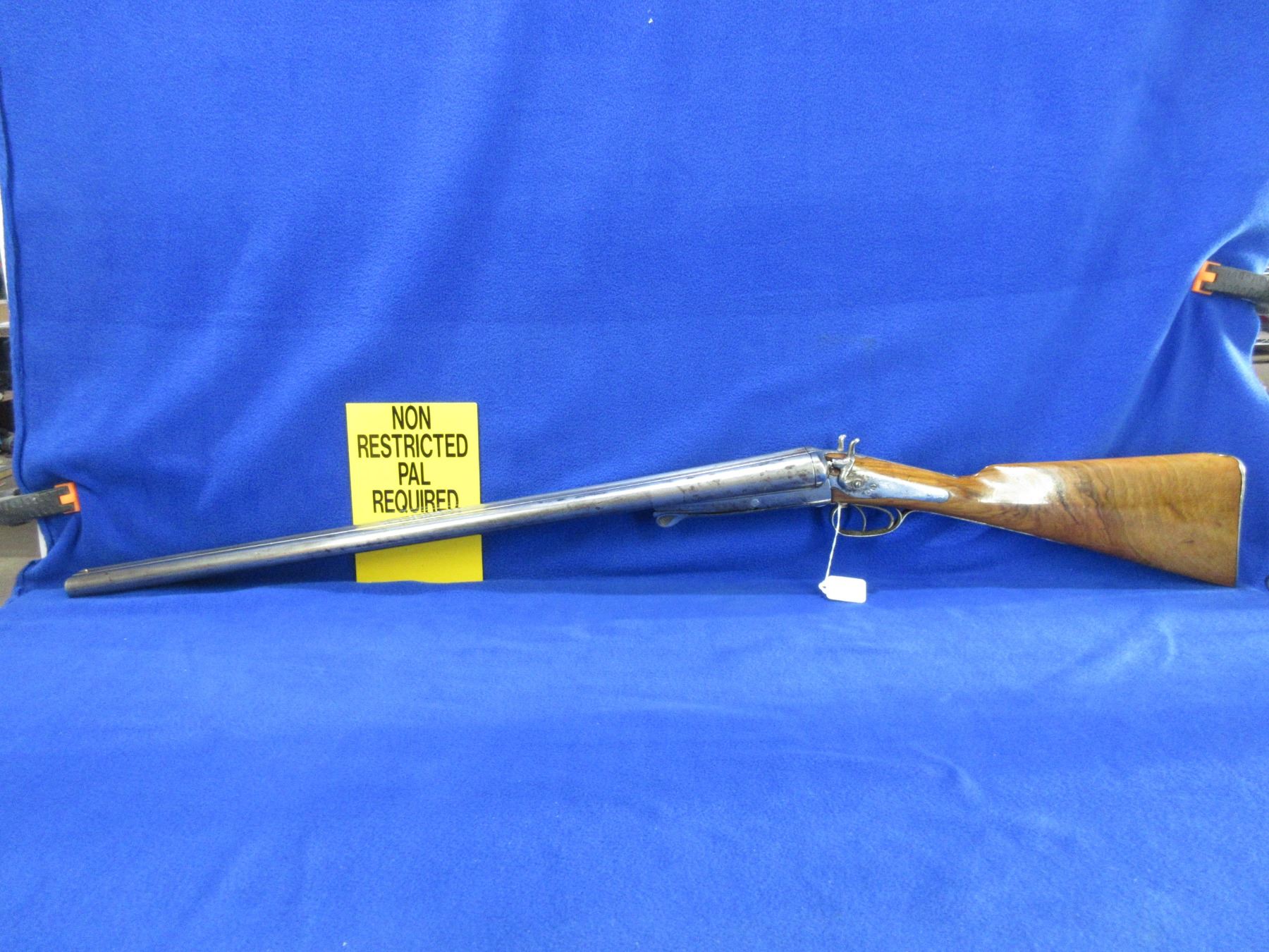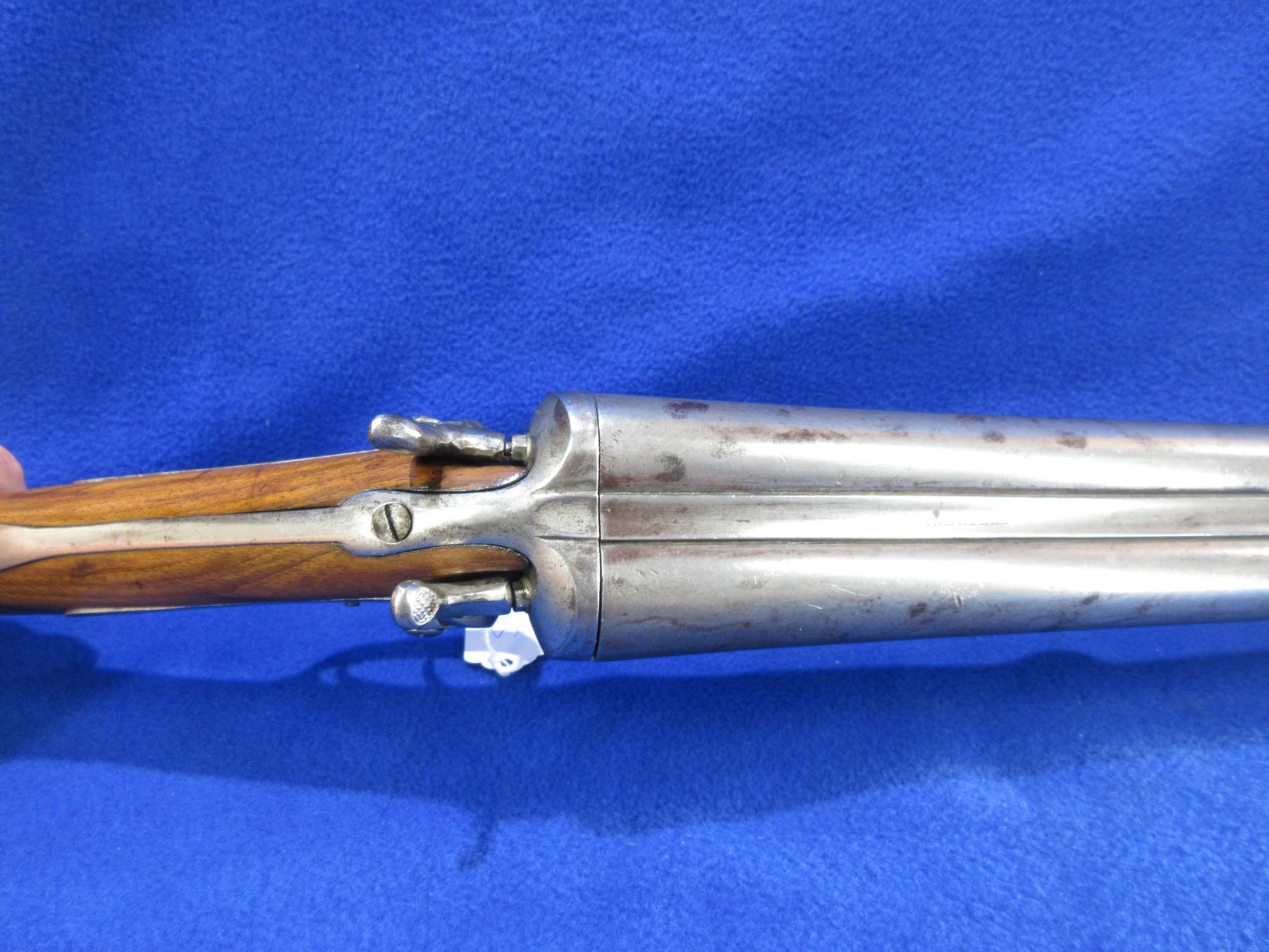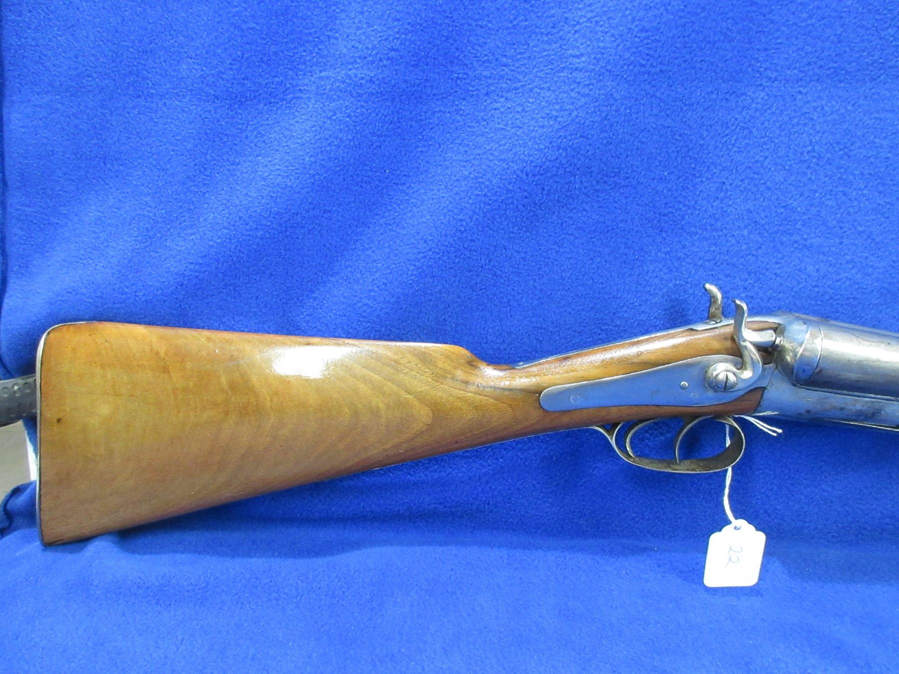 Non-Restricted - Unknown SXS Under Lever in 10 Ga. - This SXS under lever tip barrel hammer (left hammer not original) shotgun appears to be in wall hanging condition as it is probably unsafe to shoot. Barrel is 29 1/4", bores are fair to good, appears to have had nickel plating which is mostly gone, has bead front sight, stock is good, metal butt plate good. Appears to have Belgian markings, Ser # 1638