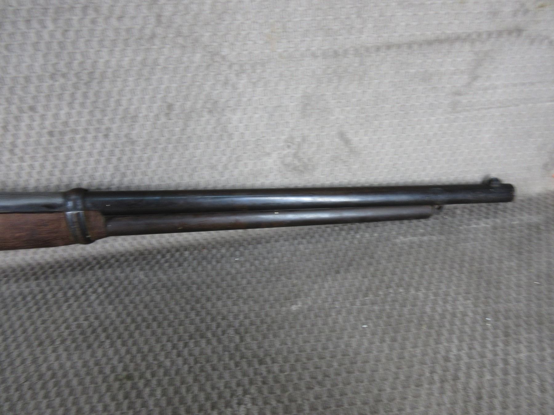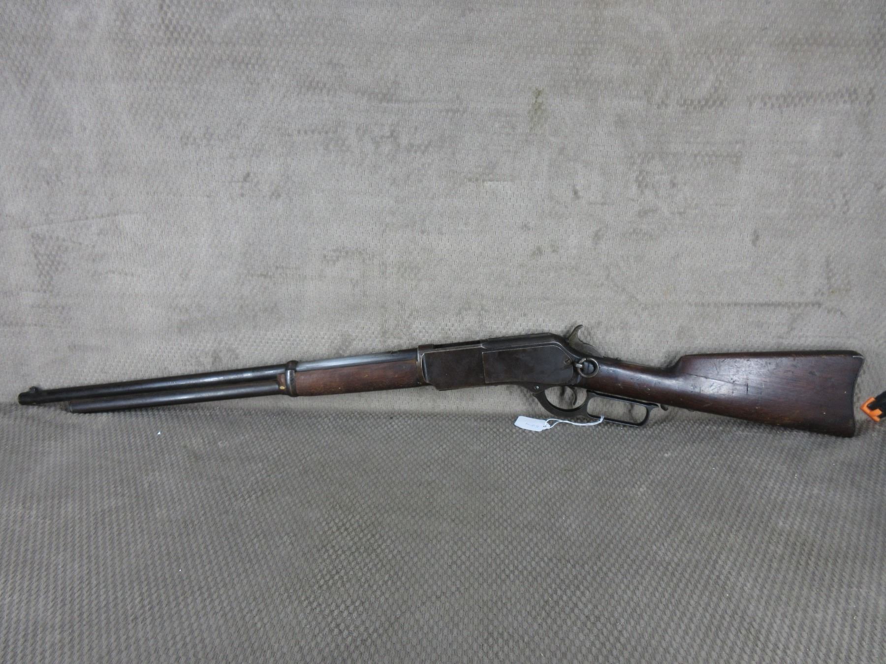 Non-Restricted - Win. 1876 Saddle Ring Carbine in 45-60 - This lever action rifle was made in 1883 and appears to be in poor to fair working order as action cycles but needs cleaning and is missing the following: chamber dust cover, extractor, screw on bottom of action. Barrel is 22", rifling is poor to fair, bluing is poor as some parts have been sanded, has front sight, missing rear sight, stock has large crack, forearm is incorrect and is missing cap, has steel butt plate. Stamping on stock we think it reads, J. Hingston Smith Winnipeg. We found a newspaper ad in the Winnipeg Free Press dated 1883 so they could have sold this gun new.