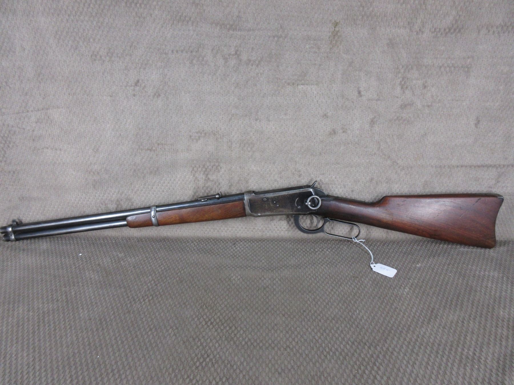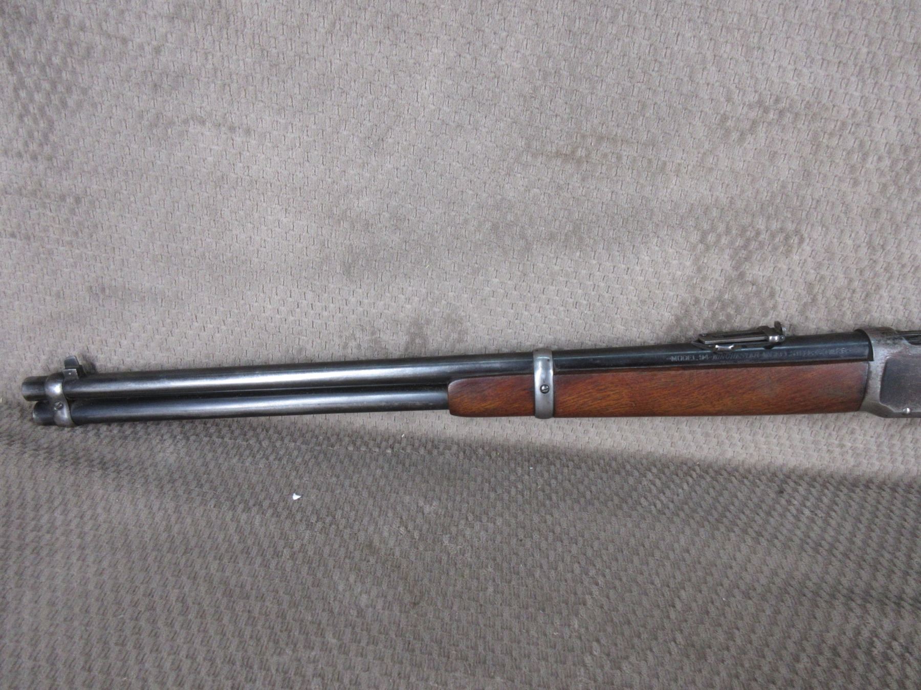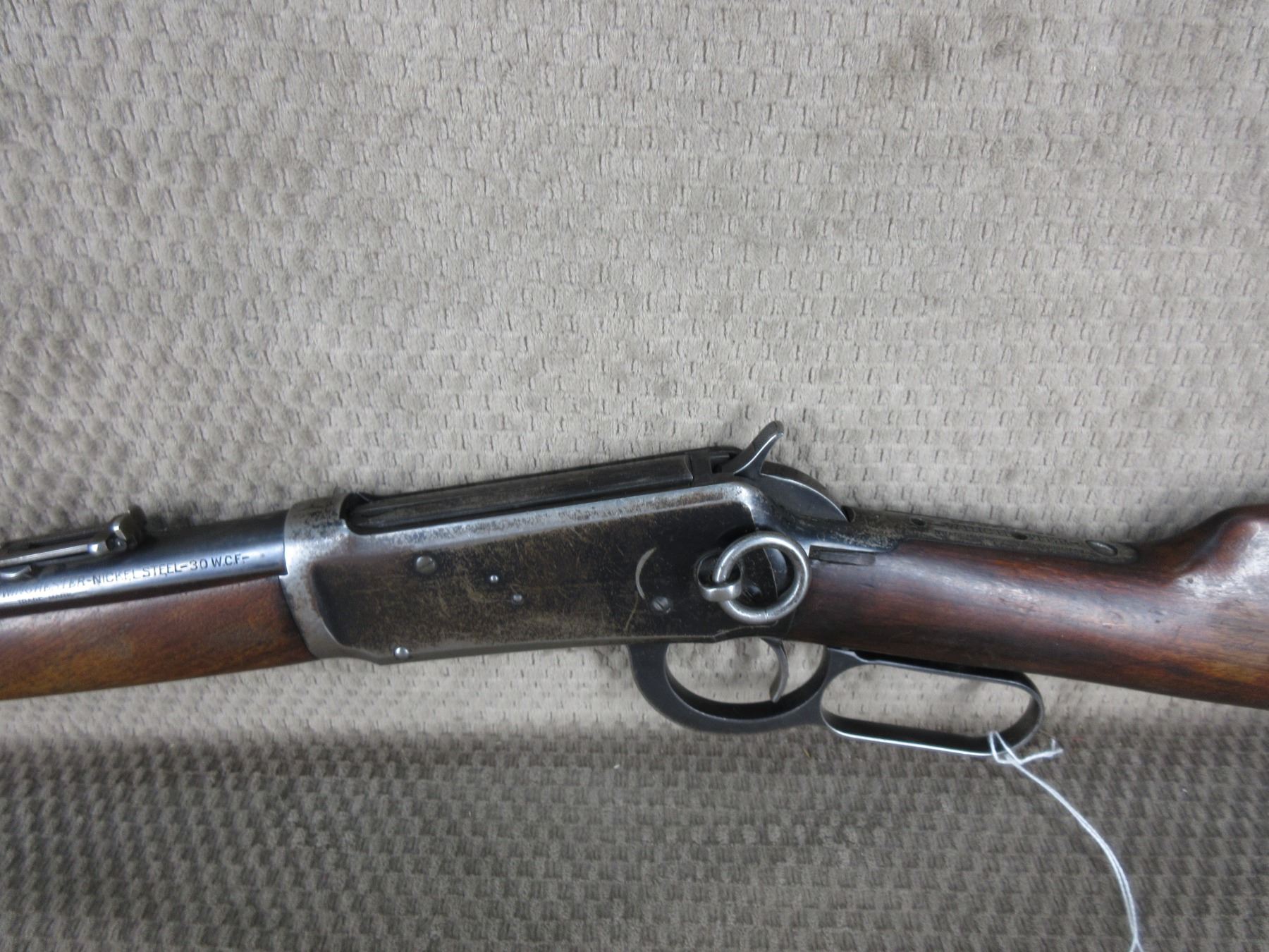 Non-Restricted - Win. 94 Saddle Ring Carbine in 30 WCF (30-30) - This lever action rifle was made in 1927 and appears to be in very good working order. Barrel is 20", rifling is very good, bluing is turning grey with typical wear spots, has both sights & tang is drilled for a peep sight (not supplied), stock is good with usage marks and a small chip missing on left side by hammer, forearm is good to very good, has steel butt plate.
