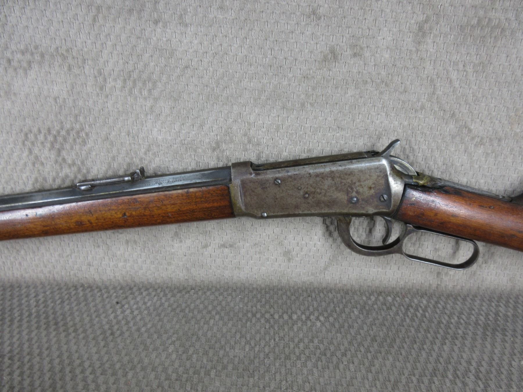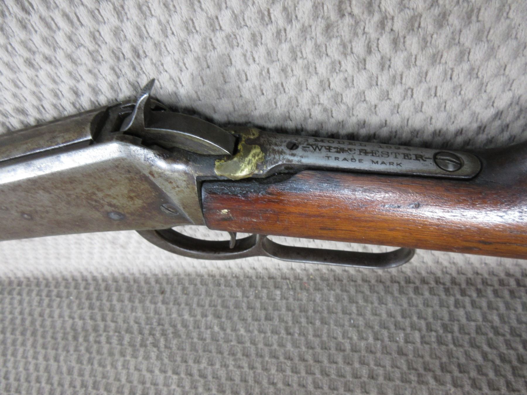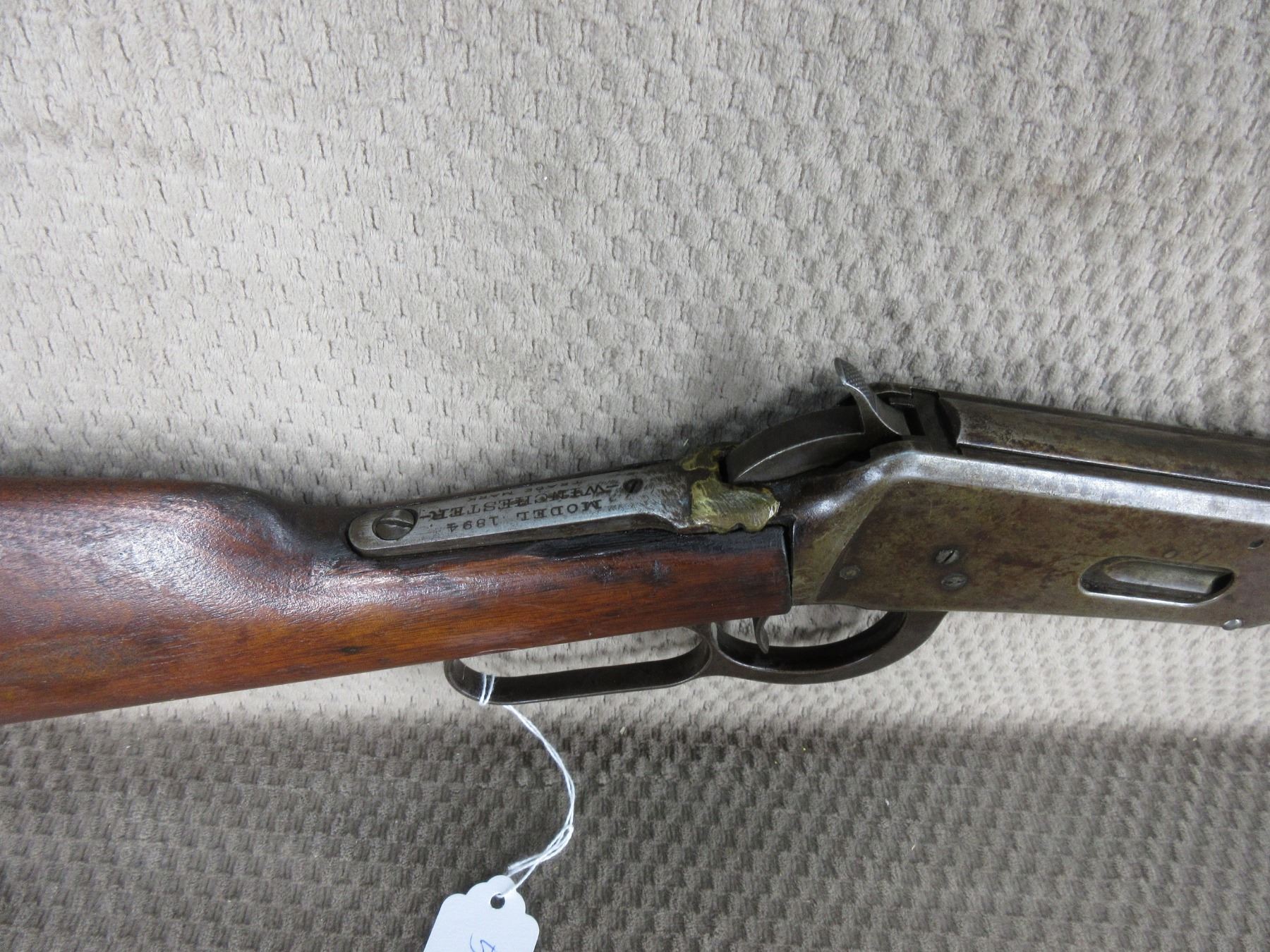 Non-Restricted - Winchester 1894 Rifle in 30 WCF (30-30) - This lever action rifle was made in 1905 and appears to be in good working order but tang has been broken off and brazed back on. Barrel is 26", rifling is good to very good but quite dark, bluing is turning grey with wear spots, has both sights, stock is incorrect and may have been off an 1873, forearm is good with usual marks, has steel butt plate (probably 1873).