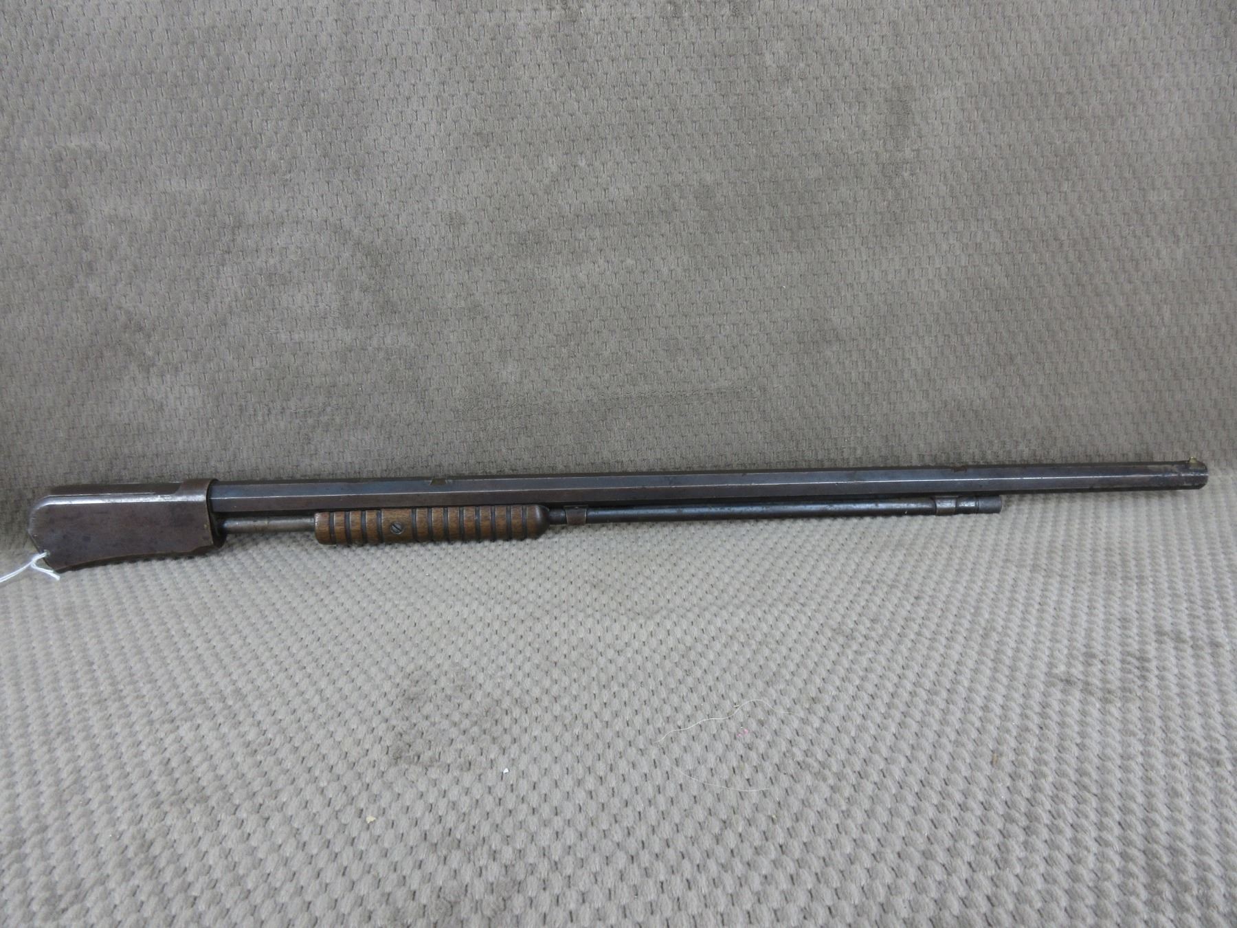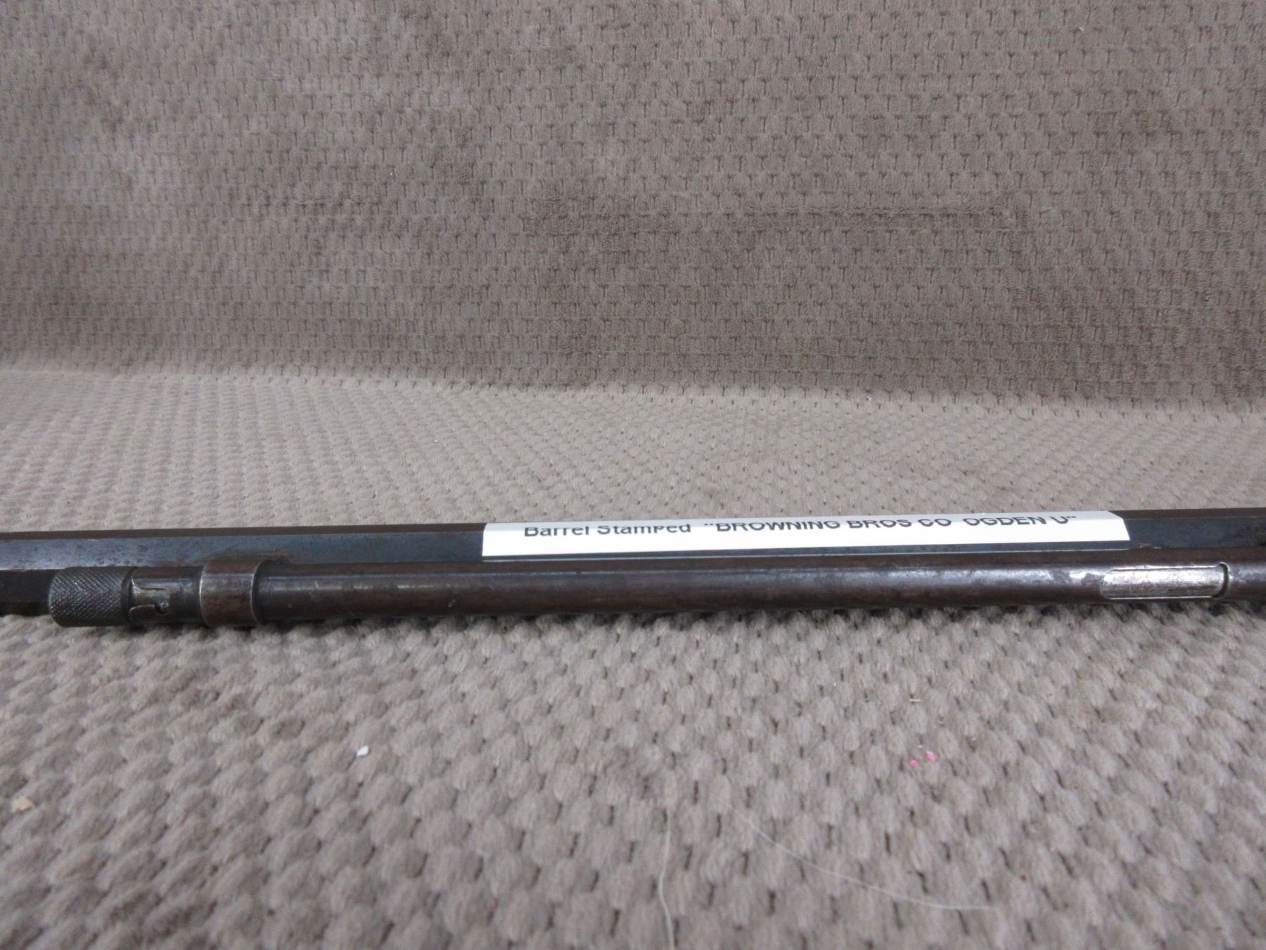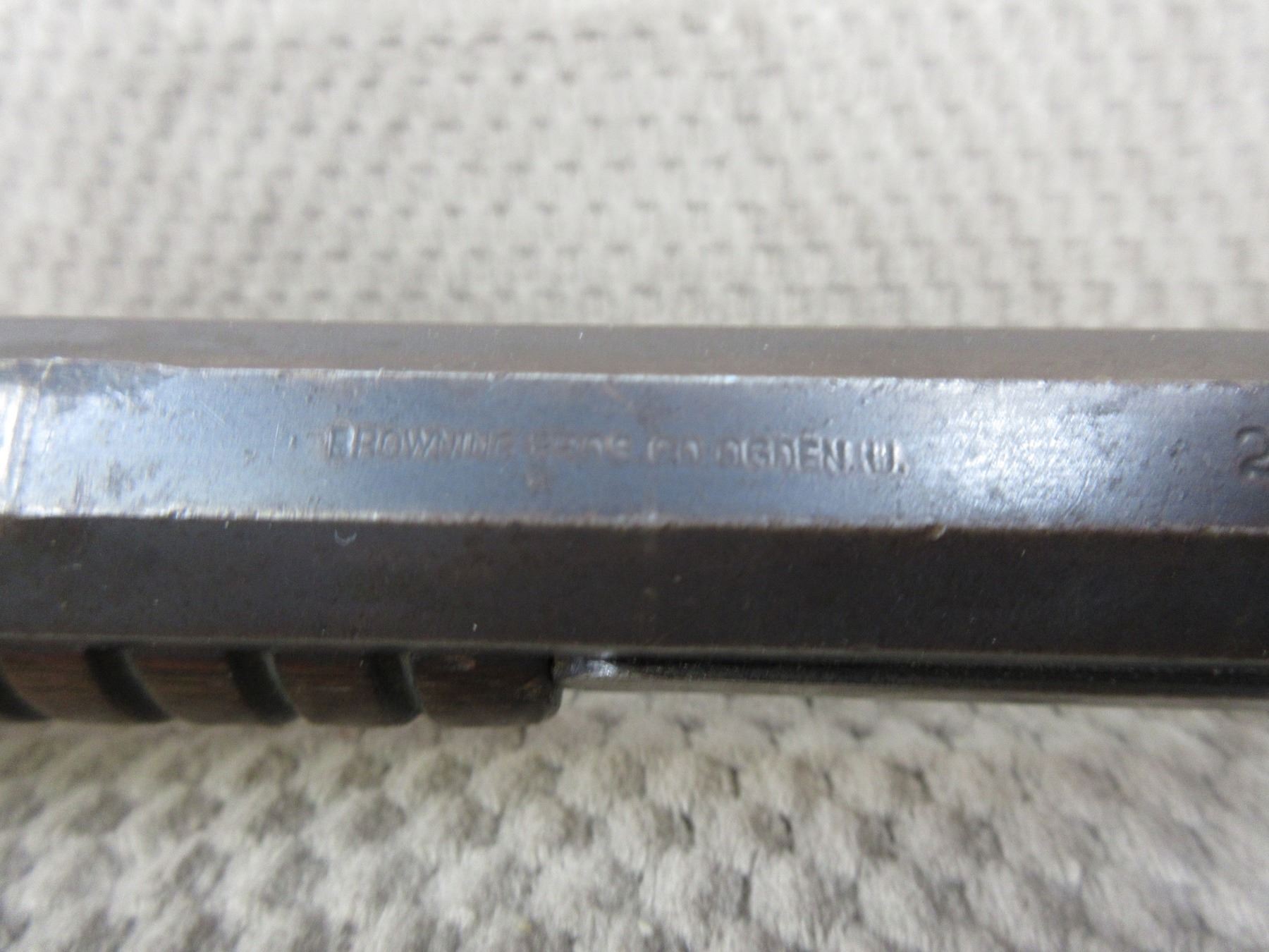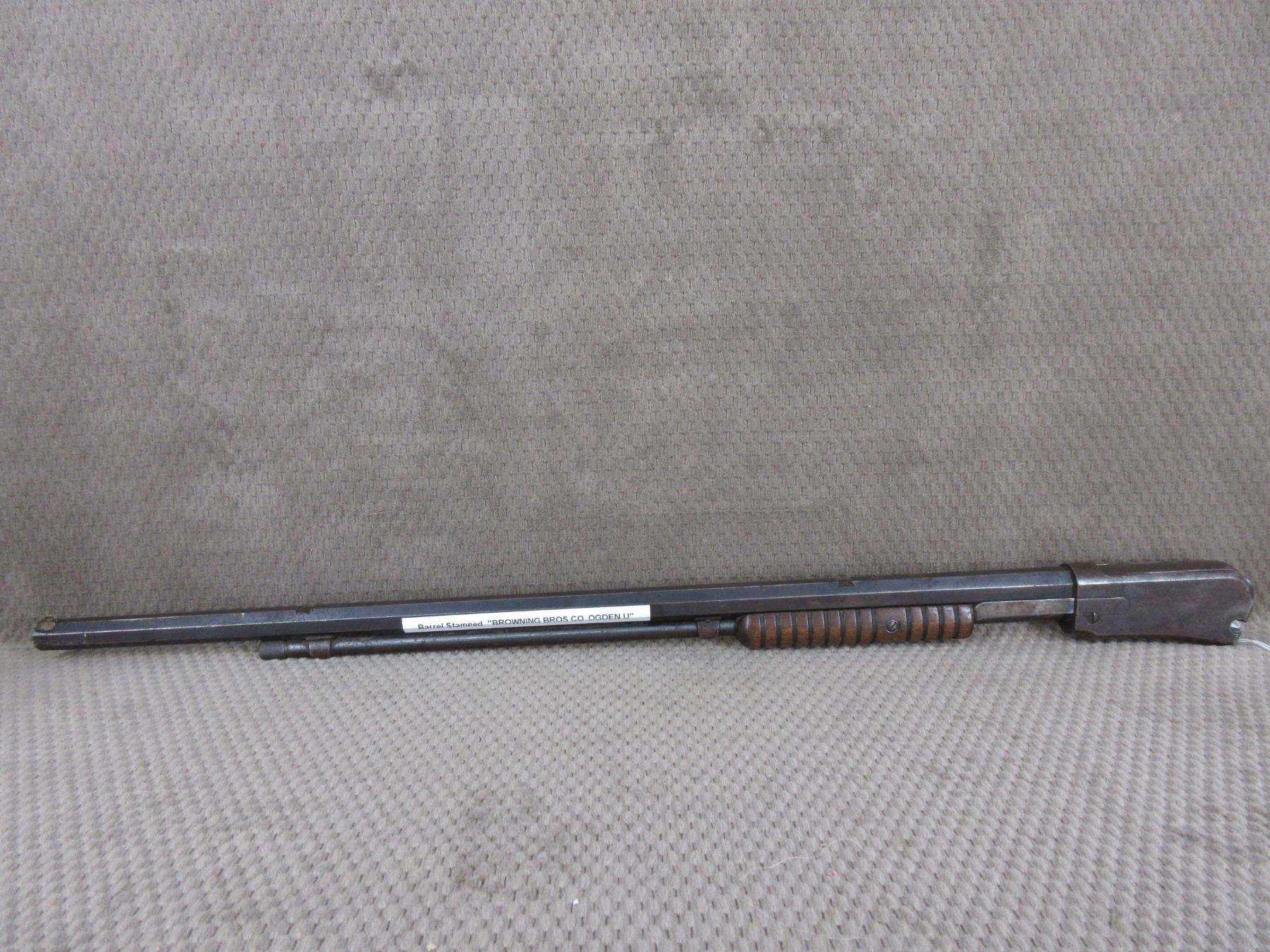 Non-Restricted - Winchester Model 1890 in 22 Long Only - This barrel has 2 addresses on it, 1 the standard Winchester address and the other is Browning Bros. Co. Ogden U. The serial # 273307 puts it as a second model made in 1906. This receiver and barrel of a pump action rifle with tube magazine is in non working order as the trigger assembley and stock portion is missing but what we have appears to work. The octogan barrel is 23 1/4", bluing is brown or gone, rifling is poor, has front sight, missing rear sight, forearm good and has both screws. This was found as is in a farm house in Saskatchewan.