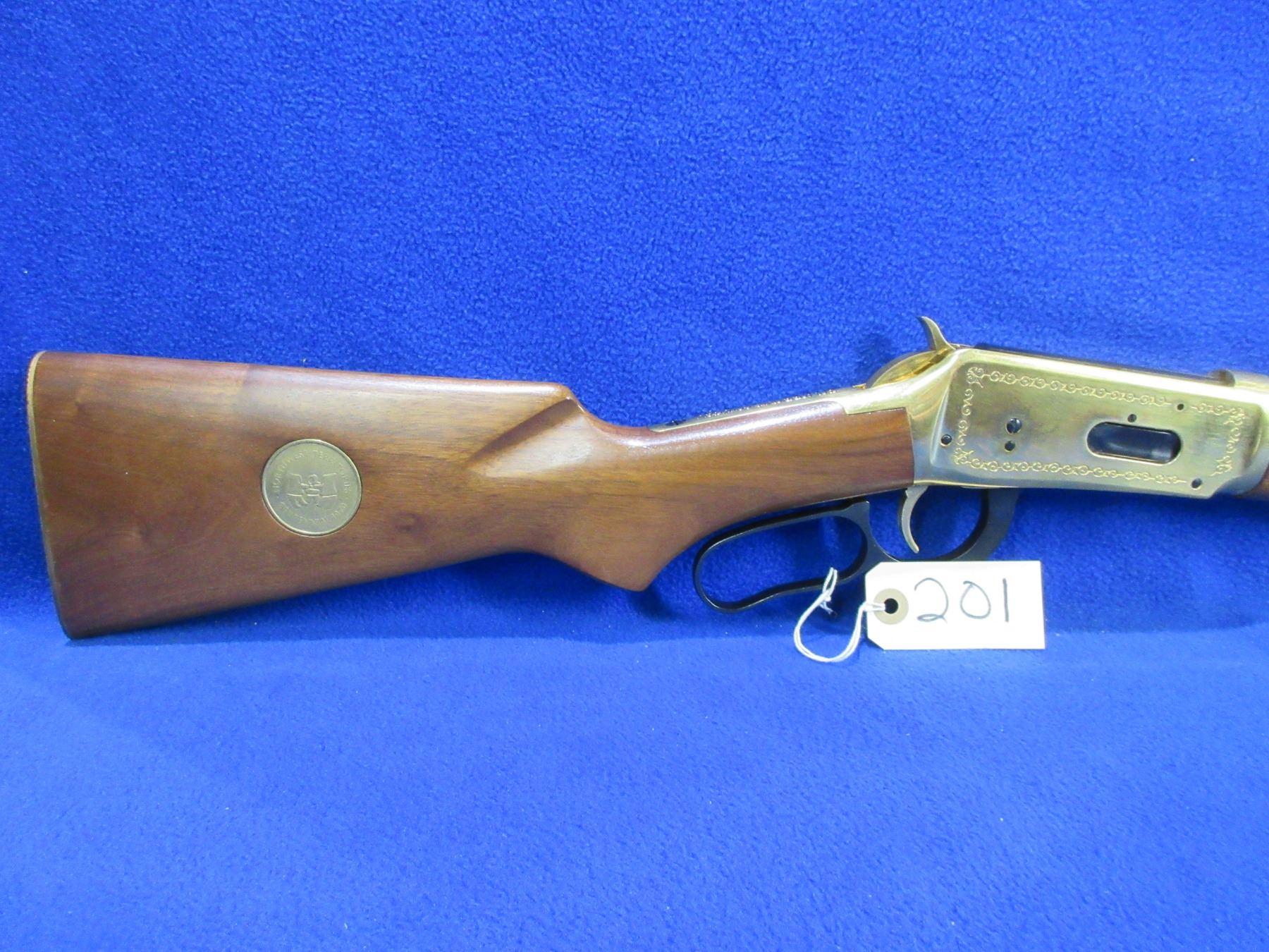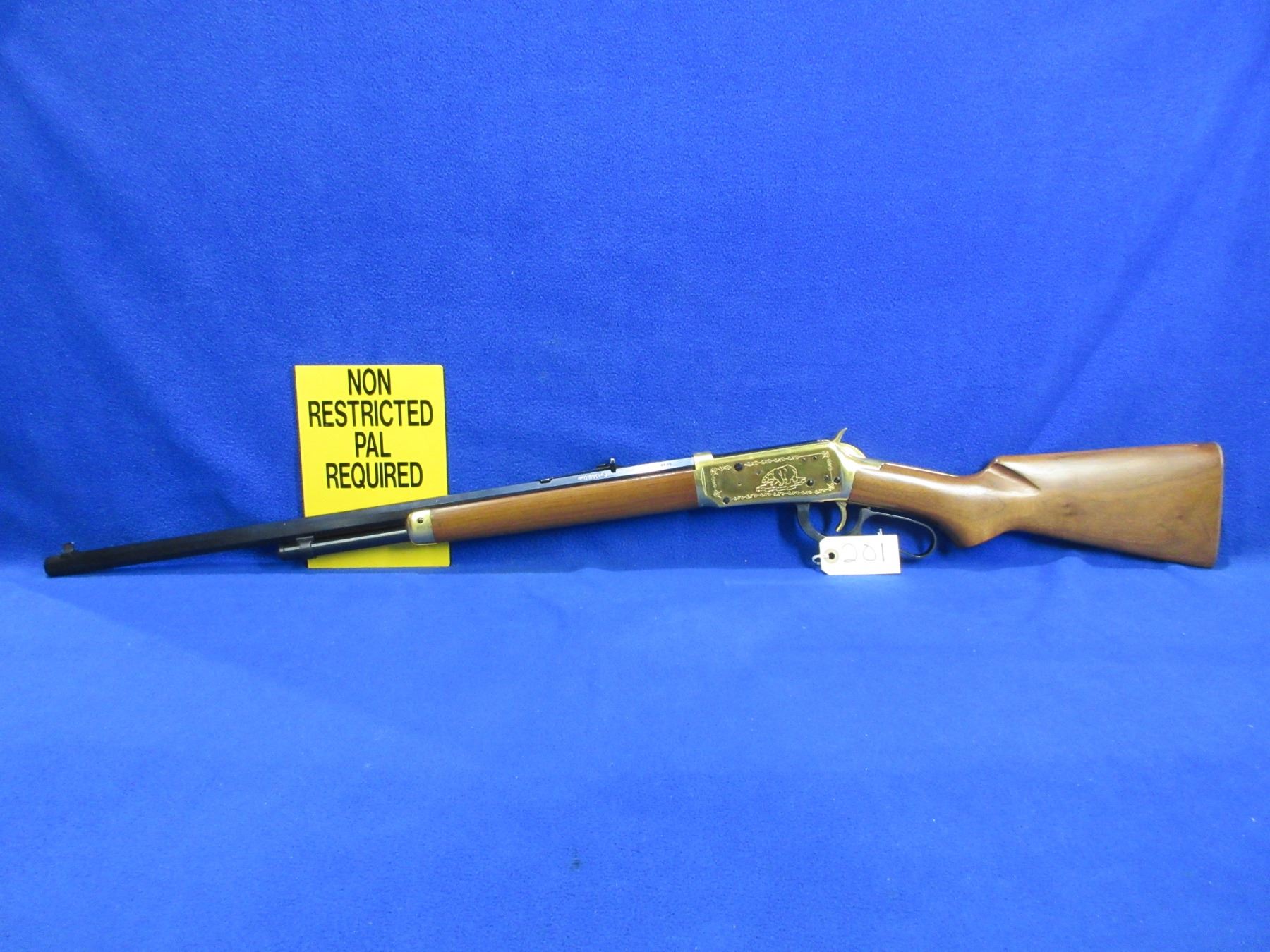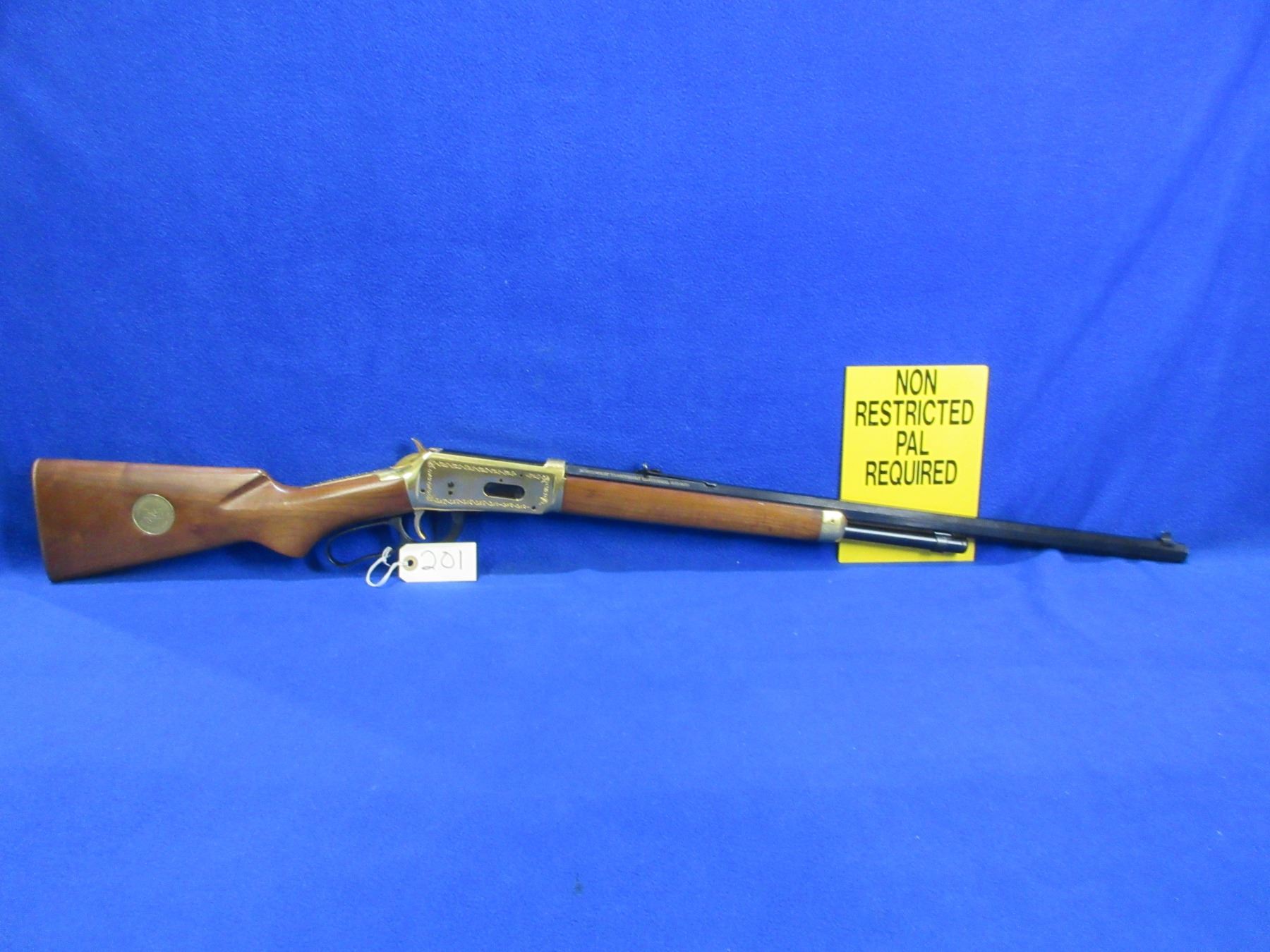 Non-Restricted - Winchester Model 1894 in 30-30 Win - Marked "Northwest Territories Centennial 1870-1970" this is a desirable Canadian commemorative lever action rifle with tube magazine, featuring gold-plated accents, special Arctic engravings (like Nanook the polar bear), a unique medallion, and the "NWT" serial prefix, celebrating the NWT's 100th anniversary as a Canadian territory, gold plated action appears to be in good to very good working order. Octagon barrel is 24", rifling is good to very good, bluing is good to very good, has both sights, stock is good to very good, forearm is good to very good with minor usage marks, length of pull is 13 1/2", gold plated butt plate good. Ser # NWT1700