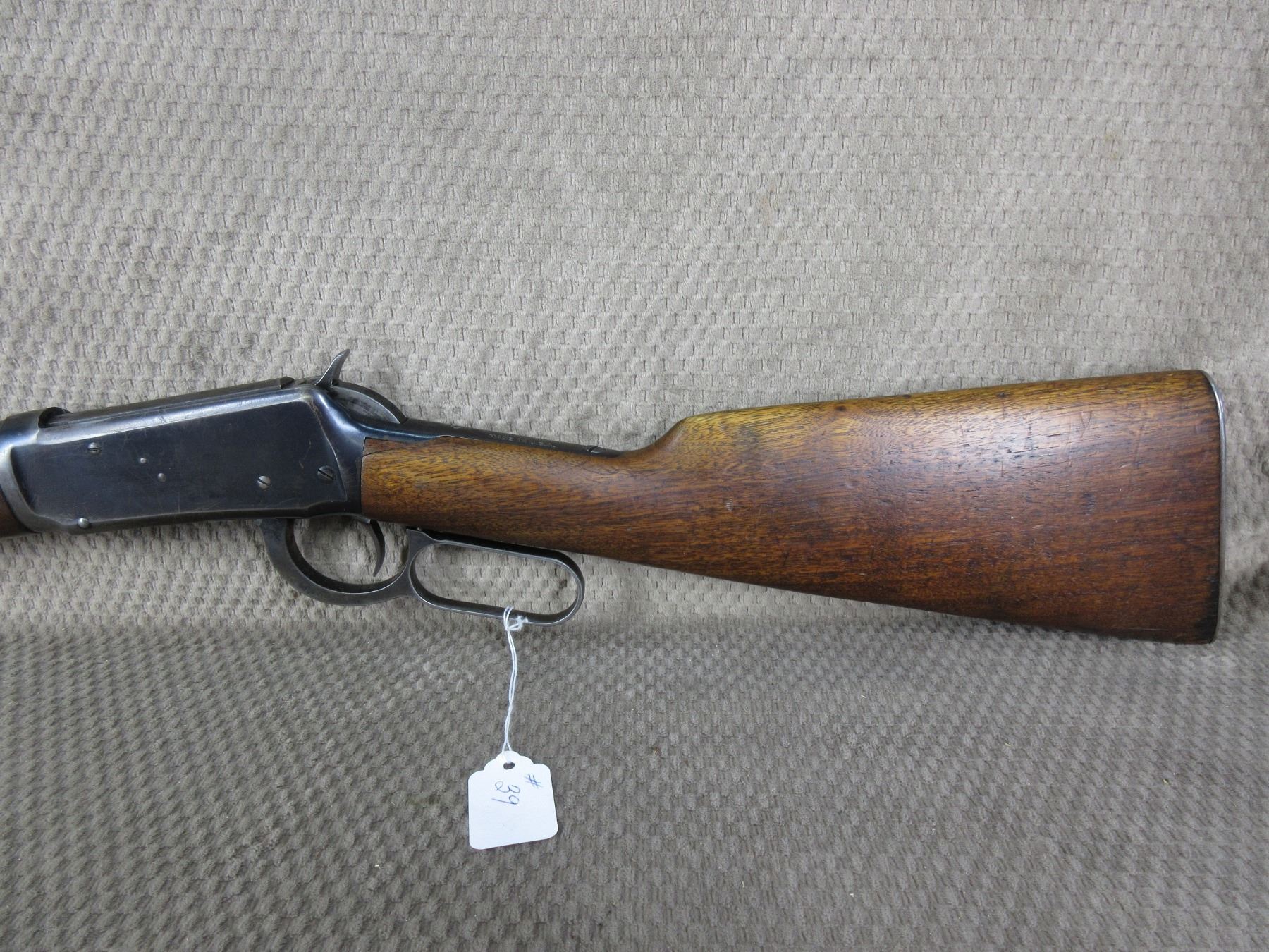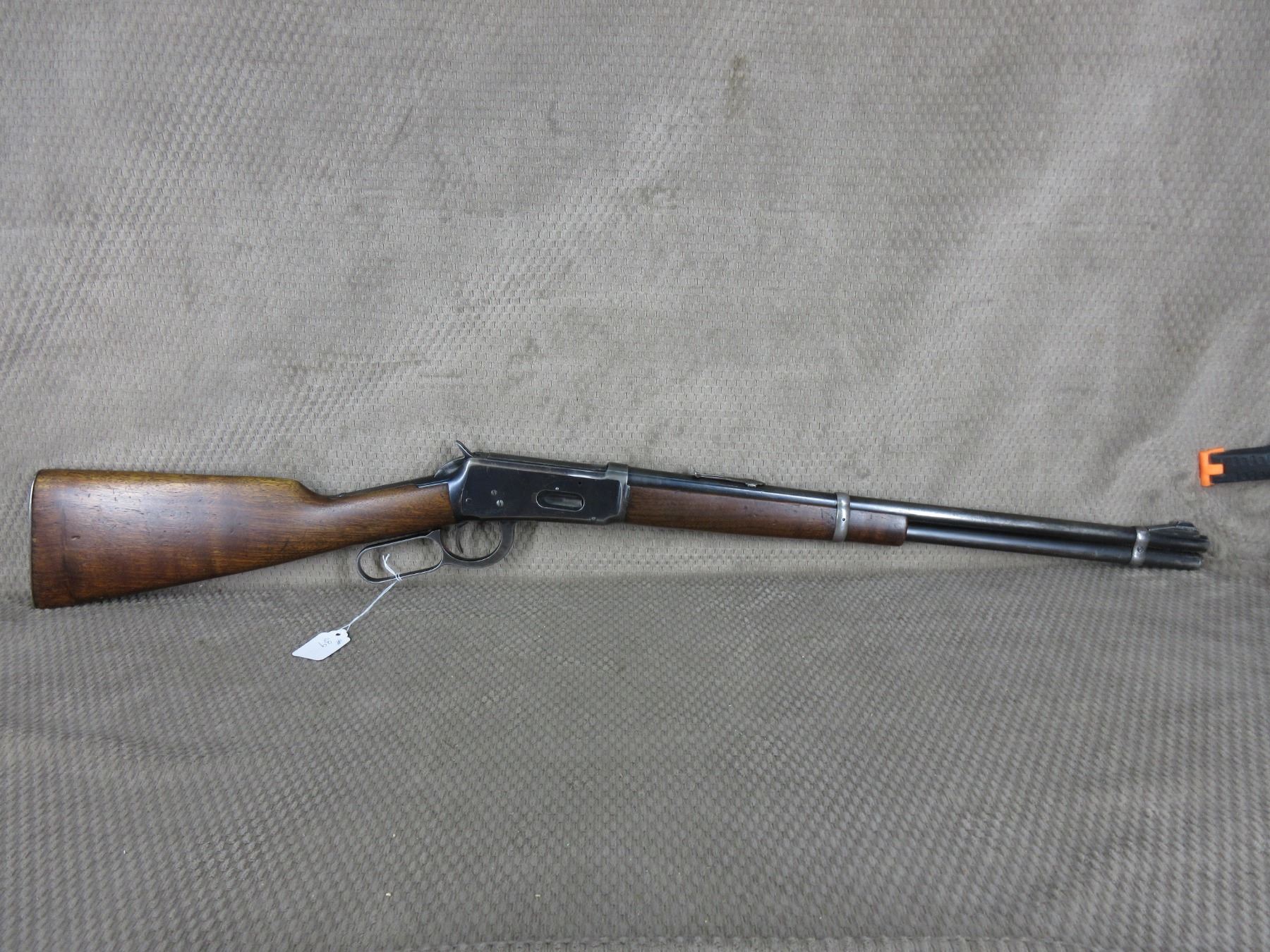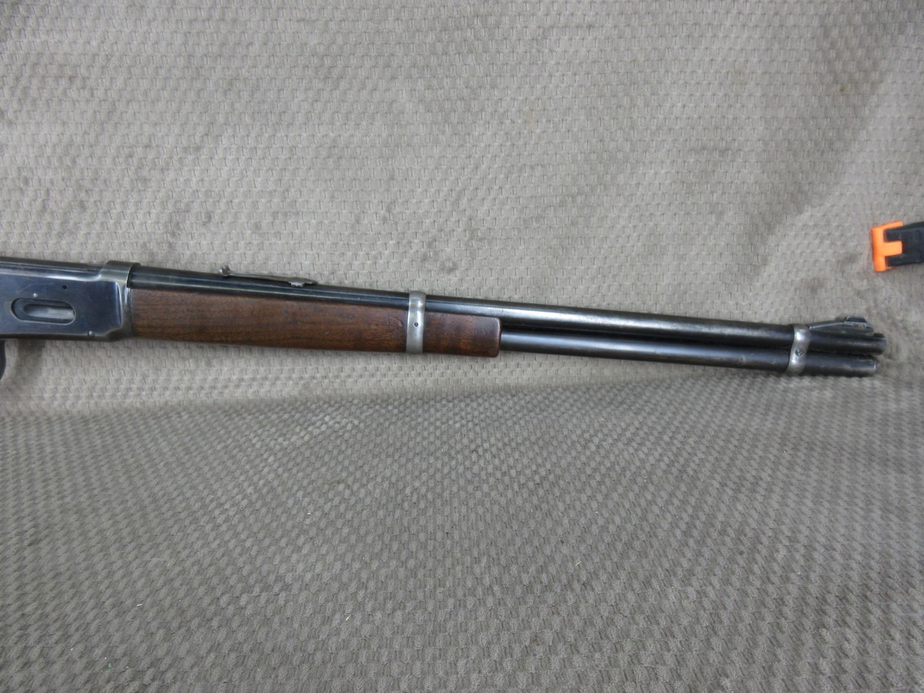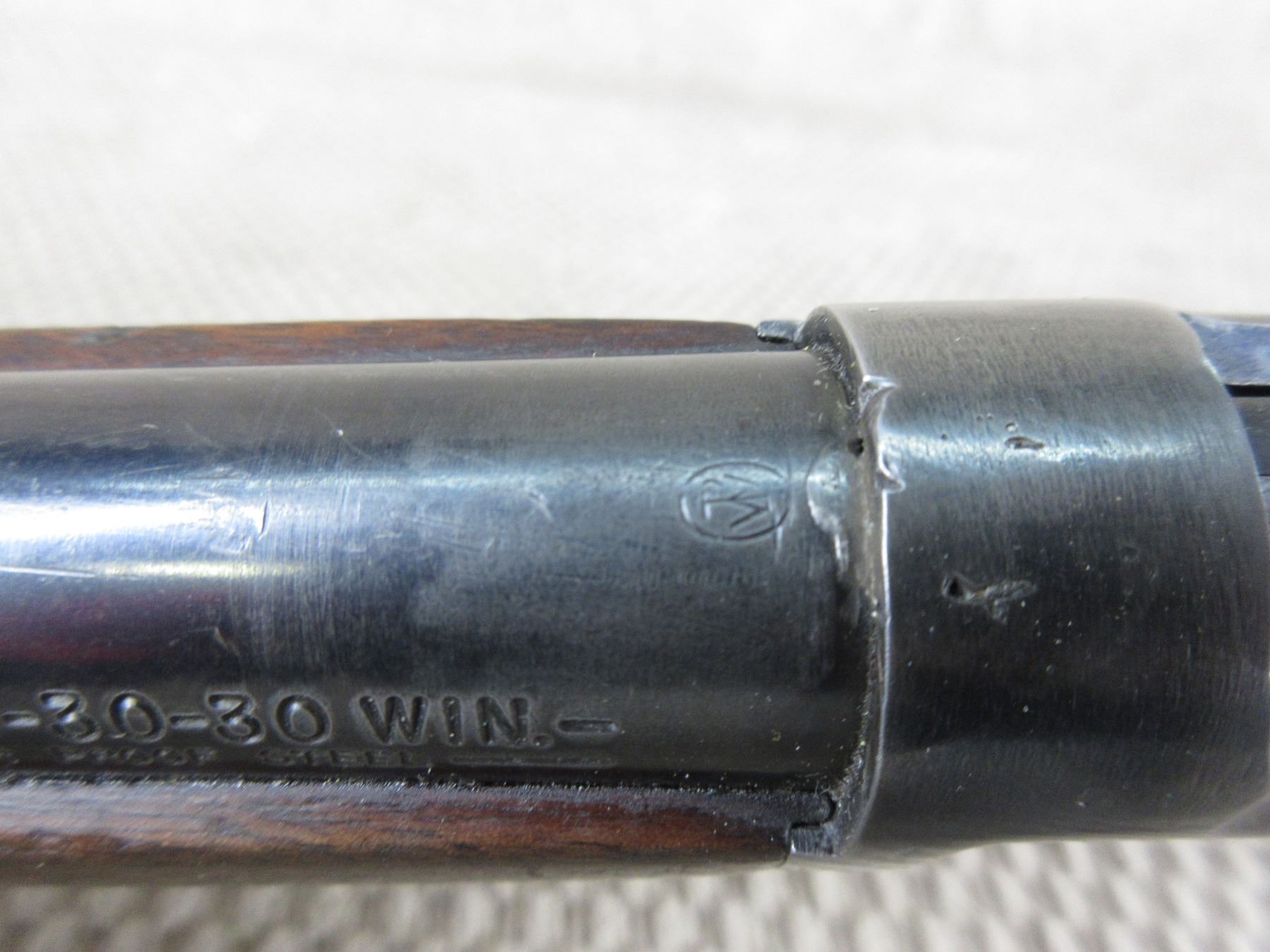Winchester Model 94 Carbine in 30-30 Win - This was made in 1943 but we can't confirm it as that was the war years.  This lever action rifle appears to be in good working order.  Bluing is fair to good with wear in some areas, barrel is 20", rifling is good to very good, has both sights, rear is missing ramp and appears incorrect for gun, wood is good but has fine crack in forarm, metal butt plate, missing swivels.  Has a W stamped below the serial # and someone suggested it means it was a salesman sample.