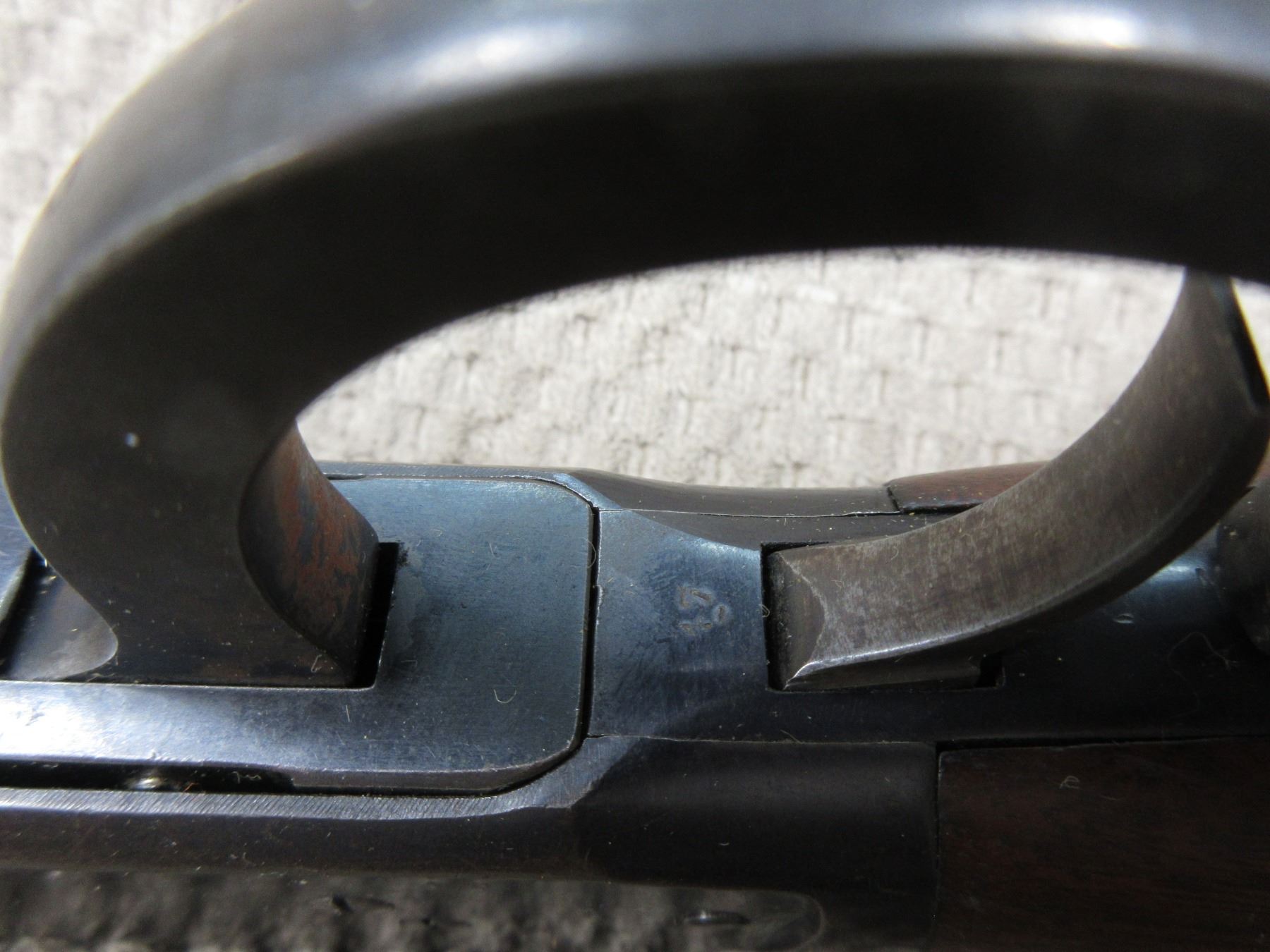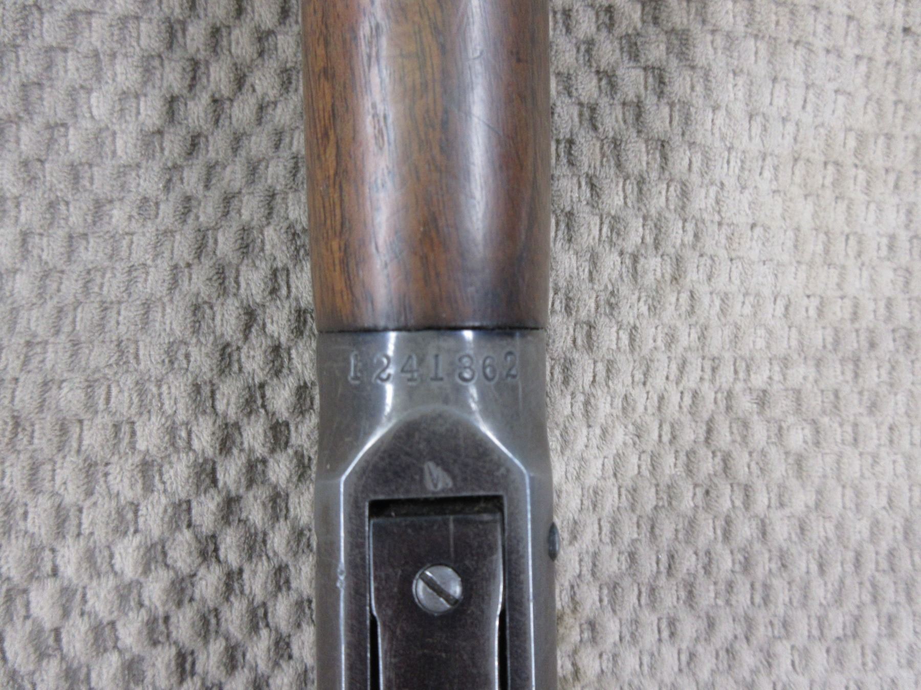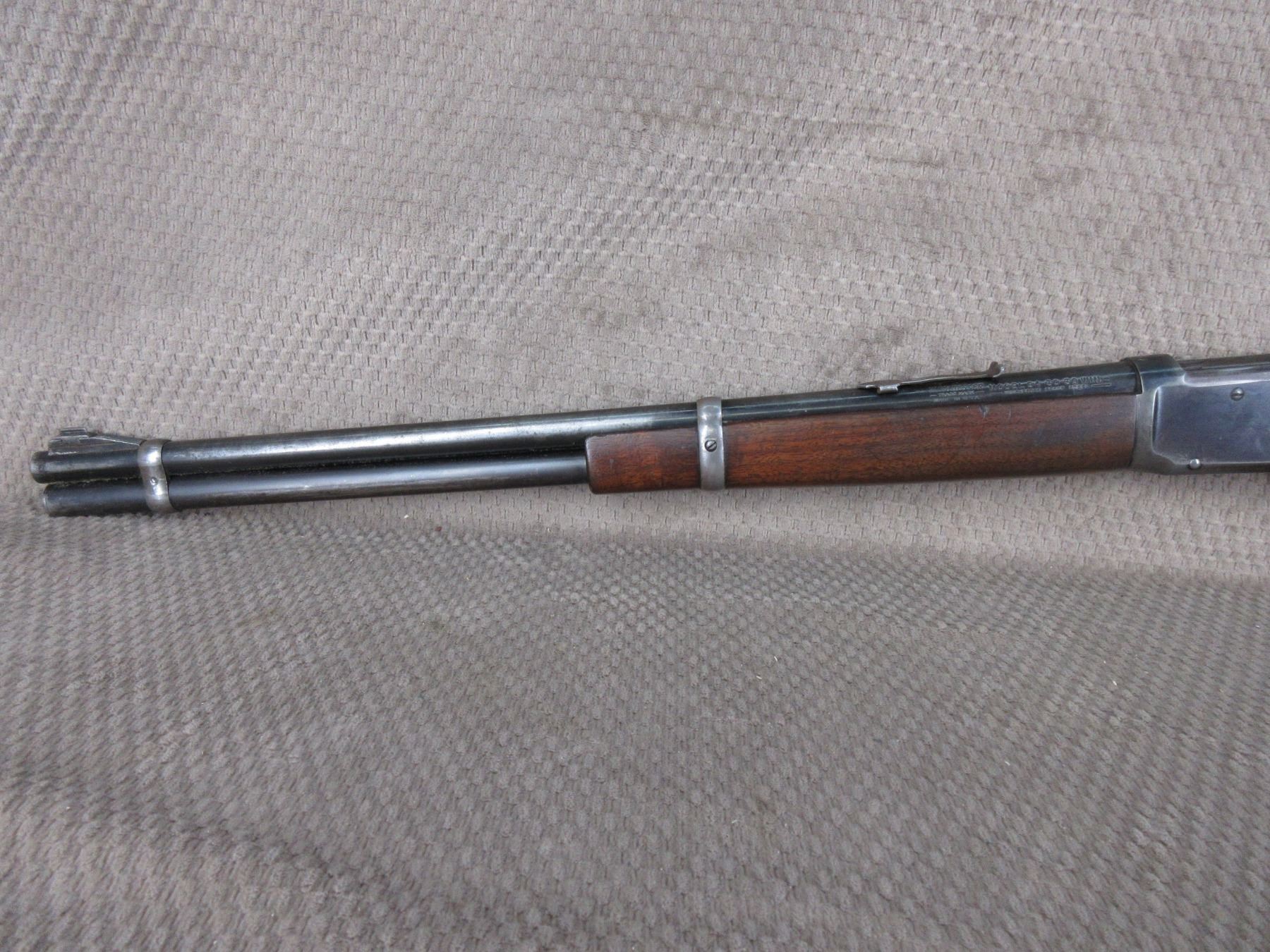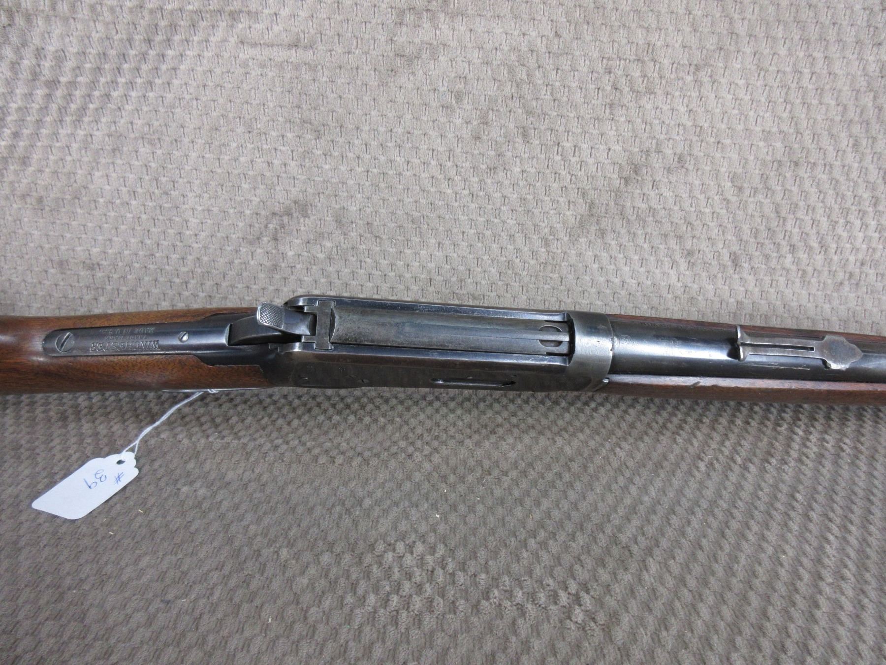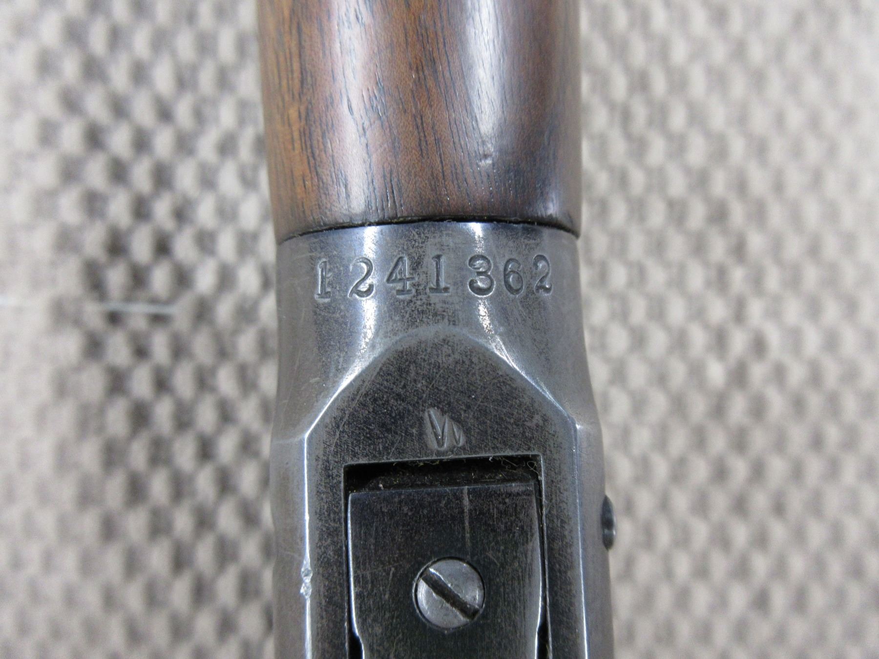 Winchester Model 94 Carbine in 30-30 Win - This was made in 1943 but we can't confirm it as that was the war years.  This lever action rifle appears to be in good working order.  Bluing is fair to good with wear in some areas, barrel is 20", rifling is good to very good, has both sights, rear is missing ramp and appears incorrect for gun, wood is good but has fine crack in forarm, metal butt plate, missing swivels.  Has a W stamped below the serial # and someone suggested it means it was a salesman sample.