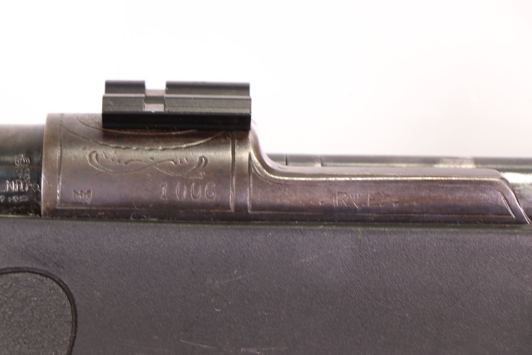 Non-Restricted rifle Husqvarna model Mauser, .30-06 US bolt action, w/ bbl length 24" [Blued barrel and receiver turning brown gray. Fixed front and rear sights, fitted with scope bases. Replacement black polymer stock with recoil pad and textured semi pistol and foregrip. Markings include manufacture and caliber on top of barrel, serial number and proof marks on left rear of barrel, 1006 and upper R and upper E in different areas on left side of receiver. Use, handling and storage marks overall.] serial # 145596, PAL required