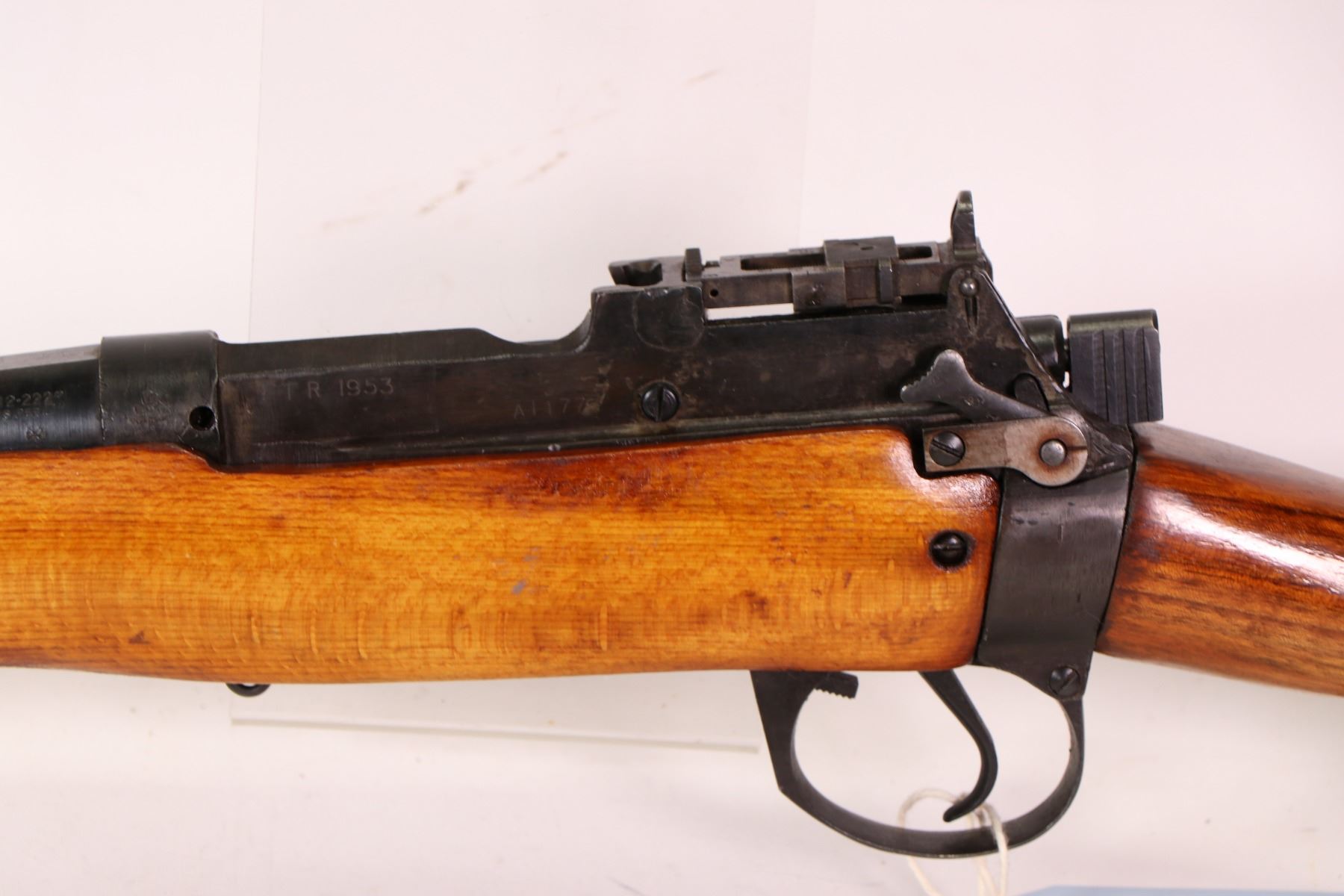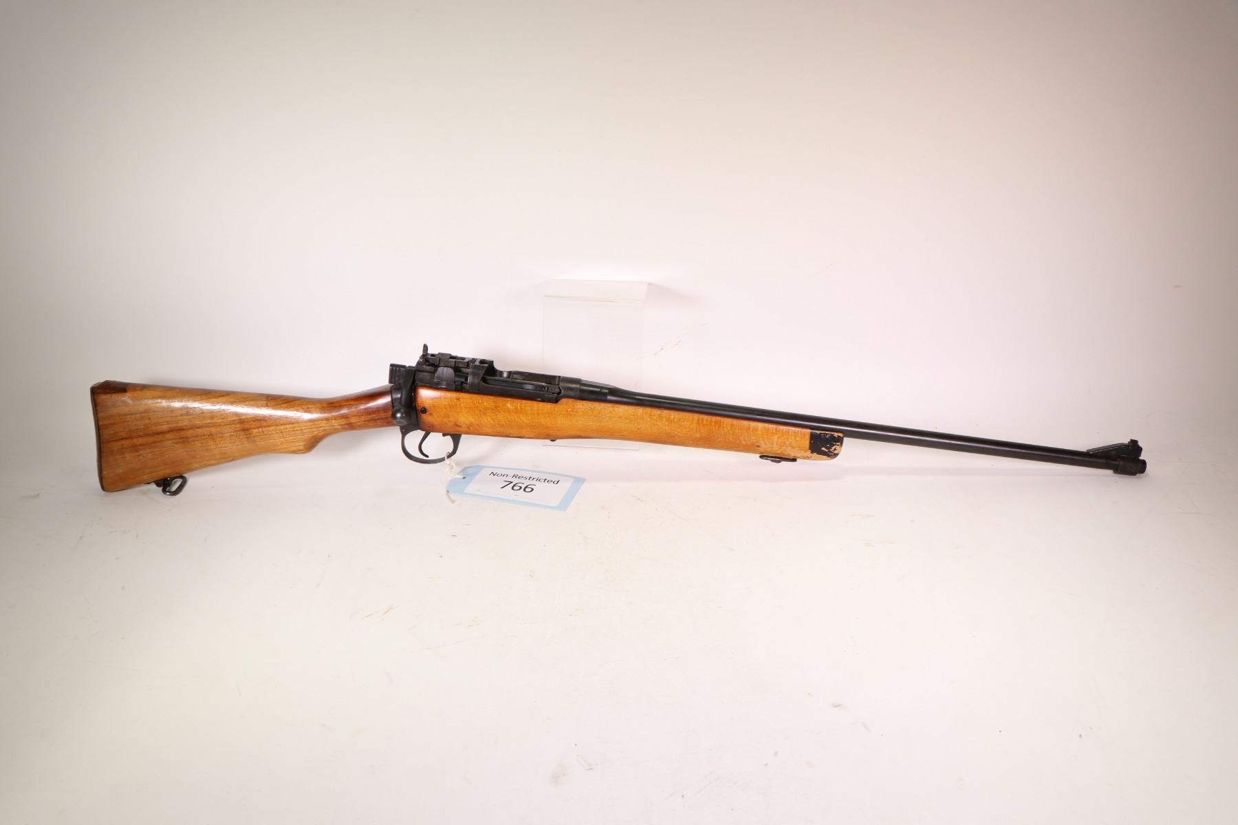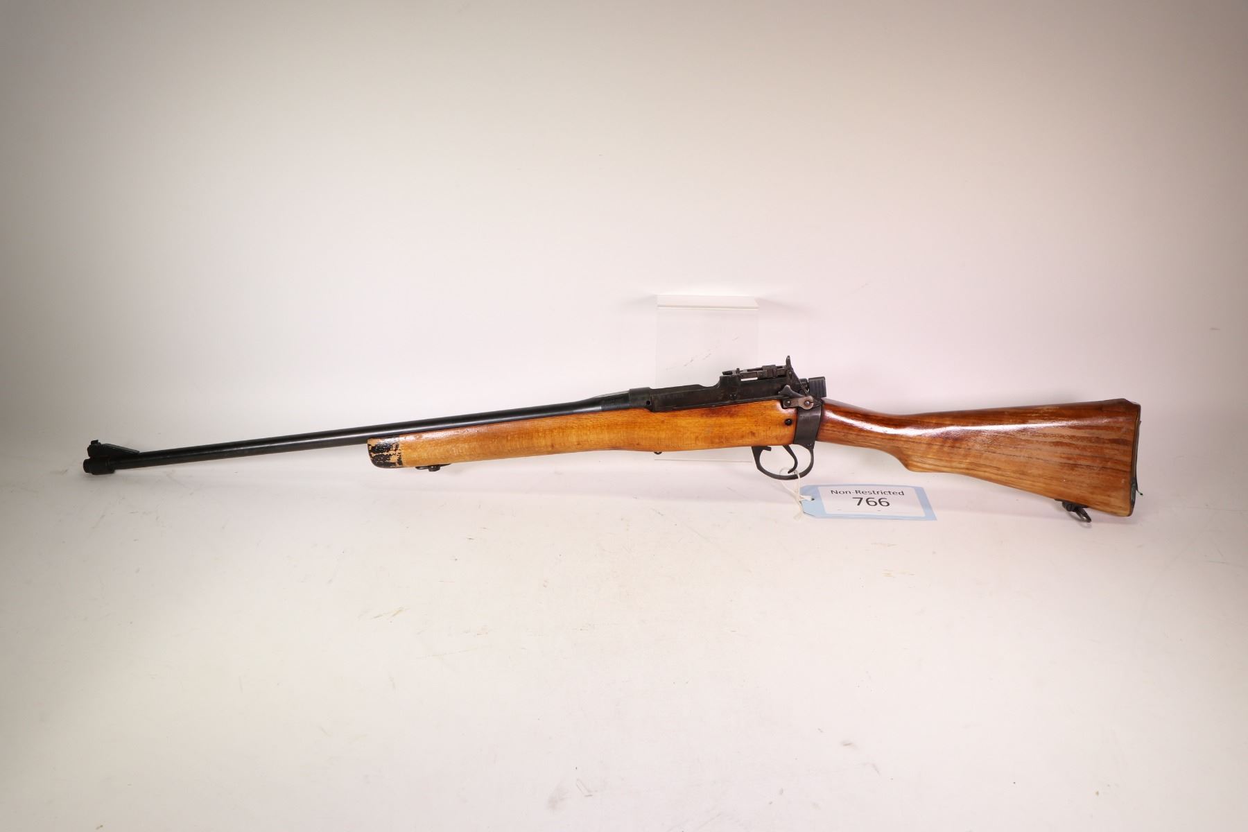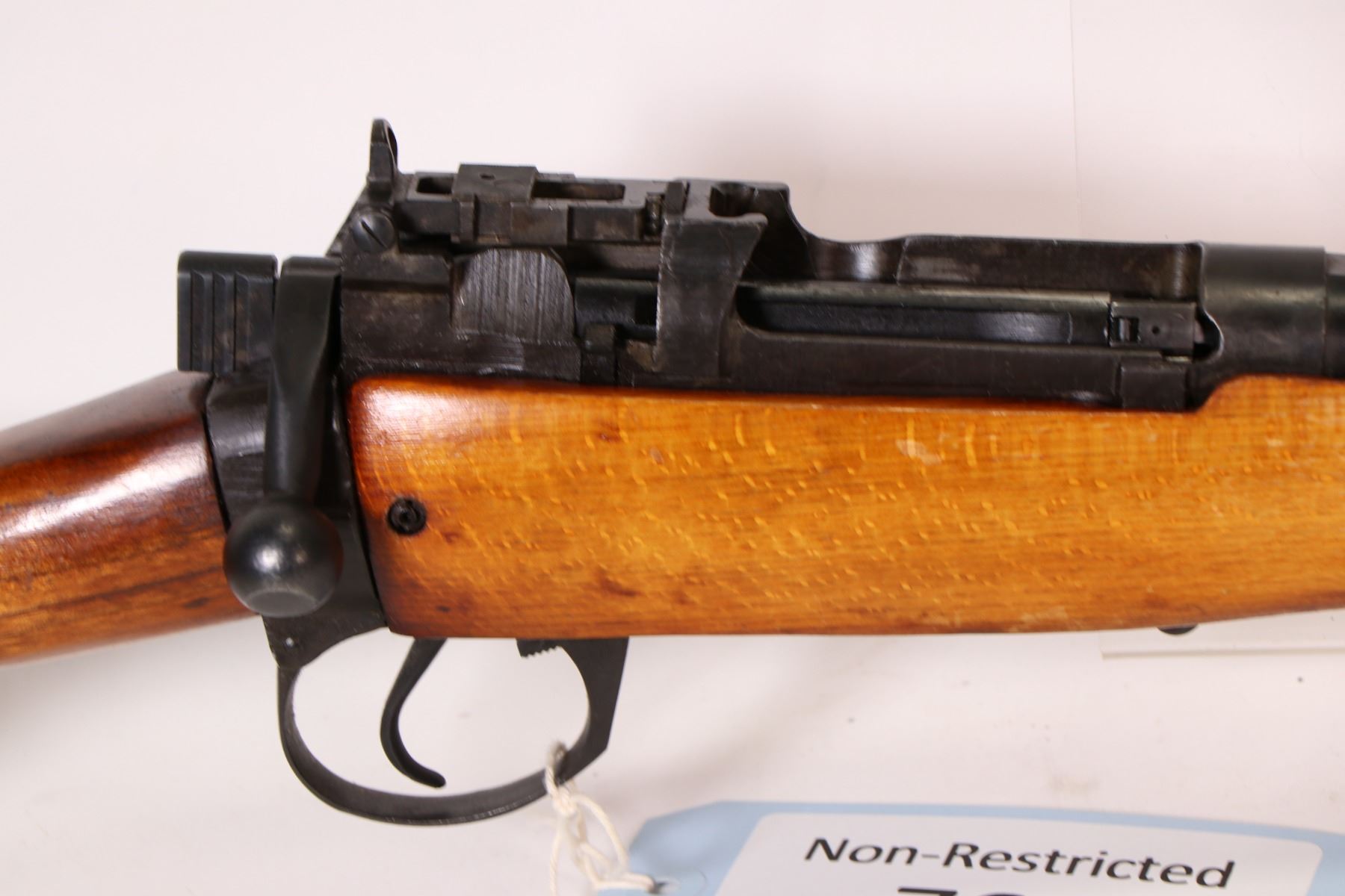Non-Restricted rifle Lee Enfield model Sporterized, .303 Brit ten shot bolt action, w/ bbl length 23" [Blued barrel and receiver. Fixed front and adjustable rear sights. Smooth straight sporterized stock with metal butt plate. Fitted with sling rings. Markings include 1953 on right side of barrel and left side of receiver plus proof marks. Use, handling and storage marks on wood and metal. Note NO magazine included.] serial # A1177, PAL required