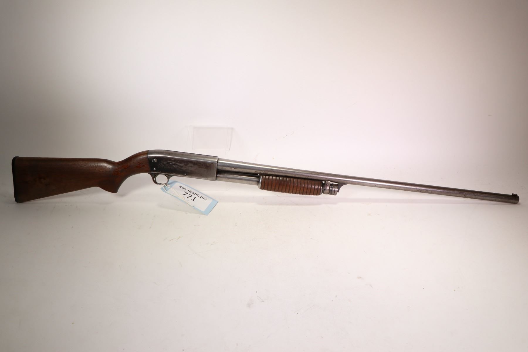 Non-Restricted shotgun Ithaca model Featherlight Model 37, 12 2 3/4" pump action, w/ bbl length 29 1/2" [Blued barrel and receiver. Single front sight missing insert. Smooth walnut stock with poorly fitting plastic butt plate. Corn cob forend. Both sides of receiver engraved, left side with waterfowl and right side with retriever and pheasants. Fixed full choke barrel. Most bluing worn with remaining turning brown gray and most finish worn of stock with use, handling and storage marks to wood and metal.] serial # 5749304, PAL required