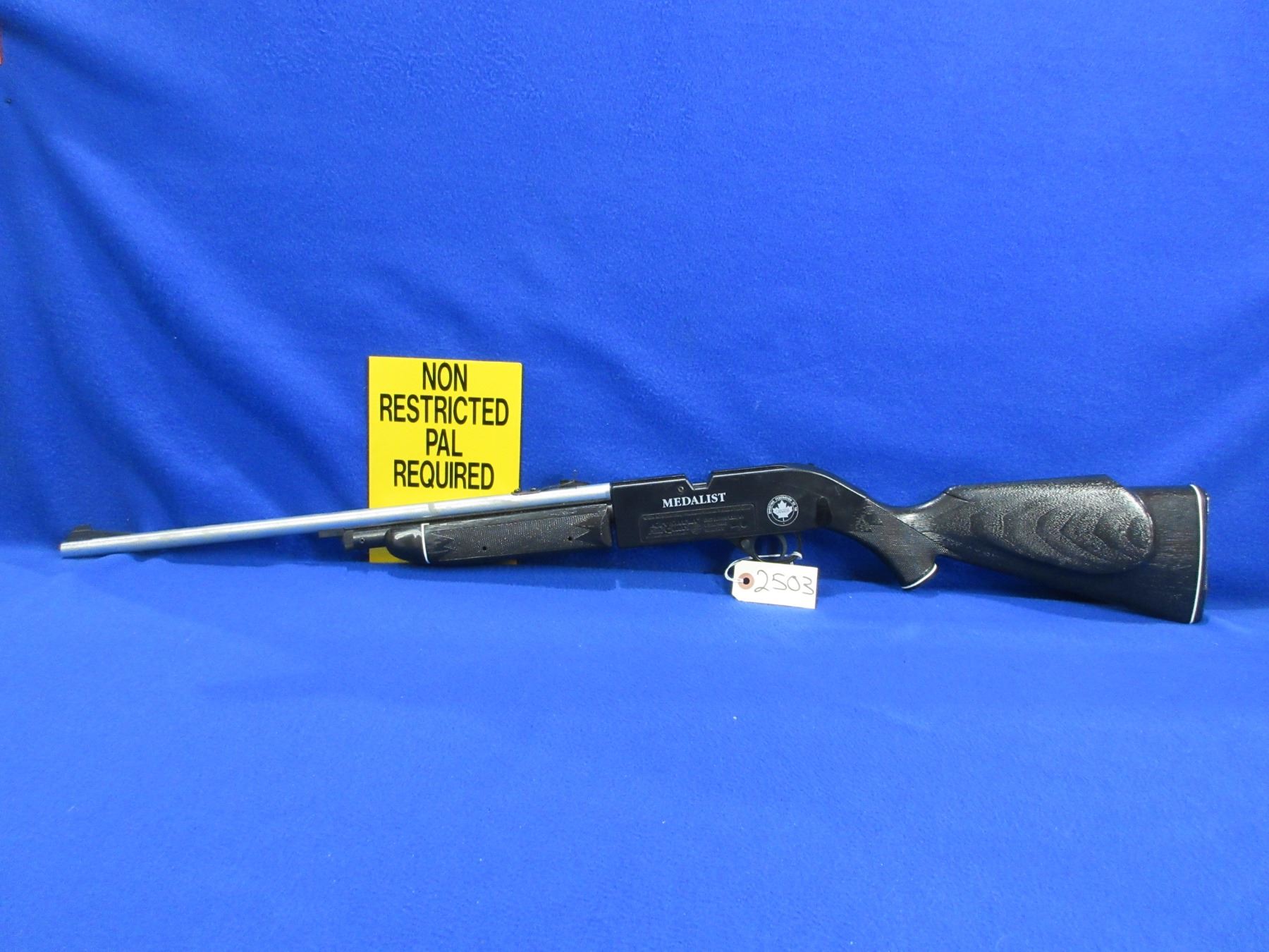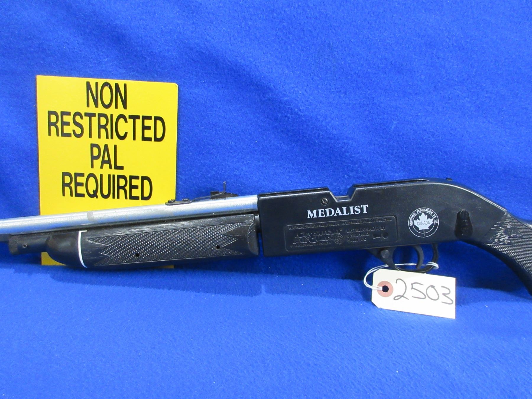Non-Restricted - Crosman Medalist 66 Powermaster in .177 Cal.. - This pump action single shot pellet/BB air rifle appears to be in good to very good working order. Barrel is 21", rifling is good but needs cleaning, silver finish is fair to good, has both sights, synthetic stock and forearm are good to very good, butt plate good. Ser # 894217150