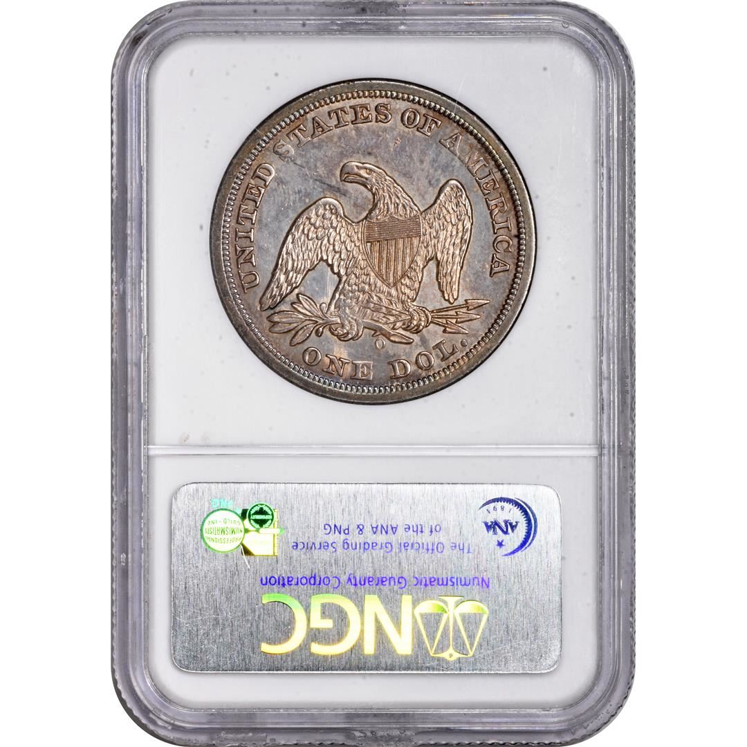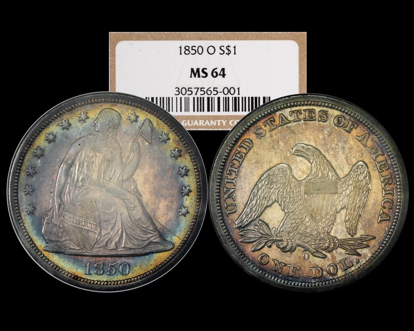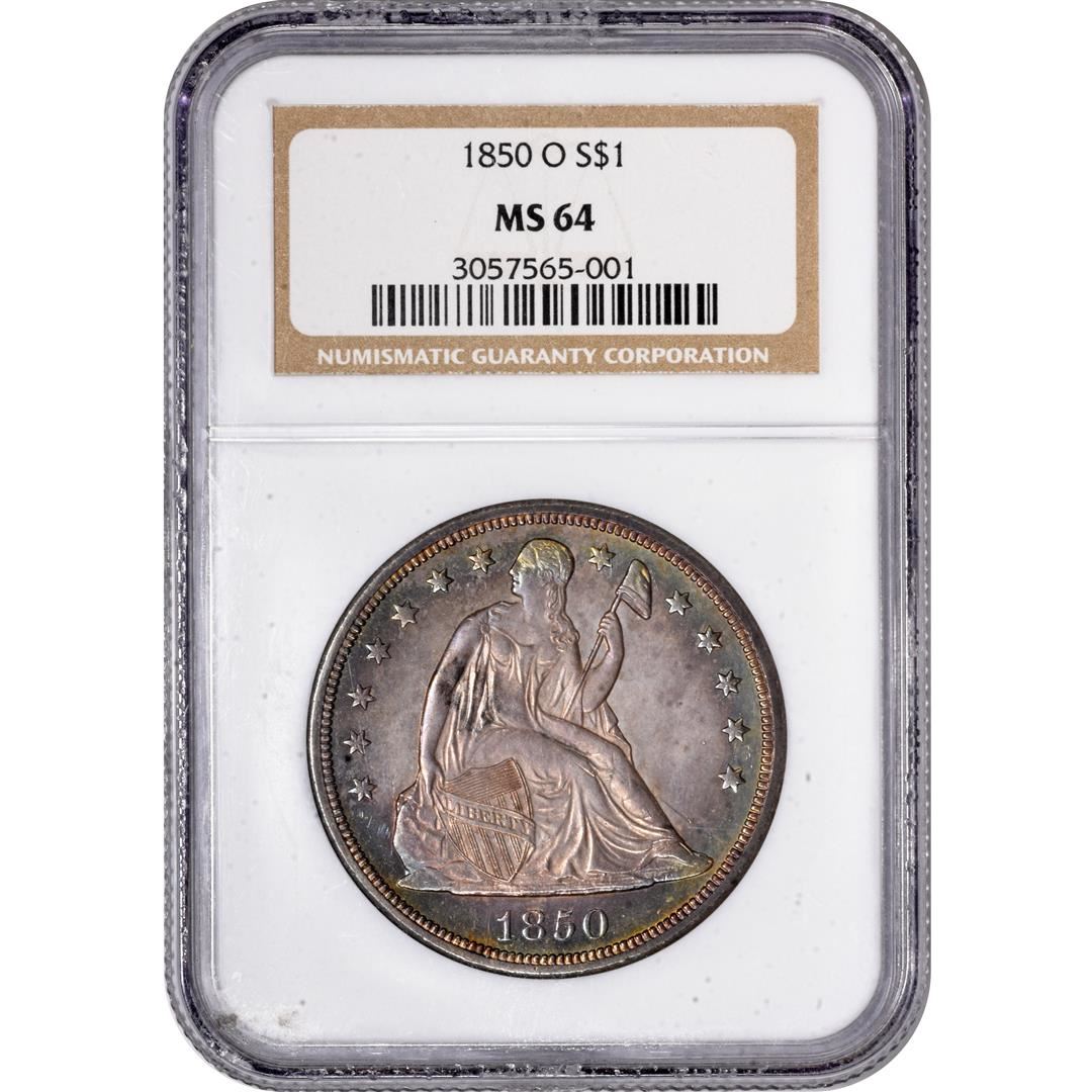 This 1850-O $1 Seated Liberty Dollar Coin NGC graded MS64 with None Finer Known. Remarkable toning graces each side of this near-Gem beauty. The obverse has deeper gray-brown color at the centers, changing to vivid sky-blue with warm sun-gold at the peripheral areas. The reverse is silver-gray, intertwined with gold and lilac hues throughout. The MS64 grade assigned to this piece represents the highest certified grade level of any piece examined by NGC or PCGS. Census: 4 in 64 within NGC. NGC Certified.