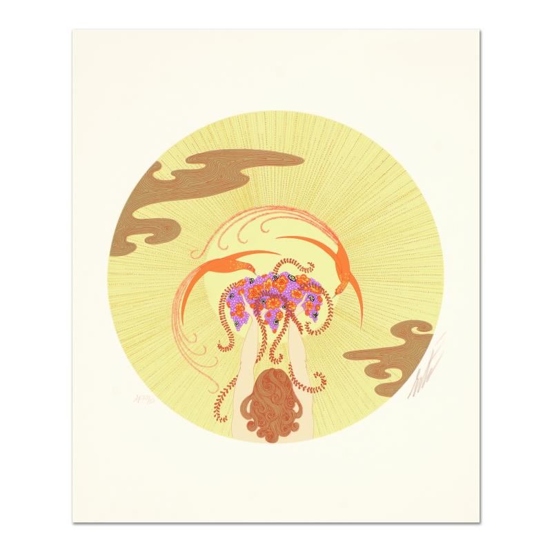 "Noon" is a limited edition serigraph on paper by Erte (1892-1990), numbered and hand signed by the artist. Includes Certificate of Authenticity. Measures approx. 11" x 13.5" (border), 9.5" x 9.5" (image). Due to the age of this piece and the delicate nature of the paper it may have some slight imperfections.