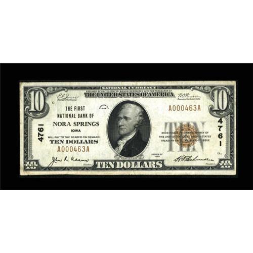 <B>Nora Springs, IA</B></I> - $10 1929 Ty. 1 <B>The First NB</B></I> Ch. # 4761<BR> Deeply printed devices accent the bright white paper. There is a bit of a skin mark on the face, though it affects nothing. <B>Fine-Very Fine.</B></I><BR><BR><b>Shipping:</b> Coins & Currency (<a target="_blank" href="http://www.heritageauctions.com/common/shipping.php">view shipping information</a>)