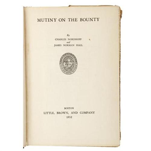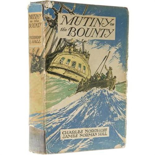 <B>Charles Nordhoff & James Norman Hall: <I>Mutiny on the Bounty</B></I>.</B></I> (Boston: Little, Brown, and Company, 1932), first edition, second issue, 396 pages, blue cloth with silver lettering and decoration on the spine and front board, 8vo (5.5" x 8.25"), dust jacket. Book is in good condition; the dust jacket is fair, with some paper loss on the spine and rough edges.<BR><BR><b>Shipping:</b> Books & Catalogs (<a target="_blank" href="http://www.heritageauctions.com/common/shipping.php">view shipping information</a>)