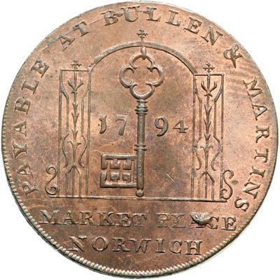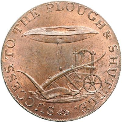 Norfolk. Norwich. Halfpenny, 1794. D&H-19. Edge: Plain. A key suspended from an iron archway. Reverse: A plough and shuttle. NGC graded MS-65 Red & Brown.