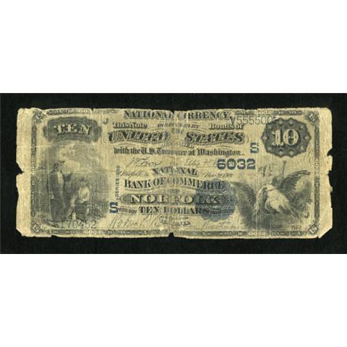 <B>Norfolk, VA</B></I> - $10 1882 Value Back Fr. 577 <B>The NB of Commerce</B></I> Ch. # (S)6032<BR> Signatures remain on this $10 that has a large repair at back center. A numeric five-digit stamping is also seen on the back. <B>Good</B></I>.<BR><I>From The Kansas City Collection</B></I><BR><BR><b>Shipping:</b> Coins & Currency (<a target="_blank" href="http://www.heritageauctions.com/common/shipping.php">view shipping information</a>)