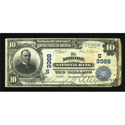 <B>Norfolk, VA</B></I> - $10 1902 Plain Back Fr. 624 <B>Norfolk NB</B></I> Ch. # (S)3368<BR> The lower right margin is a touch rough and the signatures are bold. <B>Very Fine.</B></I><BR><BR><b>Shipping:</b> Coins & Currency (<a target="_blank" href="http://www.heritageauctions.com/common/shipping.php">view shipping information</a>)