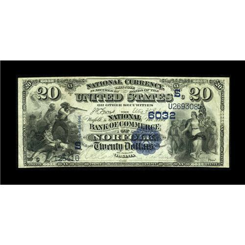 <B>Norfolk, VA</B></I> - $20 1882 Value Back Fr. 581 <B>The NB of Commerce</B></I> Ch. # (S)6032<BR>This type and denomination has been traced from just eight banks in the entire state. This is just the fifth $20 Value Back to surface from here. Tonight's example is a nicely margined <B>Very Fine</B></I> with purple stamped signatures.<BR><I>From The George P. Hammerly Collection</B></I><BR><BR><b>Shipping:</b> Coin/Currency (<a target="_blank" href="http://www.heritageauctions.com/common/shipping.php">view shipping information</a>)