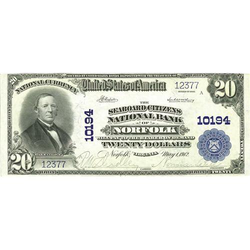 <B>Norfolk, VA</B></I> - $20 1902 Plain Back Fr. 654 <B>The Seaboard NB</B></I> Ch. # 10194<BR>Previously this note appeared in our 2005 Central States Signature Sale where it was described, "A bright <B>Crisp Uncirculated</B></I> Third Charter that would have bordered on Gem but for the slightly cut in top margin. This bank was the last from here to gain a federal charter and issued under two titles. This was the second. It remains a fresh and bright example of its design type..." With even more demand for uncirculated Nationals today, we fully expect it to surpass the $460 it realized then.
