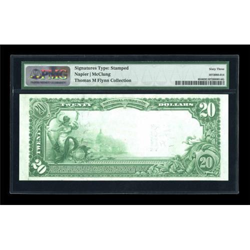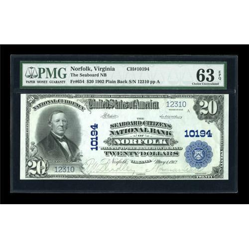 <B>Norfolk, VA</B></I> - $20 1902 Plain Back Fr. 654 <B>The Seaboard NB</B></I> Ch. # 10194<BR> A lovely example for type, with this piece earning the PMG grade of <B>Choice Uncirculated 63 EPQ. </B></I><BR><I>From The Thomas M. Flynn Collection</B></I><BR><BR><b>Shipping:</b> Coins & Currency (<a target="_blank" href="http://www.heritageauctions.com/common/shipping.php">view shipping information</a>)