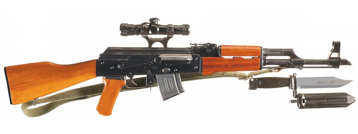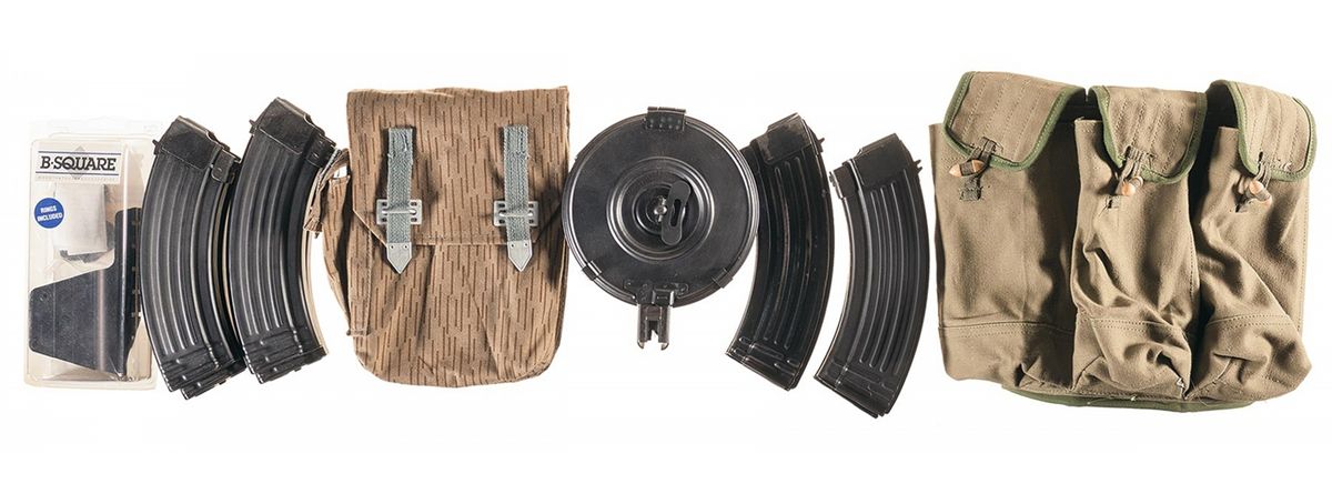 Manufactured in China and imported by Import Arms of Sacramento, California. Stamped receiver, post and tangent sights, with the "factory 66" triangle stamp on the left side of the receiver and import marks on the underside. A Russian-style scope base has been installed on the left side, with a Chinese-made 4x20 scope. Included with the rifle is an original shipping box, bayonet with scabbard, 2 sight adjustment tools, seven extra 30 round stick magazines, one 50 round drum magazine and two magazine pouches; one belt model and one chest pouch.