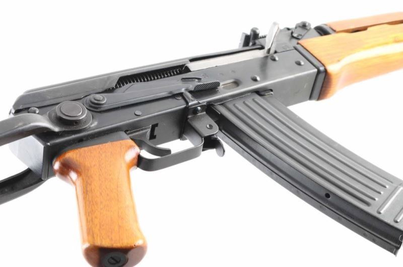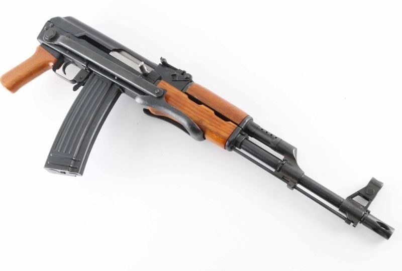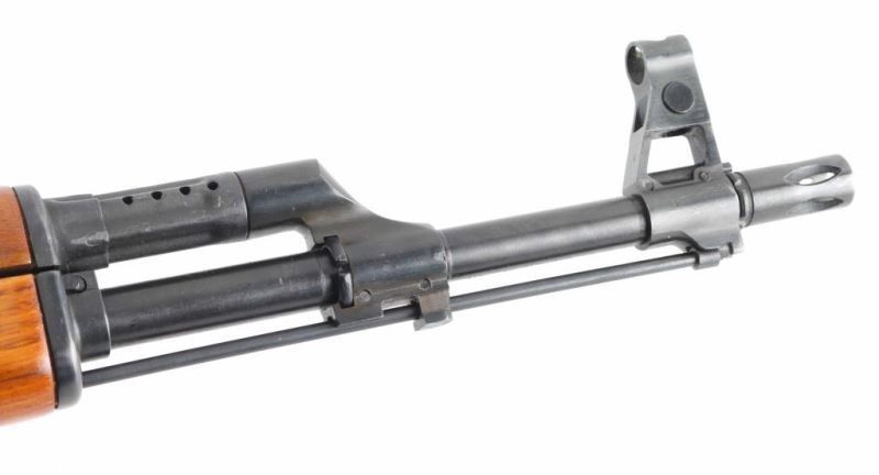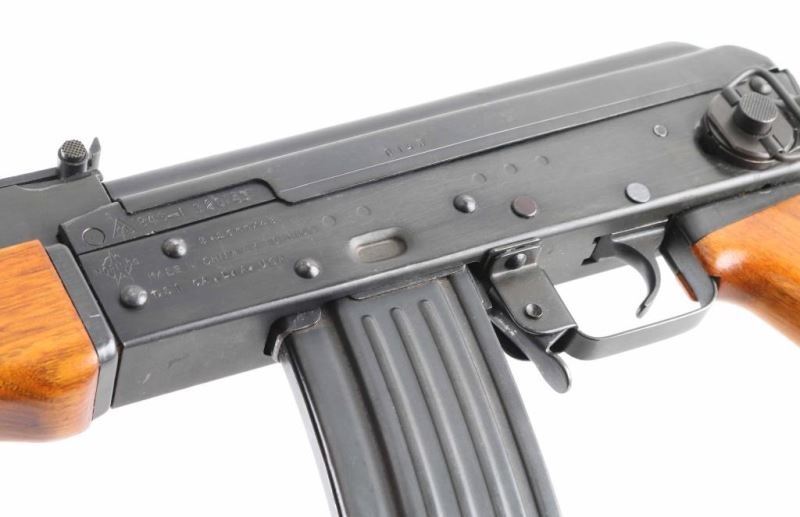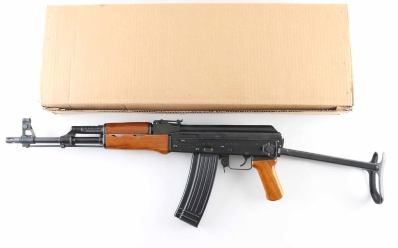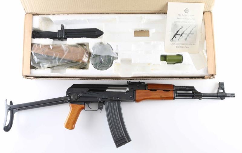 Chinese semiautomatic rifle imported by CSI, LA, CA. Based on AK-47/AKM design. Features blued finish, bright metal bolt & carrier, 16" threaded barrel with 6 flute flash hider installed, cleaning rod, bayonet lug, protected post front sight, tangent rear sight, accepts detachable magazines, manual safety, under-folding stock, smooth wood hand guards and pistol grip, sling loop on gas block, sling swivel on receiver rear. Observed numbers match. Bore is very good condition, appears hard chrome lined. Retains 95% blue with scratches on folding stock, bare metal where stock rubs against receiver & on high spots and sharp edges. Wood is very good condition with handling marks, small dents. Includes original box, (4) 30 rd magazines, green cotton web sling, black handled bayonet with black scabbard, manual. Condition is NRA Very Good++ *** Modern Firearm ***