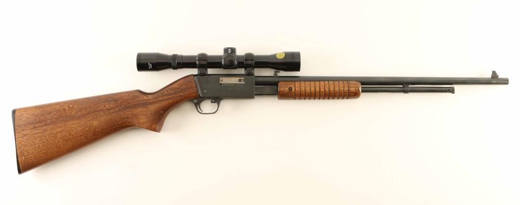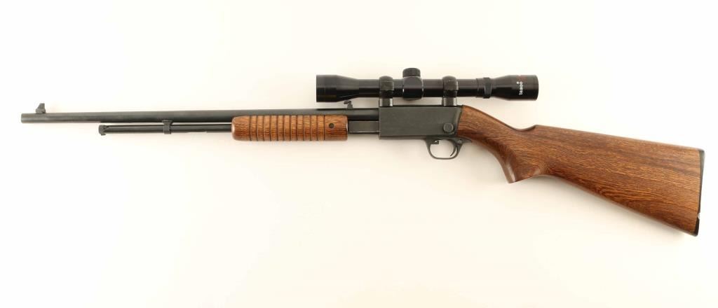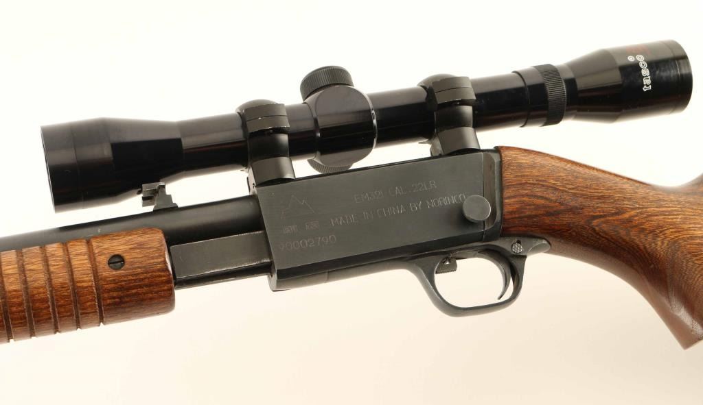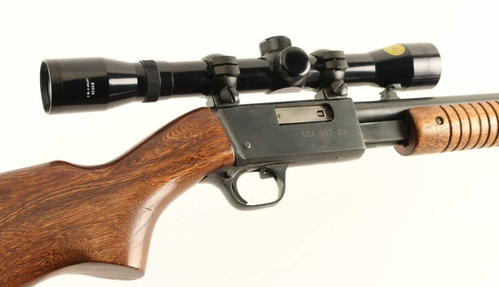 Chinese pump action rimfire rifle chambered for 22LR, imported by CSI Ontario CA. Features approx 19.5 inch barrel, tube magazine, folding adjustable rear sight, manual safety, slide lock release lever inside triggerguard. Takedown screw through receiver allows separation into two halves. Bore is excellent. Retains 98% bluing with bare metal visible on sharp edges, especially at action bars where they rub during operation. Wood is in excellent condition with tiny chip at toe near buttplate. Plastic buttplate has a small gouge out of left side near the toe. Mounts a Tasco brand 4x32 scope (made in Japan), using the integral receiver dovetail. Scope view is bright and clear with duplex style crosshair. Condition is NRA Excellent ***Modern Firearm***