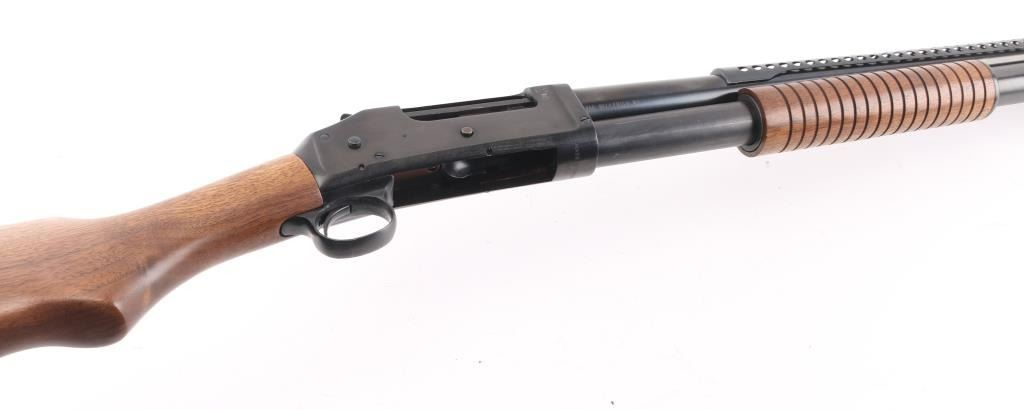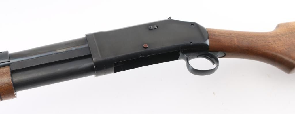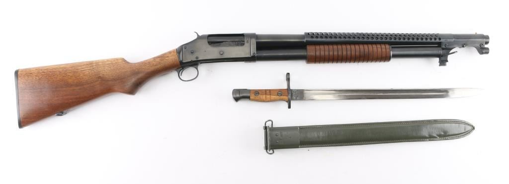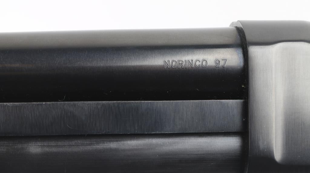 Chinese made copy of the Winchester 1897 slide action repeating trench shotgun, manufactured by Norinco for IAC, Billerica MA. Chambered for 2 3/4" 12 gauge shells. Features a blued finish, 20 5/16" barrel, fixed MOD choke, ventilated heat shield with brass bead front sight & bayonet lug, sling swivels, 5 round tube magazine, smooth trigger, exposed hammer with knurled spur, single action bar, grooved walnut slide handle, and smooth semi-pistol grip shoulder stock with checkered polymer buttplate & 13.75” LOP. Replica "US" & flaming bomb ordnance mark on right side of receiver. Bore is very good. Retains 95% finish with minor handling marks, rubbing wear from operating the action. Wood is excellent with few small blemishes. Includes replica M1917 bayonet (22" overall, with scabbard). Condition is near NRA Excellent *** Modern Firearm ***