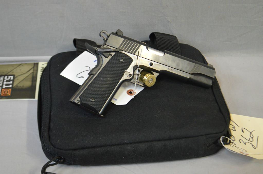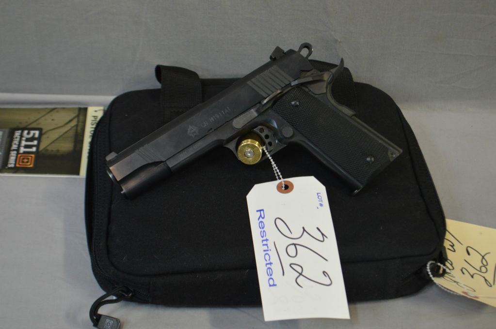 Norinco Model 1911 A1 .45 Auto Cal 7 Shot Semi Auto Pistol w/ 127 mm bbl [ appears v- good, blued finish, White Dot rear sight, Yellow Dot front sight, wooden checkered grips, c/w soft black 5.11 Tactical Series Pistol Case w/hanging tag, w/ four extra used mags ] Ser # BA26374 Restricted Handgun Cert # tci