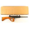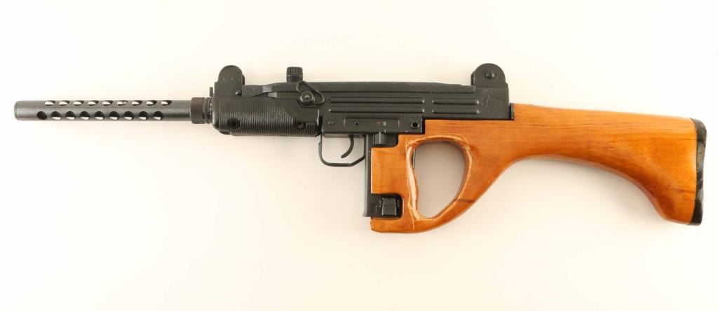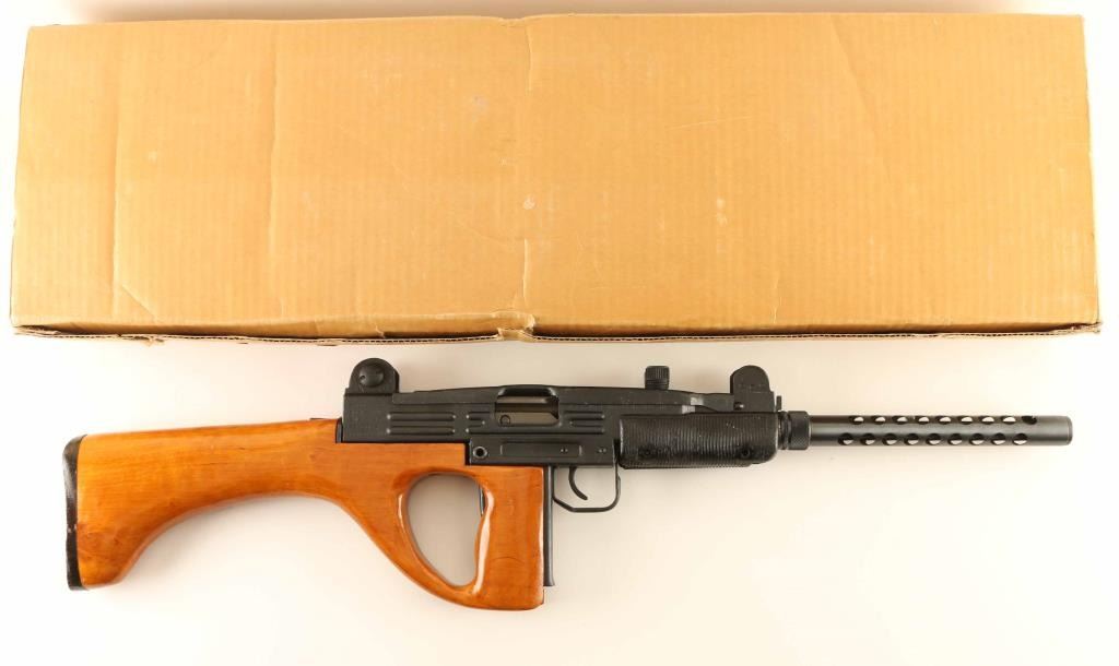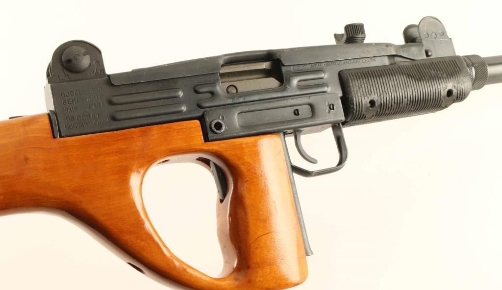 Chinese semiautomatic carbine chambered for the 9x19mm Luger cartridge, imported by ACC International / Intrac, Knoxville TN. Close copy of the Israeli Uzi carbine. Features grip safety, flip aperture rear sight and post front sight with protective ears, Wood thumbhole stock, approx. 16.25 inch barrel. Has ventilated barrel shroud installed. Bore is excellent; appears hard chrome lined. Metal is over 95% dark gray parkerizing, with bare metal showing at sharp edges. No bayonet lug. Black plastic handguard is in excellent condition. Wood stock is in very good condition, has scratches on left side around thumbhole. Has the forward sling swivel on left side of receiver, but no rear swivel on the wood stock. Left side of receiver has a seven pointed star logo towards the receiver rear, with the center milled out to partially remove, this was done prior to application of parkerized finish. Observed numbers match. Includes original factory box with magazine loading tool. Stock not attached with screws, and top screw location has never had a screw installed. Screws located in box are not correct for stock attachment. Condition is NRA Excellent ***Modern Firearm***