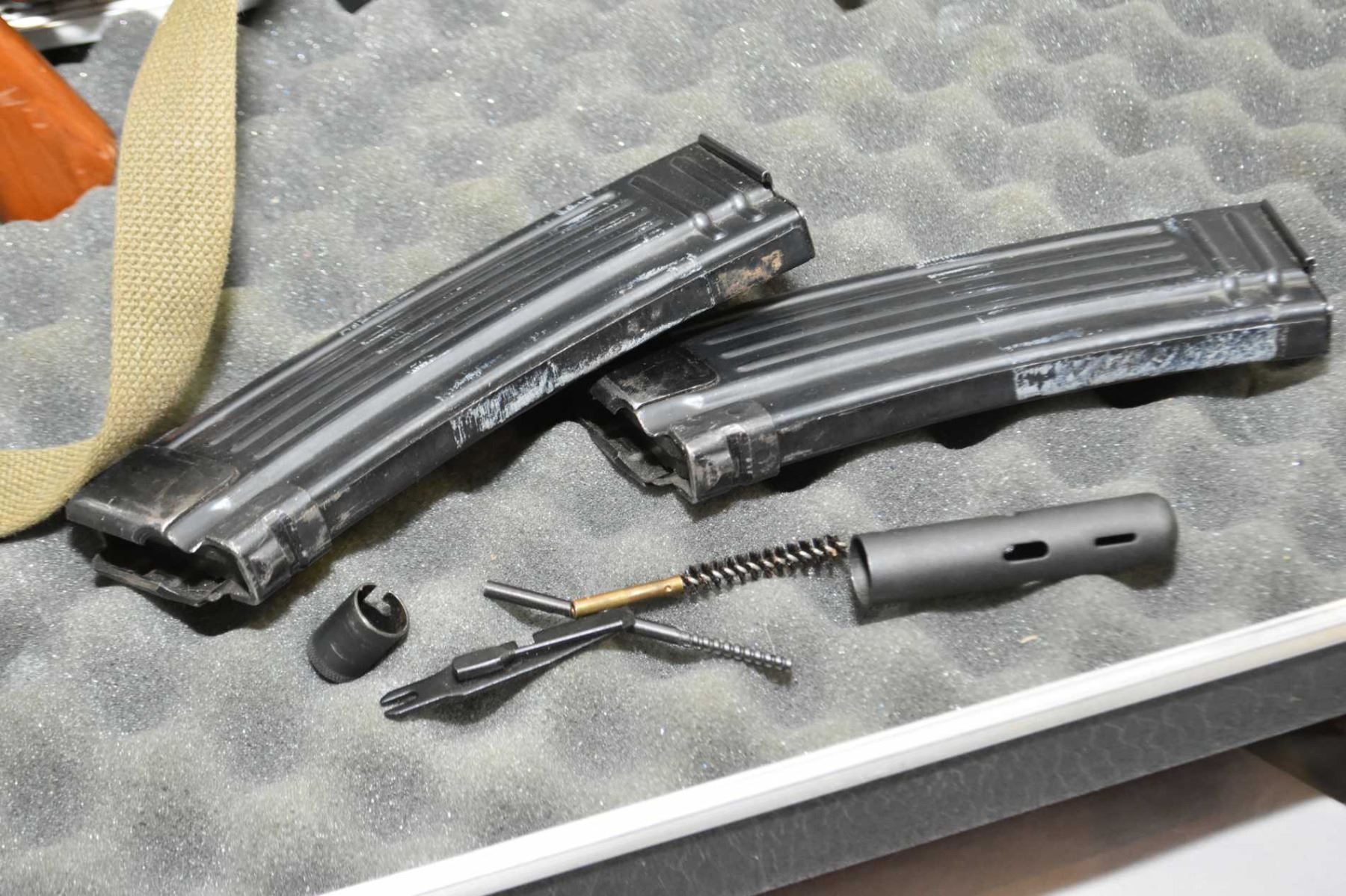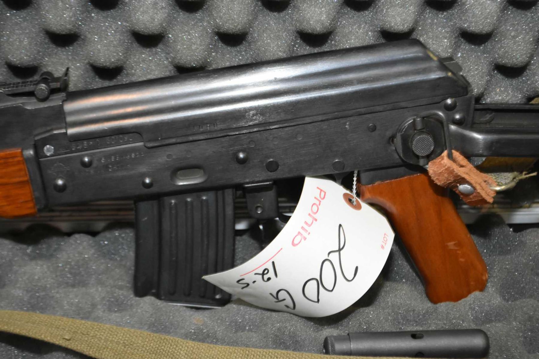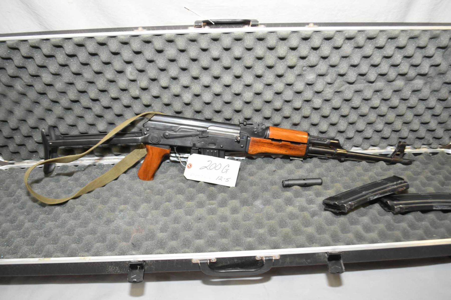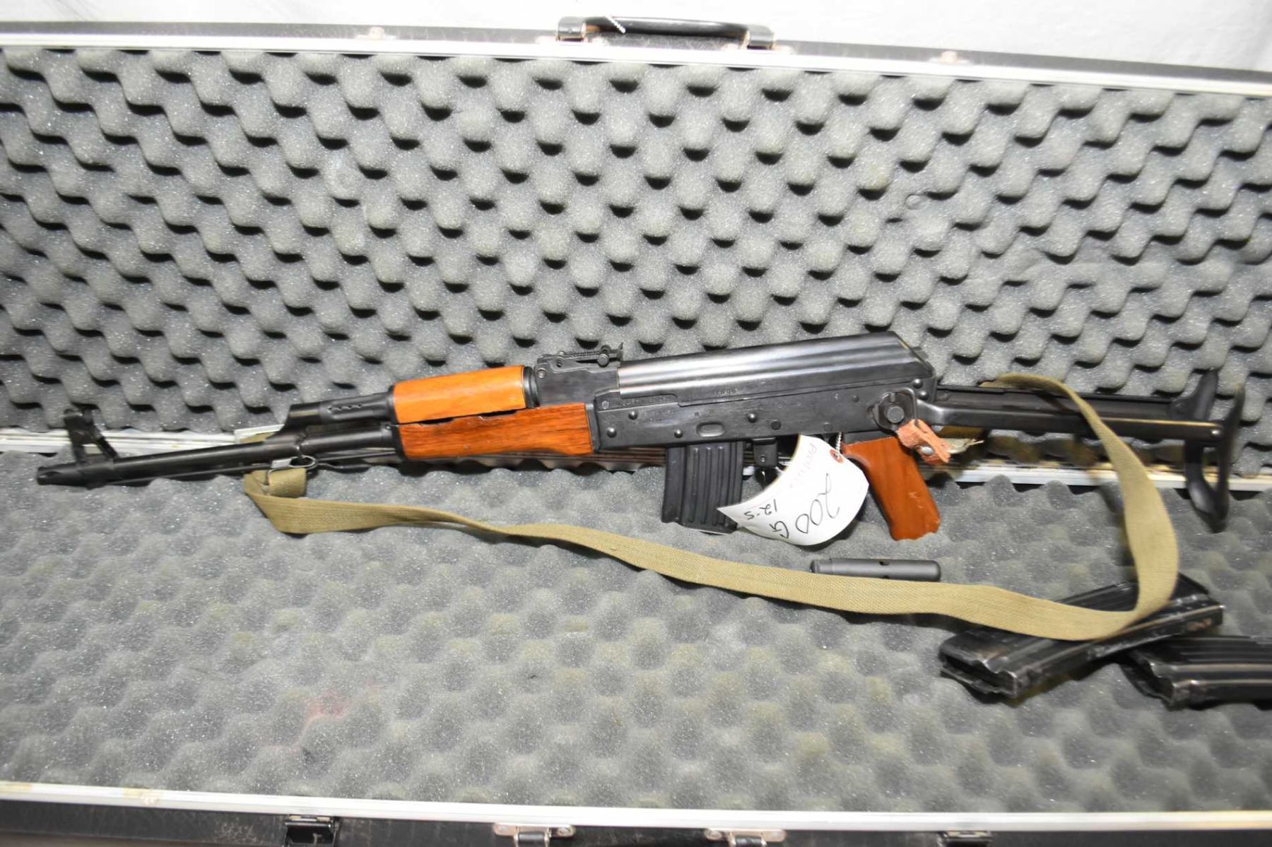 Norinco Model 84 S - 1 5.56 x 45 MM Cal 5 Shot Semi Auto Rifle w/ 483 mm bbl [ blued finish, wooden pistol grip, and forewood, folding metal butt stock, green web sling, c/w original 5 shot mag, and two larger pinned mags, also cleaning rod, and metal tube cleaning attachments, c/w foam lined black luggage style case ] Ser # 601090 Prohib 12 - 5 ( AKA Look a Like ) Cert # 6062799 FRT # 21117 - 9