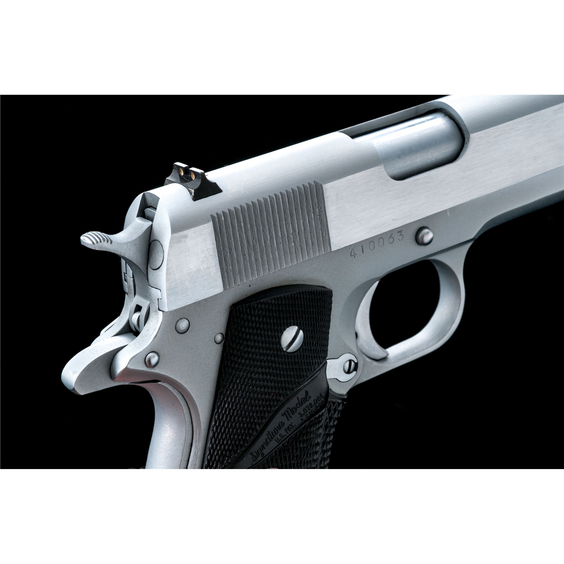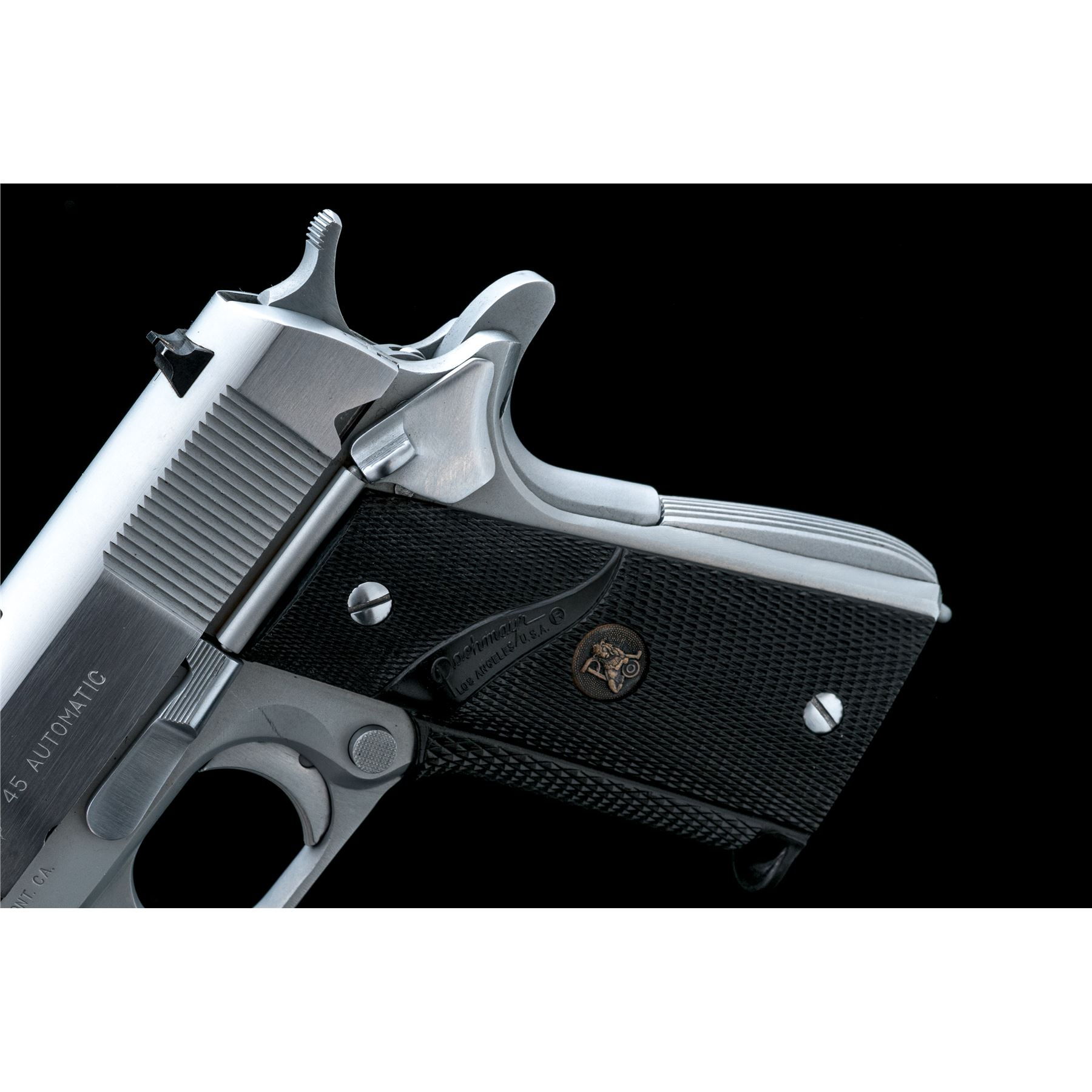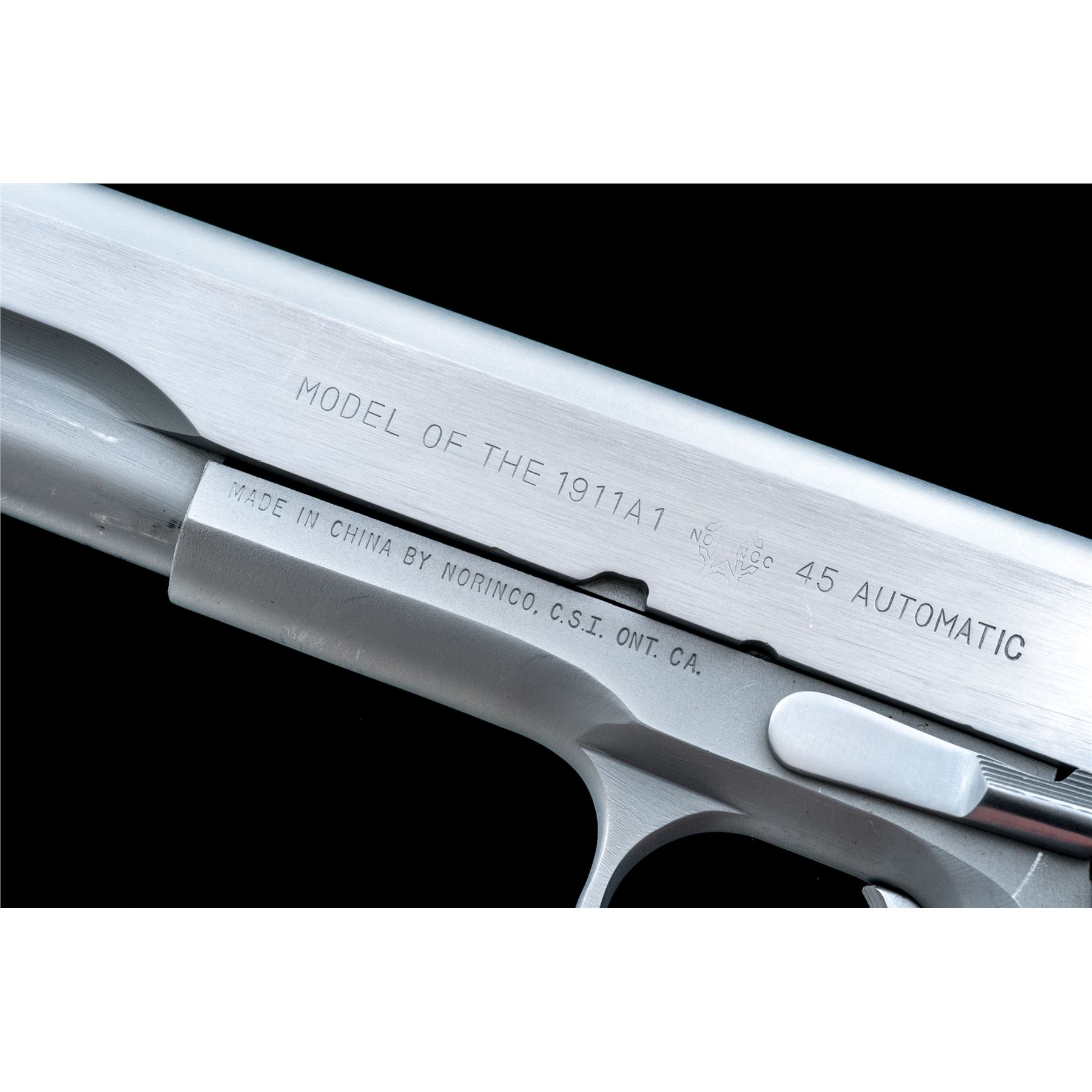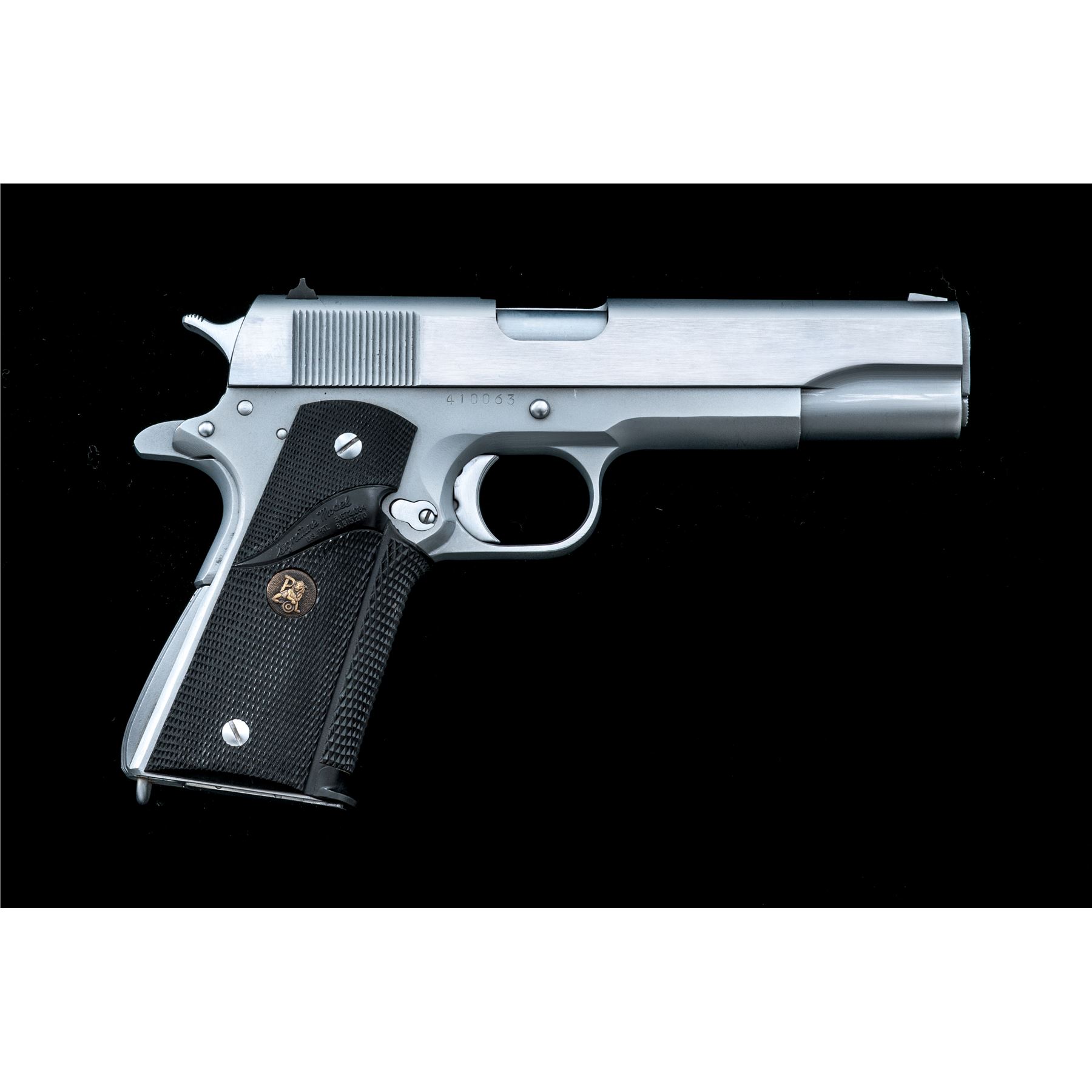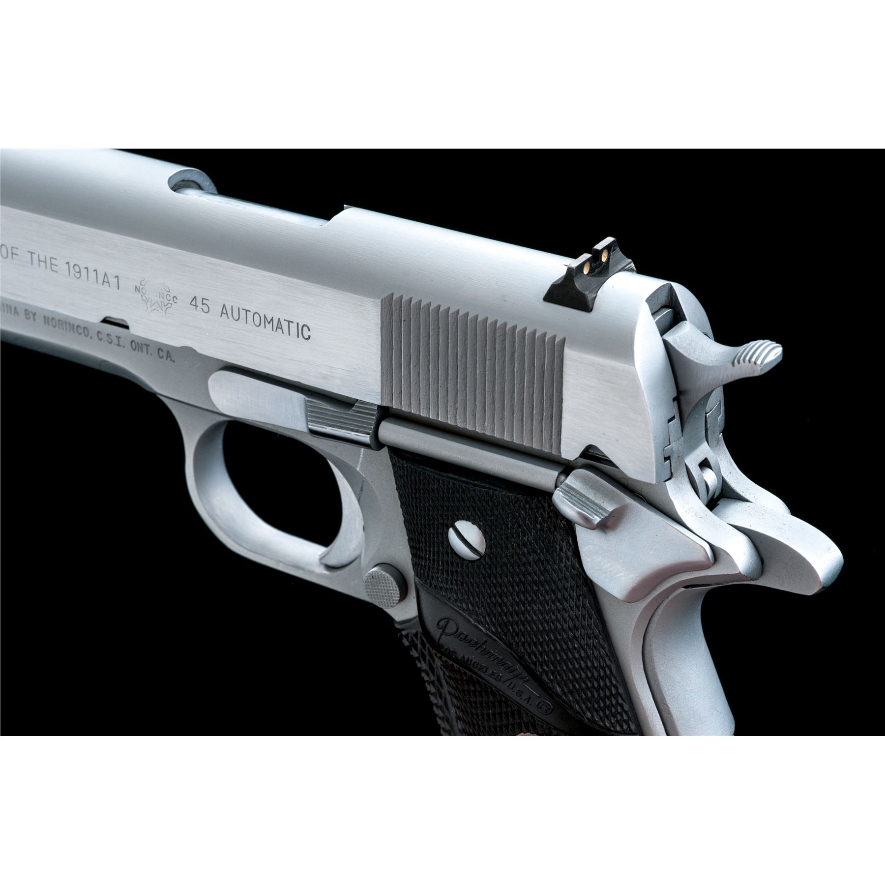 Norinco ''Model of the 1911-A1'' Semi-Automatic Pistol, #410063, .45 ACP cal., 5'' barrel, hard chrome finish, Pachmayr wraparound checkered rubber grips, arched mainspring with lanyard loop, three-dot sight system, with two (2) magazines and instruction sheet. Condition is excellent, showing little use. Est.: $500-$750. (Modern/PPT)
