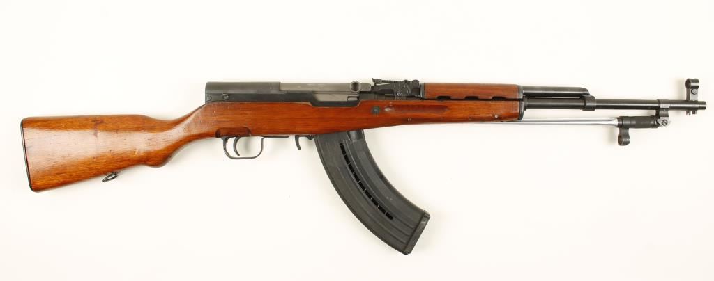 Chinese made blued semi-automatic rifle with a20" barrel, one FRP detachable high-capacity AK style magazine and a folding spike bayonet. Bluing has a few specks of bare metal and a few scratches on the trigger guard. The butt plate contains a cleaning kit. Wood has a different serial number stamped in it and many dings, rubs and scratches. Magazine is an aftermarket and has tape on the front edge to better fit the receiver. Bore is pristine with sharp rifling. Action works well. Condition is very good. *Modern Firearm*