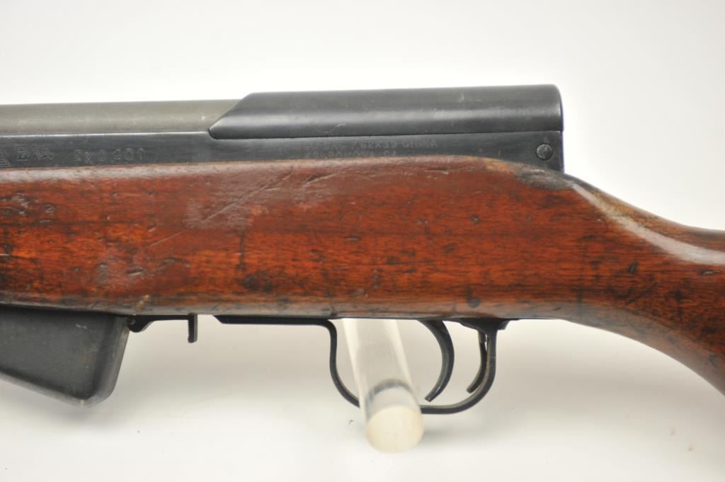 Norinco SKS semi-automatic rifle, 7.62 x 39 caliber, Serial #2X0401. The rifle is in good to nearly very good overall condition with a 20” barrel with a hooded front and military tangent style rear sights. Therifle is import marked on the left side of the action with all matching visible serial numbers. The smooth wood stock shows moderate to heavy use with the serial number on the left side of the butt stock, slingswivels and a period canvas military style sling. The bayonet has been removed. The bore is fair, the action functions and the markings are legible. The lot includes the original instruction manual. Est.:$300-$600. (Modern).