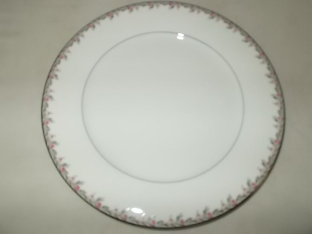 12* dinner plates 10 1/2". Pink flowers with gray & brown leaves Platinum trimmed edge