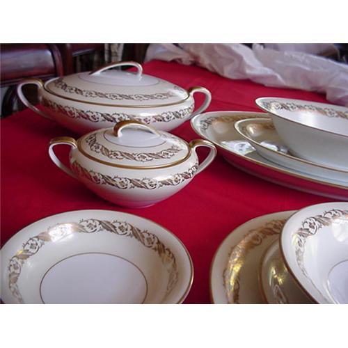 </font></strong>Gorgeous Noritake china, service for 12 with serving pieces. In nearly new condition. Cream and white with gold trim. 12 dinner plates, 12 salad plates, 12 berry bowls, 12 soup bowls, 11 bread and butter, 11 saucers, 4 cups, 1 round covered serving dish, 1 large 17" platter, 1 small 12" platter, 1 oval vegetable dish, 1 sugar bowl with lid, and gravy boat with attached underplate. Pre-1941 back stamp with family M.</font>