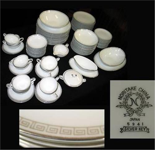Noritake China: Silver Key, platinum design. Service for 12. The following are chipped: 1 cup, 1 bowl, 1 soup bowl