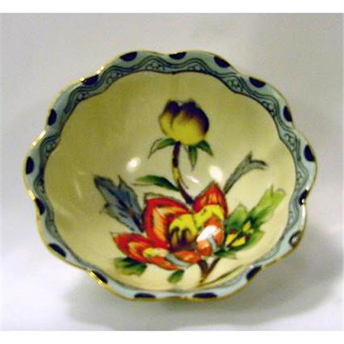 Wonderful Noritake footed Mayo or Whipped Cream Bowl. The center of the bowl has brightly colored flowers with a very, very pale yellow. The rim has an unusual border design in a gray blue background with black design.