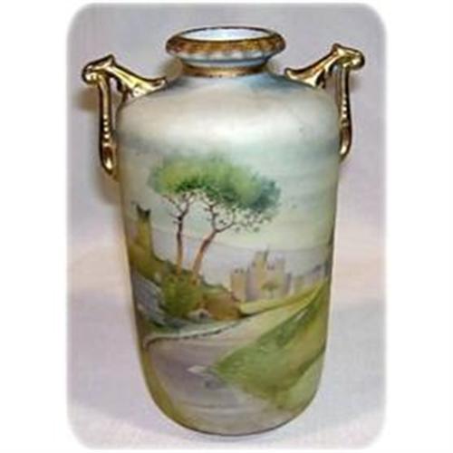 Antique Noritake Nippon vellum finish hand painted and gilt decorated vase using a soft color palette to depict a European ruins landscape scene with stone structures, winding dirt path, meandering river and lush green foliage. Artist has used a combination of heavy, brilliant and burnished gilding and jeweled beading as decorative accents. Urn shaped piece with two brilliant gold Corinthian column applied handles. Superbly applied gold bead motif is delicate, yet elegant.<p>Condition is rated as Very Good. Gilding and beaded accents are 99% intact with no evidence of cracks, chips or crazing stains. Age related rub wear on base. Noted: Near the bottom of the vase, it is our belief that a section of the grass knoll has been professionally re-touched. The use of a color wash of matching green in satin finish now gives, in contrast to the vellum, the appearance of a pond or lake. It does not detract from the pictorial scene, but must be noted. Photo provided.<p>Bears the green Hand Painted 'M' in Laurel Wreath Nippon #47 mark, ca 1911. Measures 9 inches high with a 4.5 inch diameter.<p>
