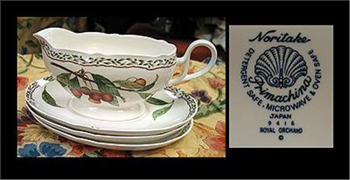Noritake Royal Orchard Gravy Boat with three underplates, no chips or cracks