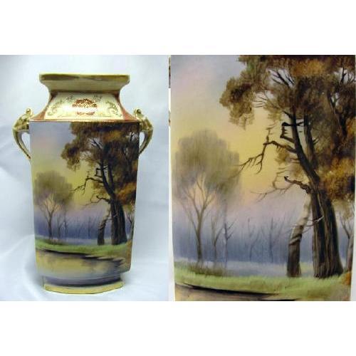 Absolutely gorgeous Noritake 9-1/2" scenic vase with elephant handles. Tranquil trees alongiside a lake, the scene continues all the way around the vase which is 4-1/2" wide by 2-1/4" deep.