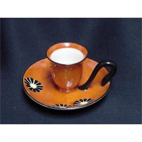 Beautiful Noritake Toki Kaisha Chamberstick in vibrant orange with black/yellow flowers and a black handle. This is so small, I am not sure if it is for a child's set or not. I have never seen a full size chamberstick this small.