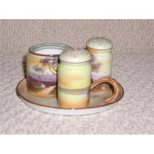 Noritake Vintage Condiment Set. Tray has handle and indentures for three condiment jars. Very decorative. Good condition with no chips or cracks.